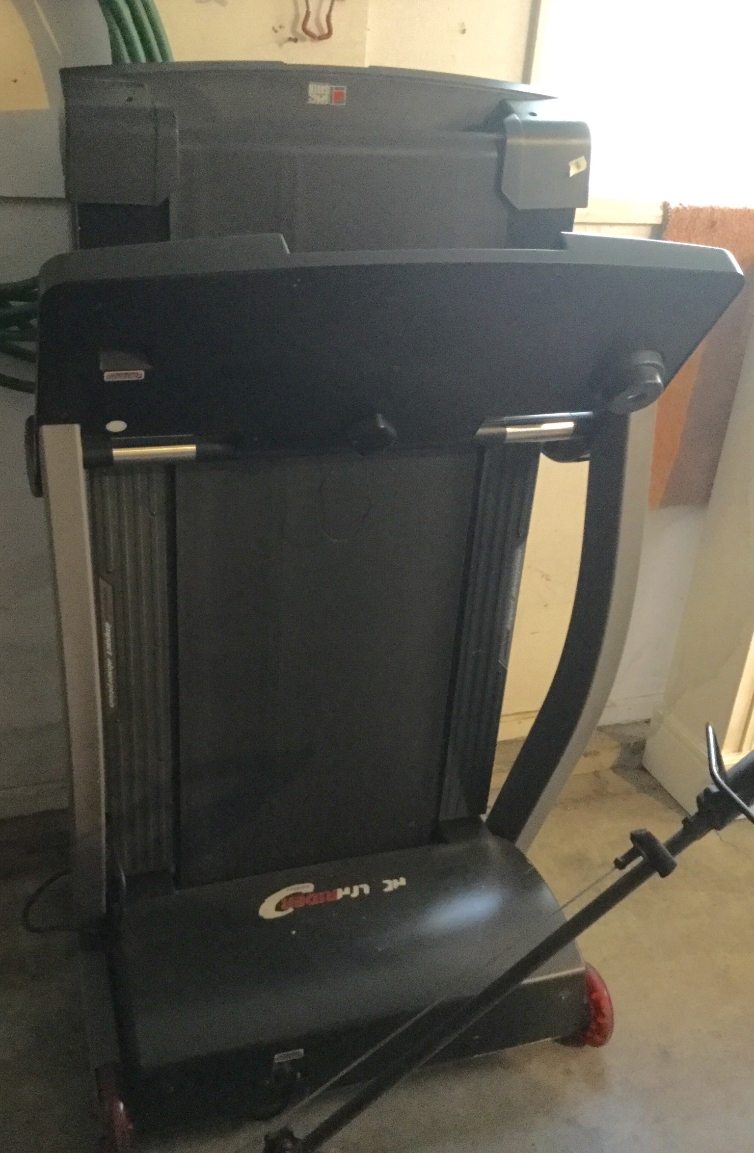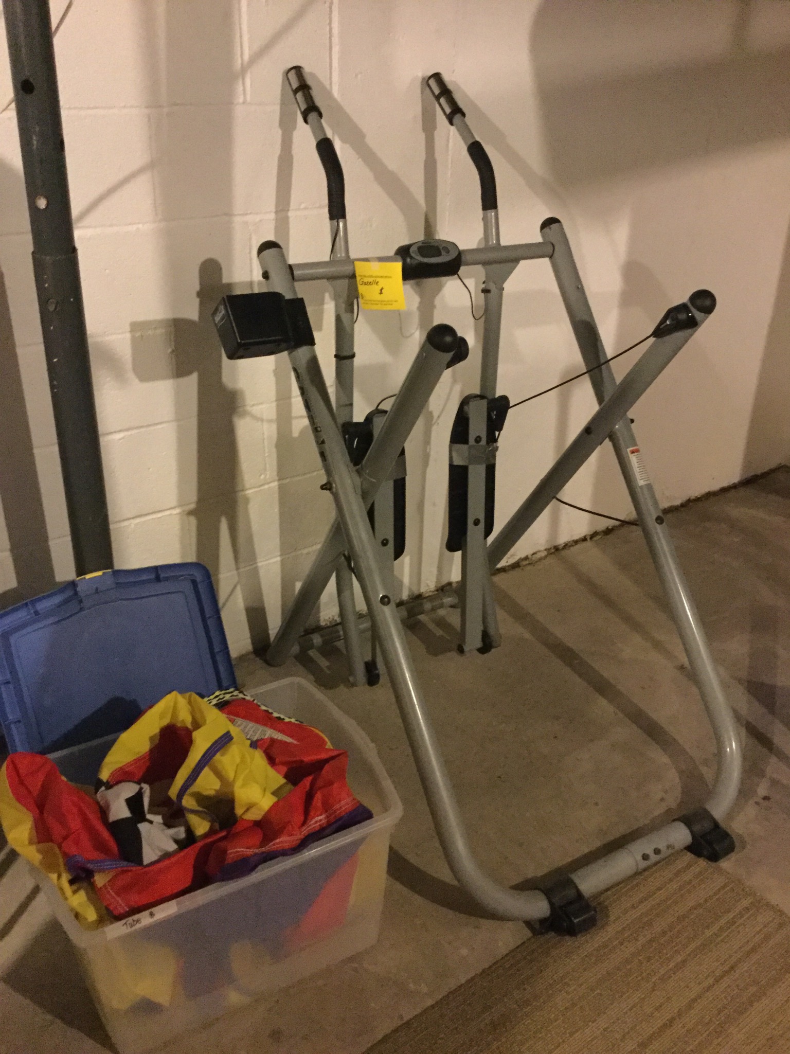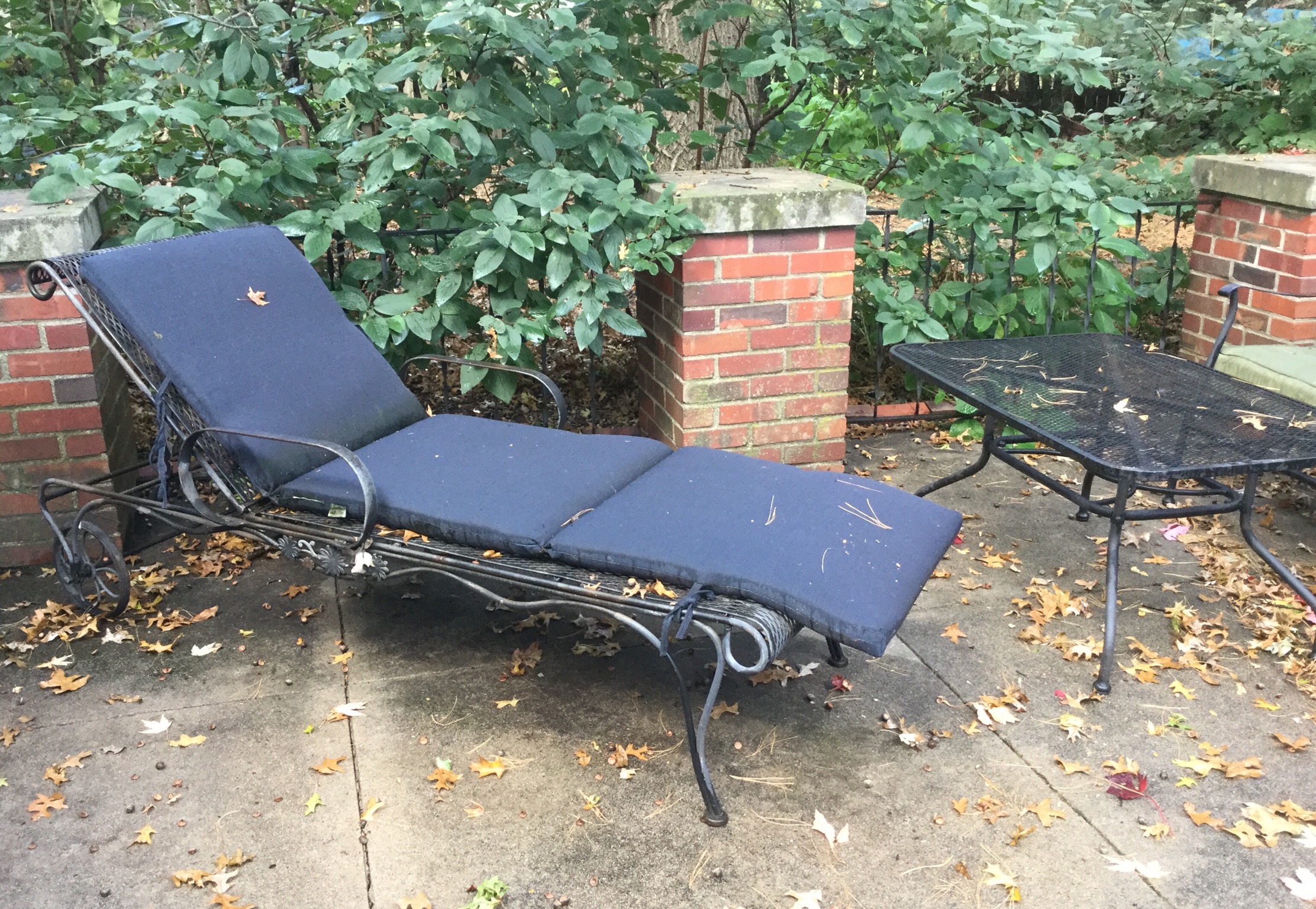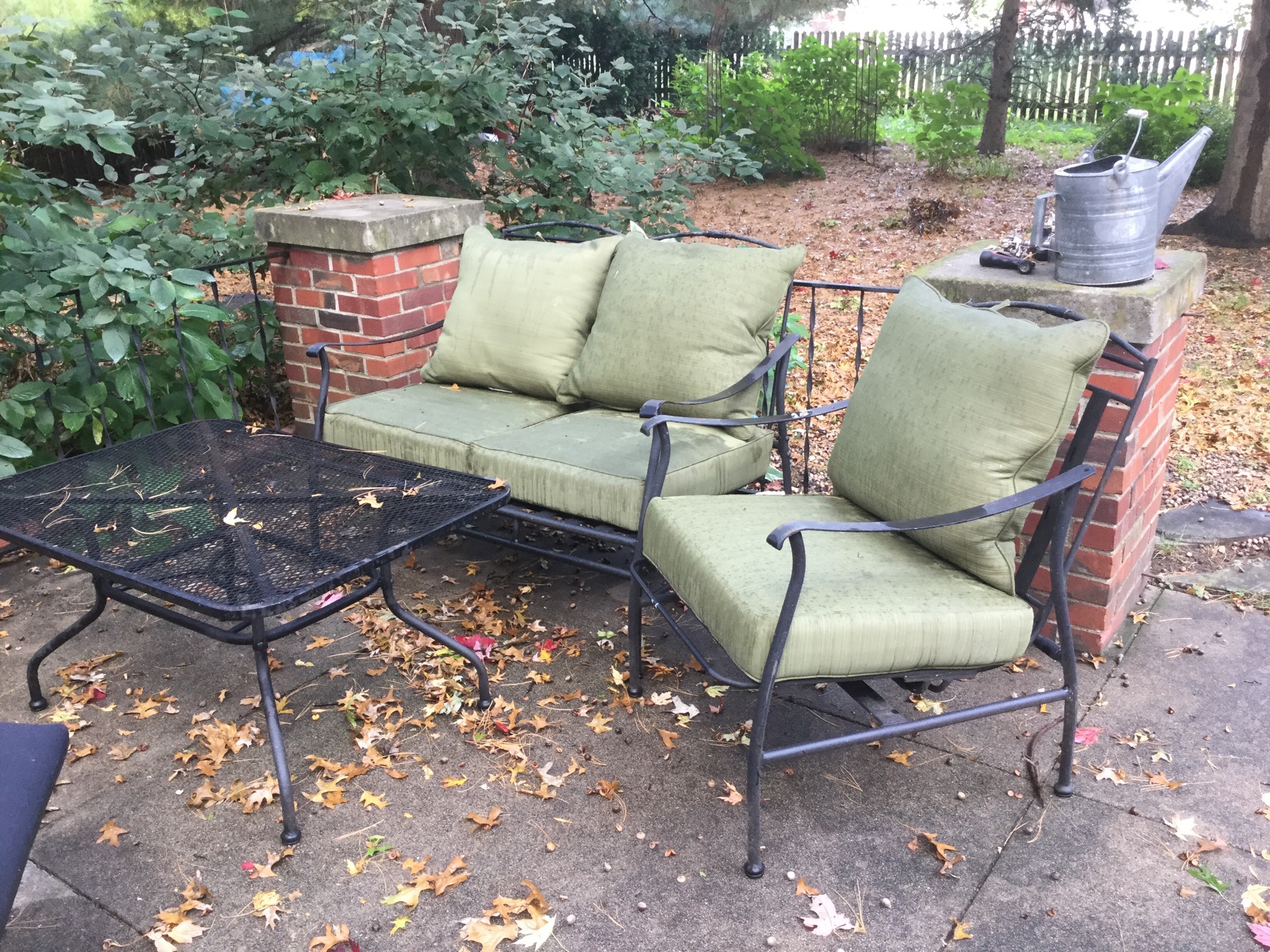 Wrought iron lounger, loveseat, chair and table, wheelbarrow, firepit, Christmas tree (its almost that tiiiime!), Space Saver Health Rider treadmill, Craftsman gas blower/mulcher, a white deep freezer …