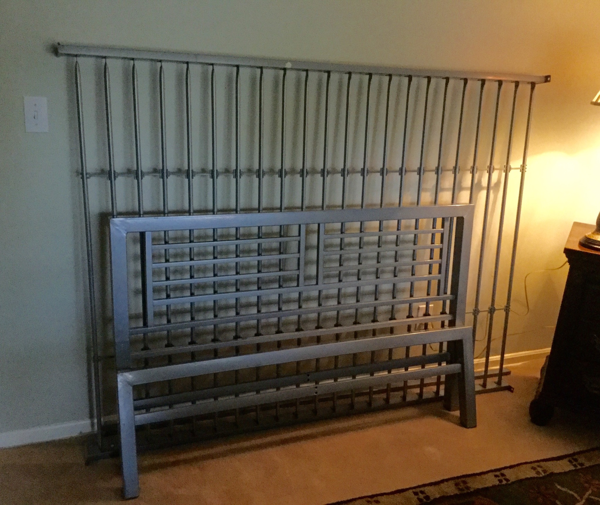 2 LARGE decorative wall art pieces, Ab Master and Gazelle, 5 nice 5-shelf shelf units, rubber-back carpet squares, a few medium work tables, full size grey metal bed, wicker lounger, Poole 5 pc Tea Set …