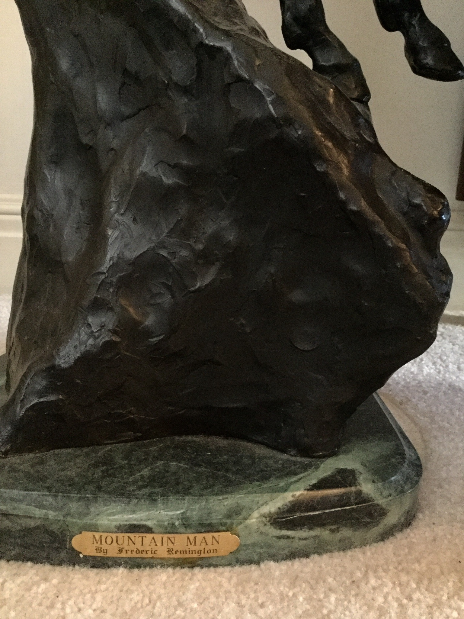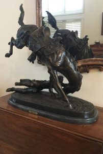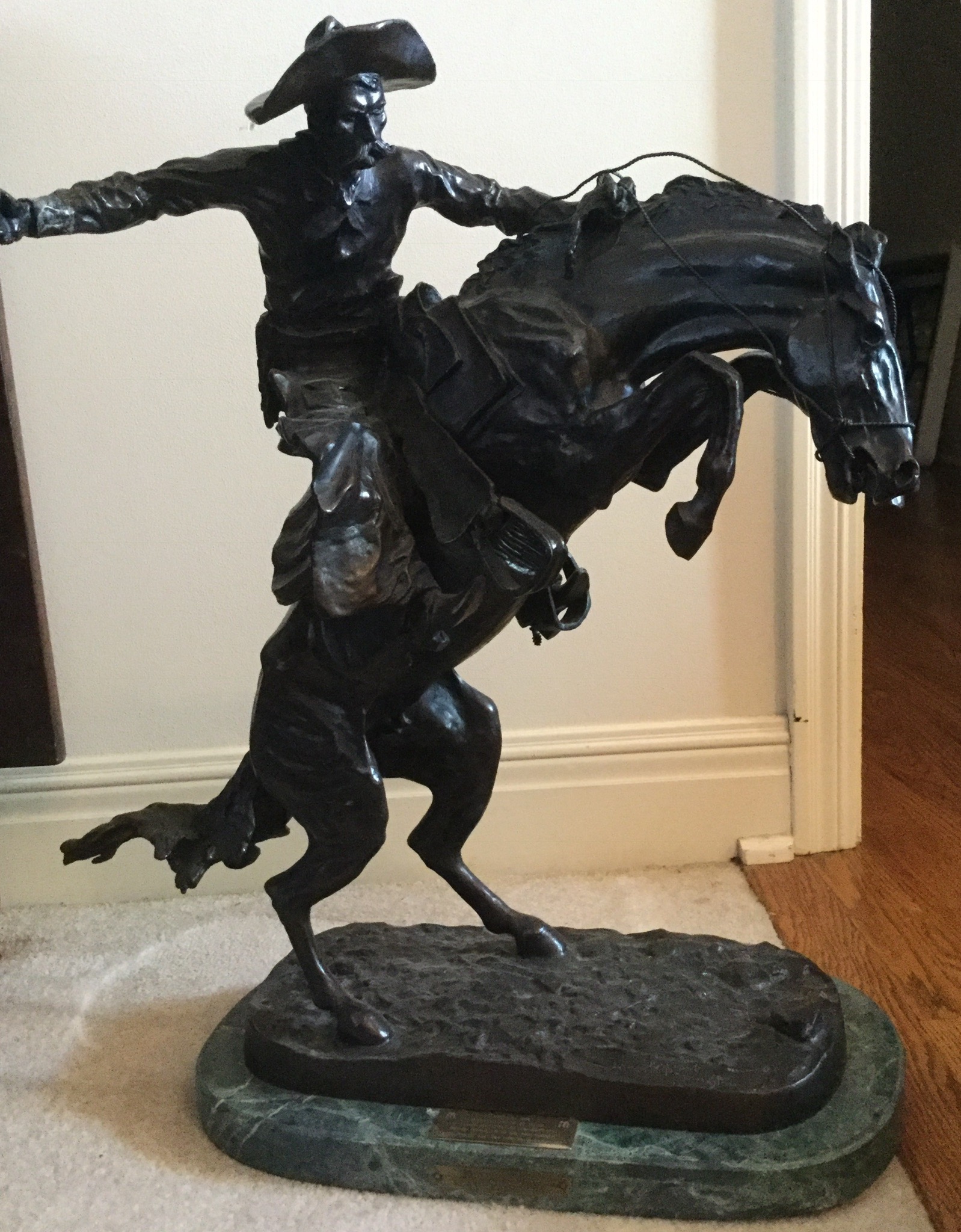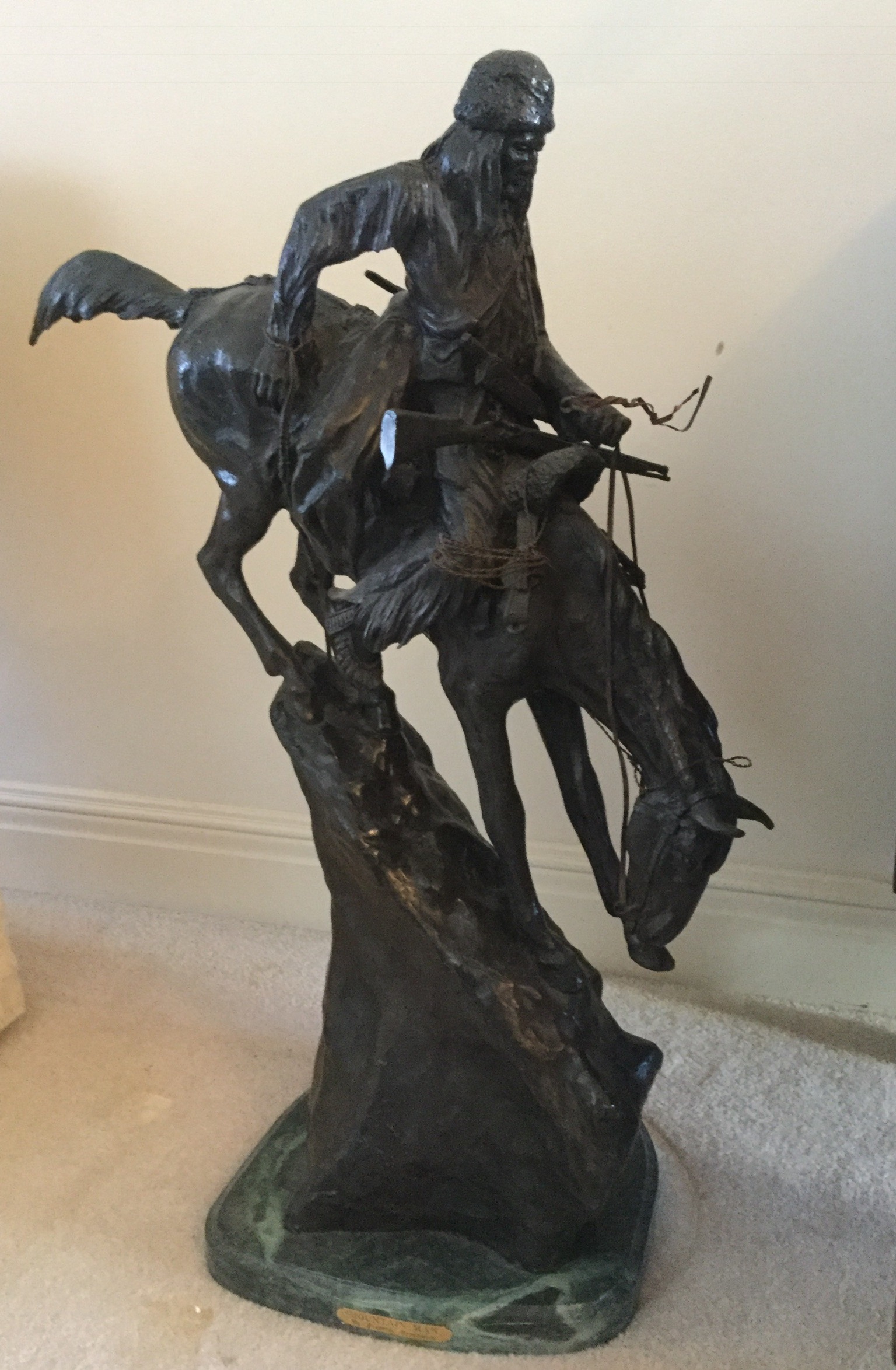 3 Remington bronzes (1 large, 2 medium) Wicked Pony, Mountain Man & Bronco Buster, terrific selection of nice bookshelves including Hooker, butcher block kitchen island, Sterling Silver flatware, wicker/rattan sofa and pair of matching chairs …