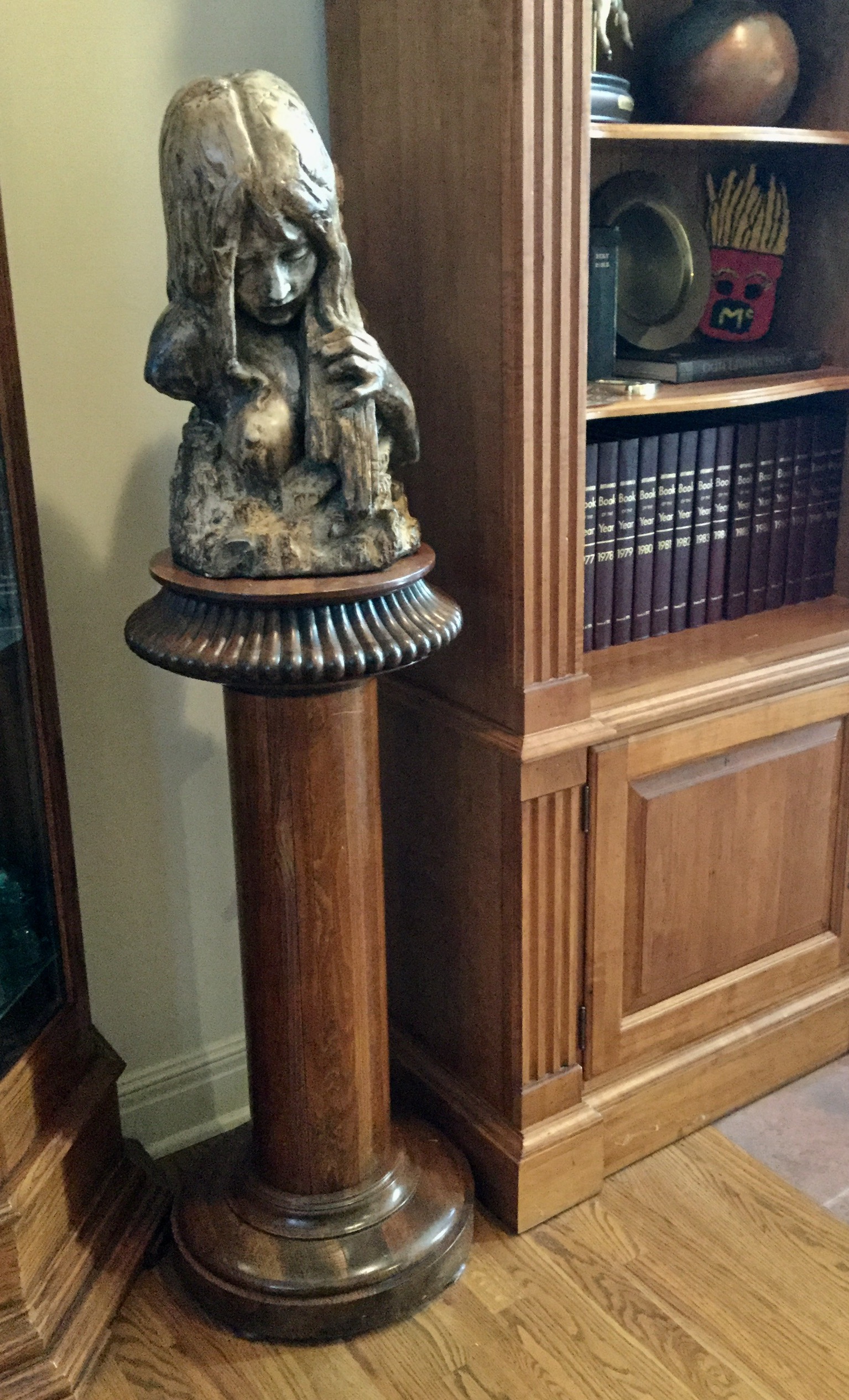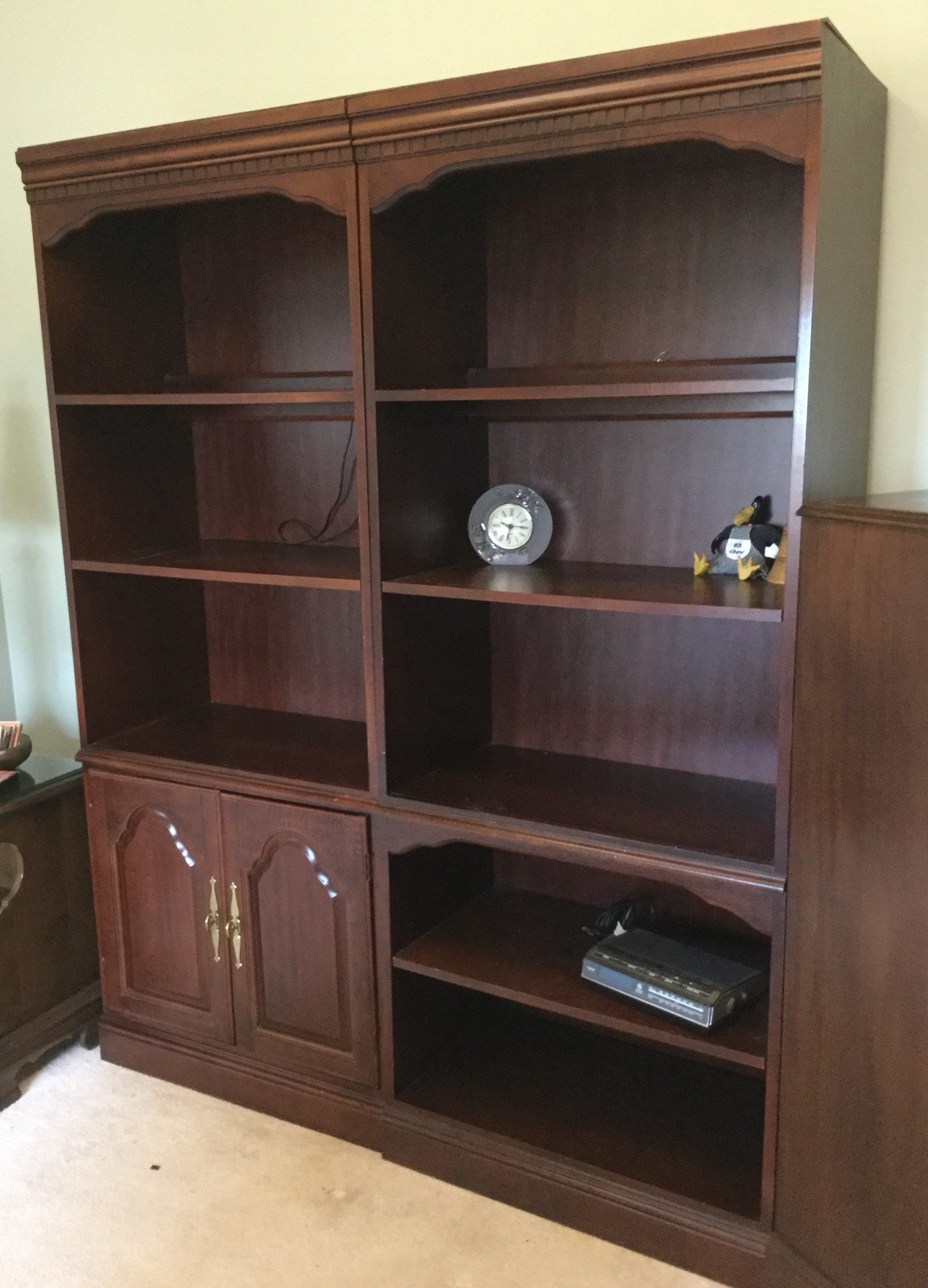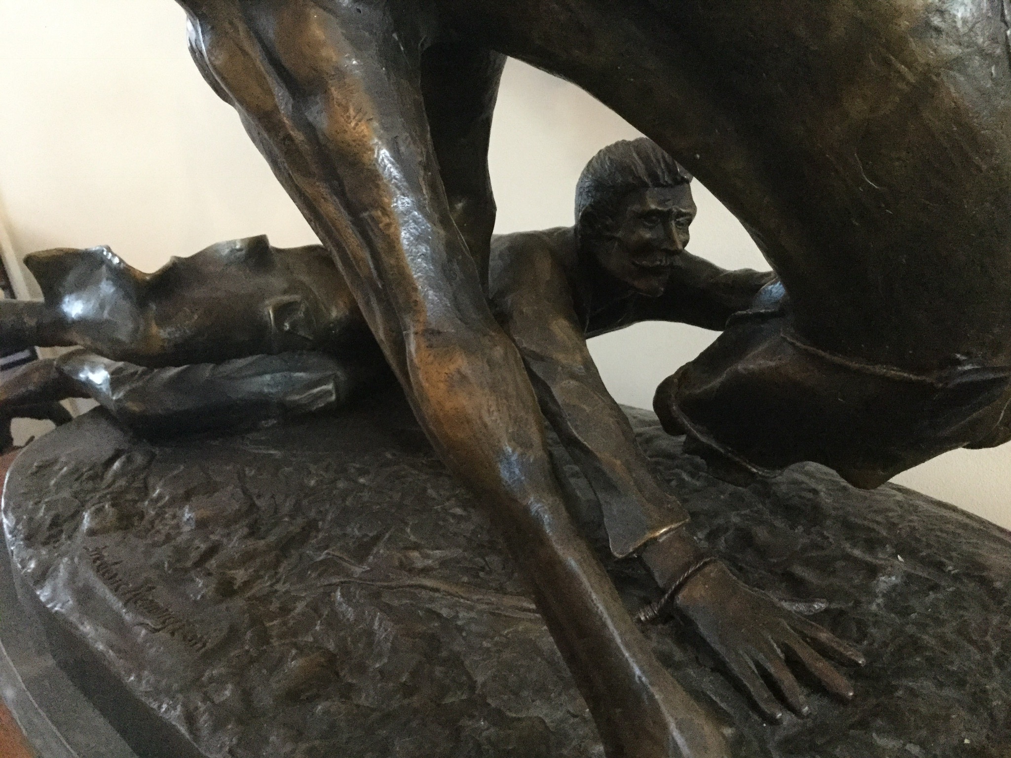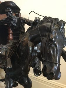 3 Remington bronzes (1 large, 2 medium) Wicked Pony, Mountain Man & Bronco Buster, terrific selection of nice bookshelves including Hooker, butcher block kitchen island, Sterling Silver flatware, wicker/rattan sofa and pair of matching chairs …