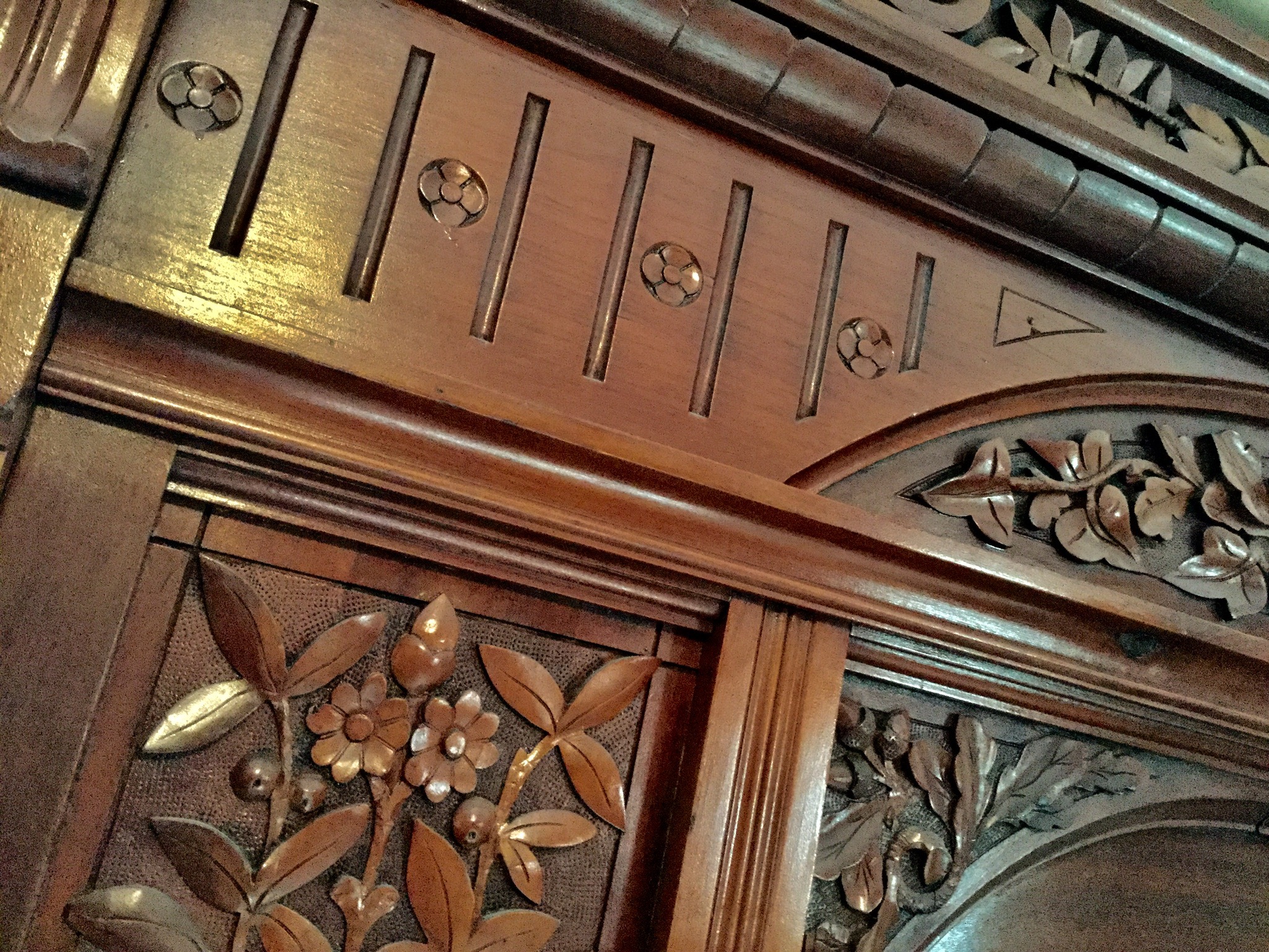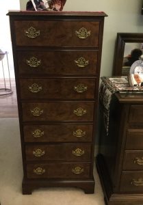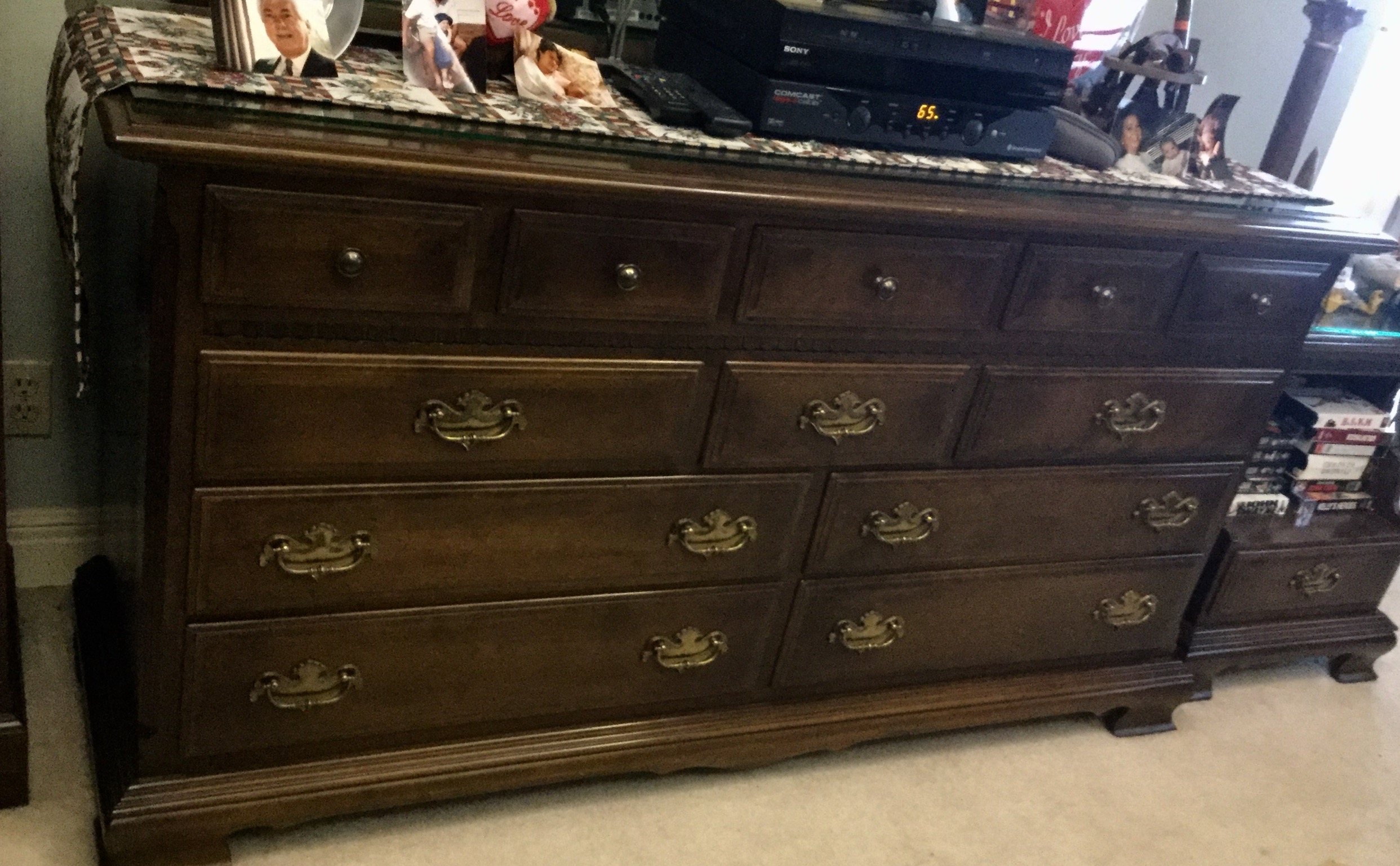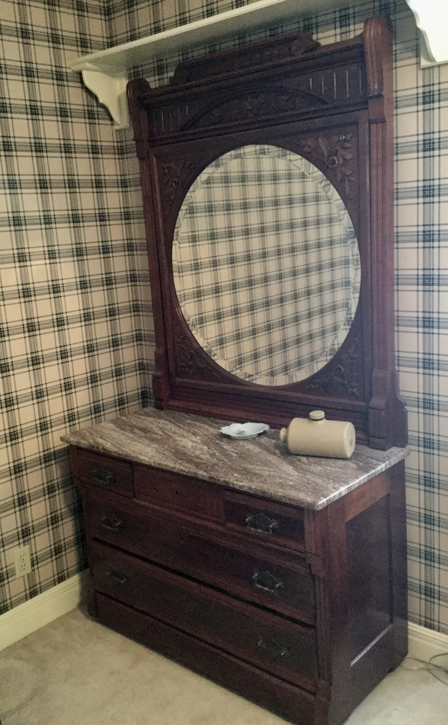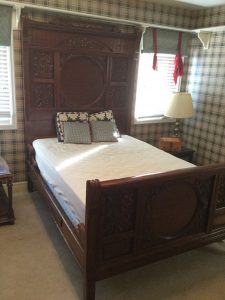 Hickory lingerie chest, the most stunnnning antique carved wood full size bed (with mattress) with 2 high-back matching chests w beveled mirrors and marble tops, a so-unique curved wood seat/chair …