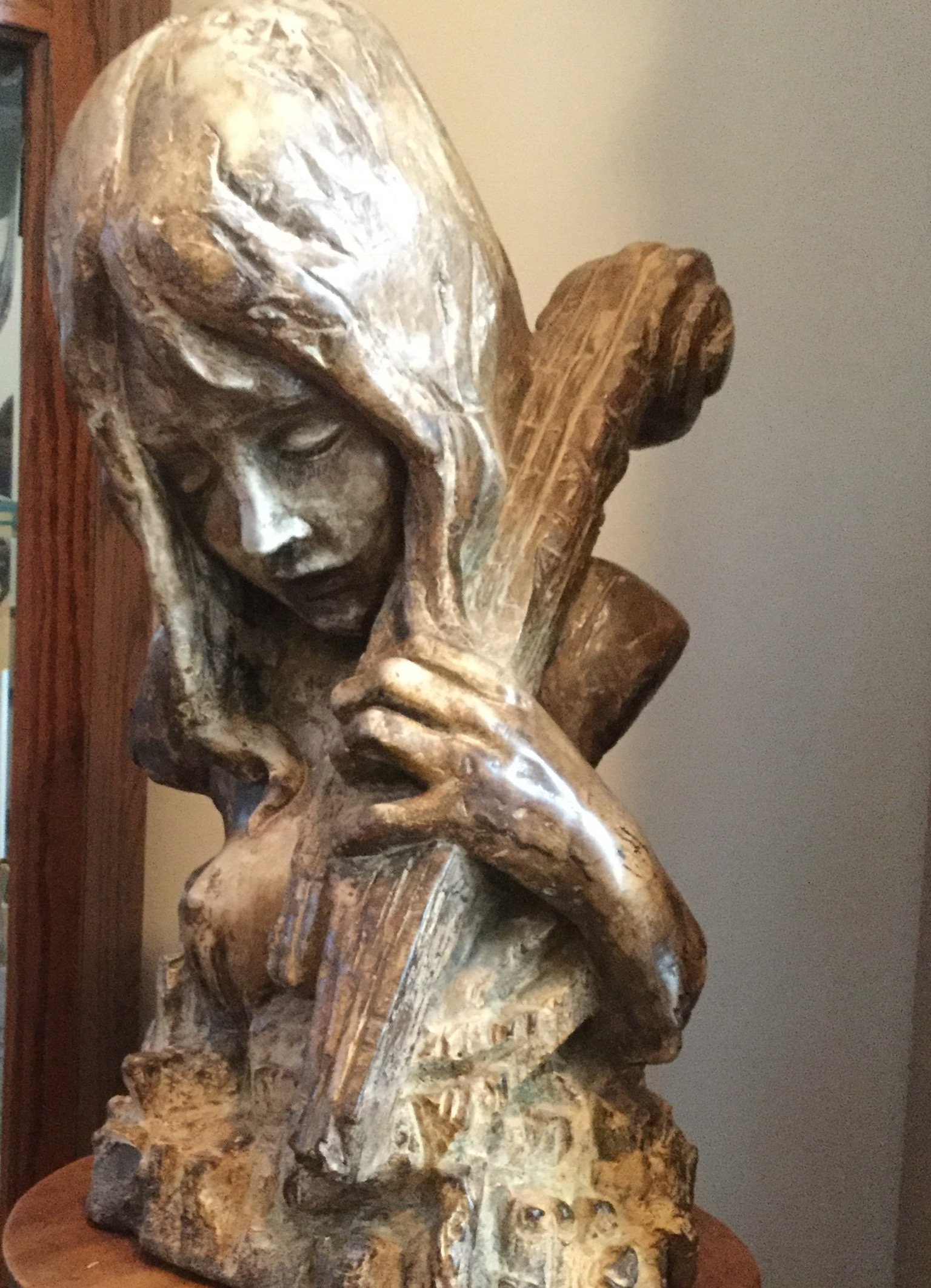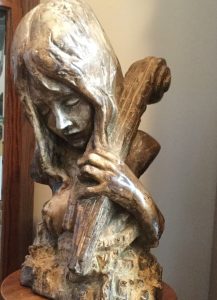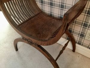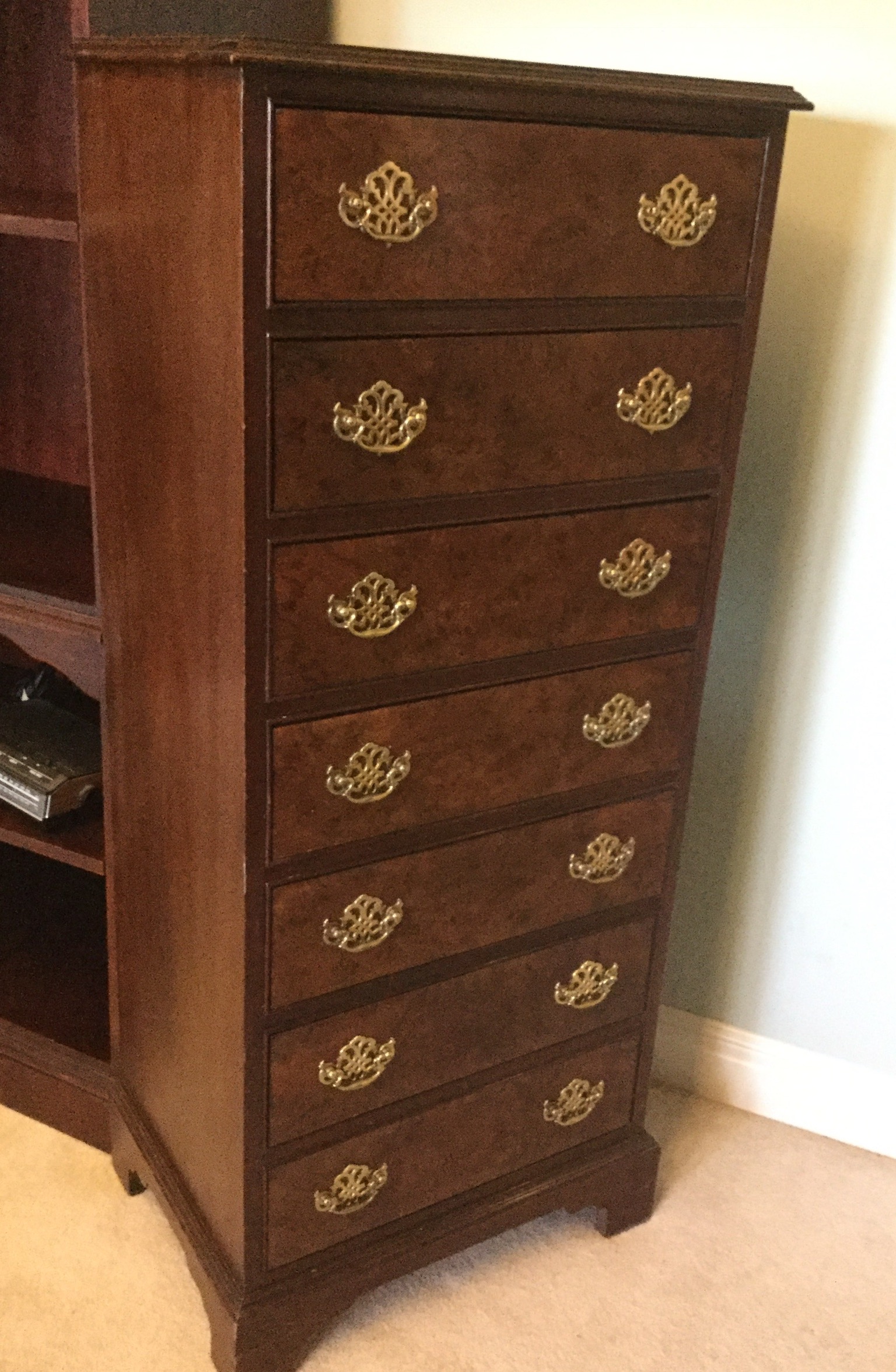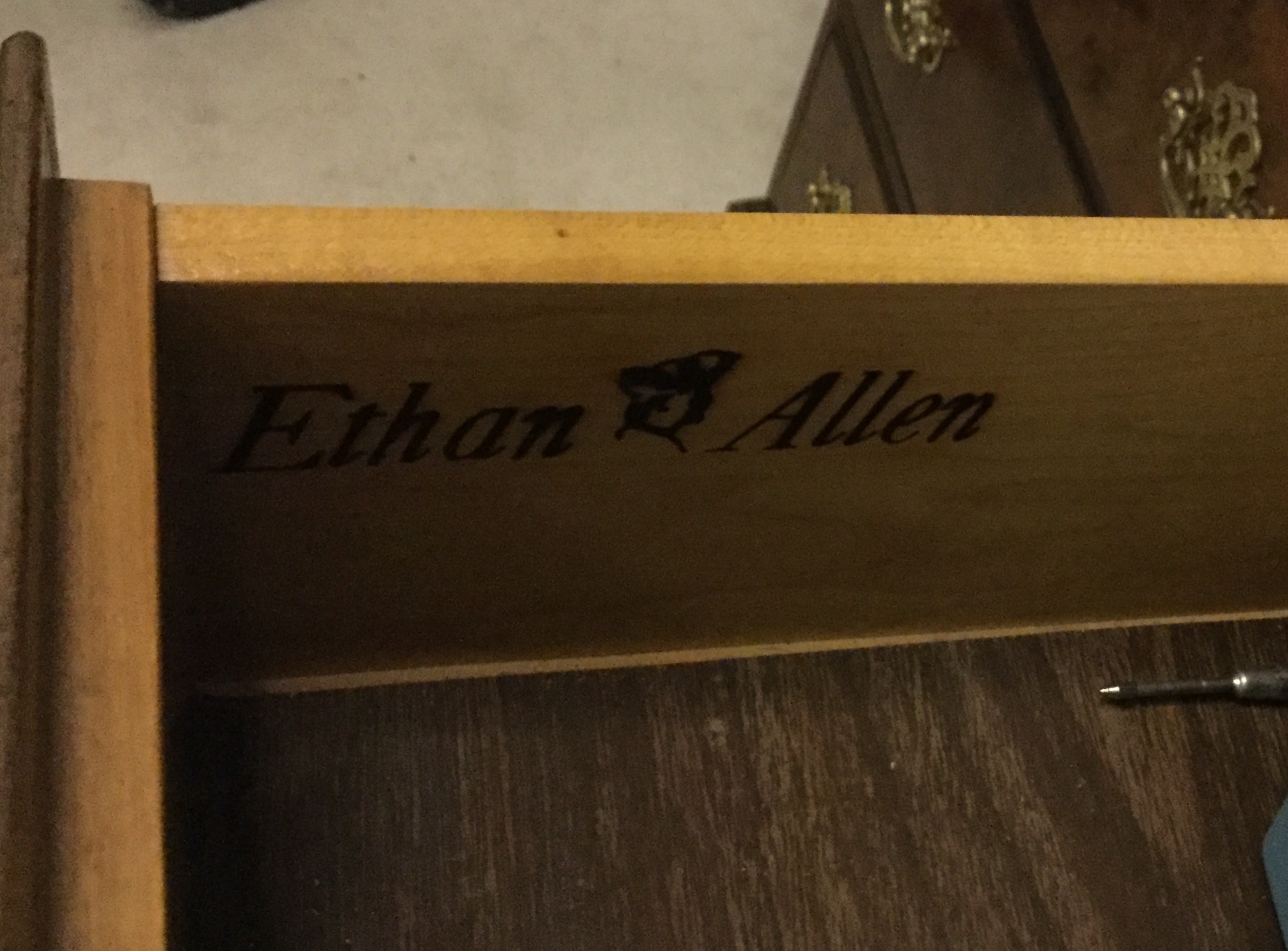 Hickory lingerie chest, the most stunnnning antique carved wood full size bed (with mattress) with 2 high-back matching chests w beveled mirrors and marble tops, a so-unique curved wood seat/chair …