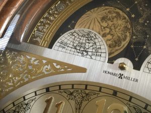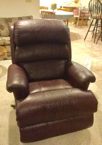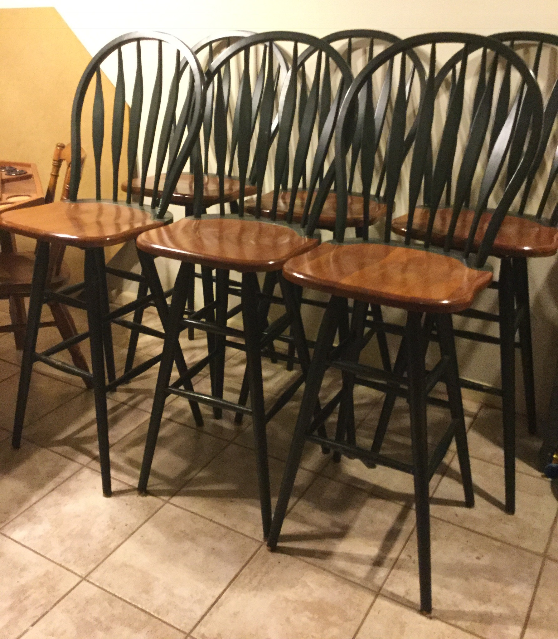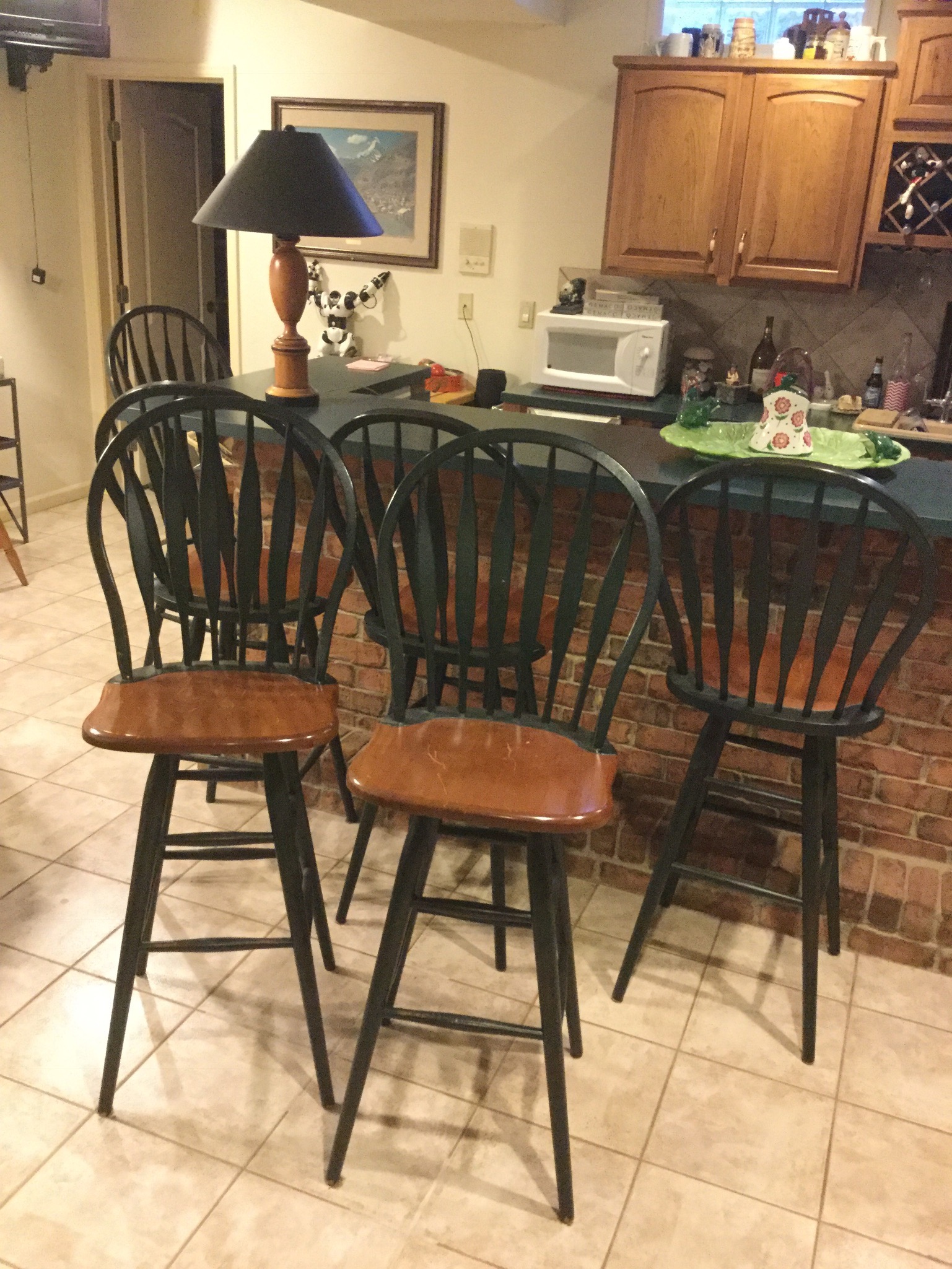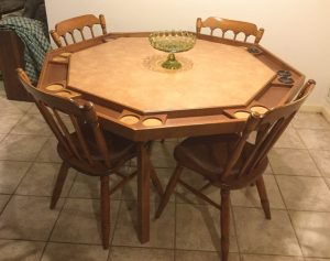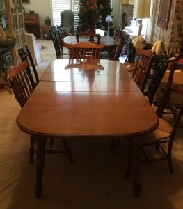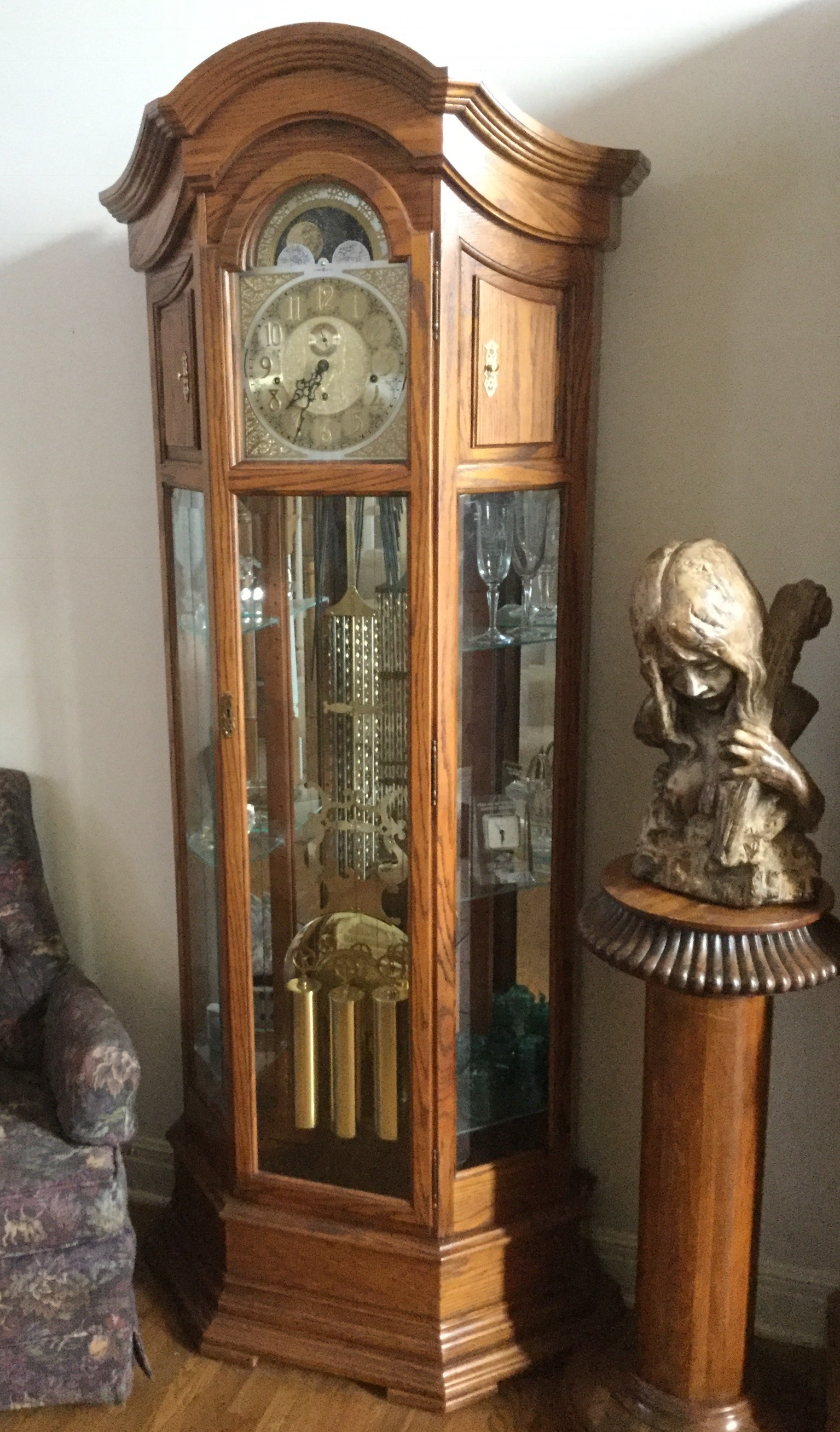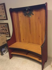 6’ high back oak 3-seat bench, leather rocker-recliner, set of 6 slat-back bar stools, light wood sideboard with top hutch, super-cool game table (w cup holders!) and 4 spindle-back chairs, Howard Miller grandfather clock …