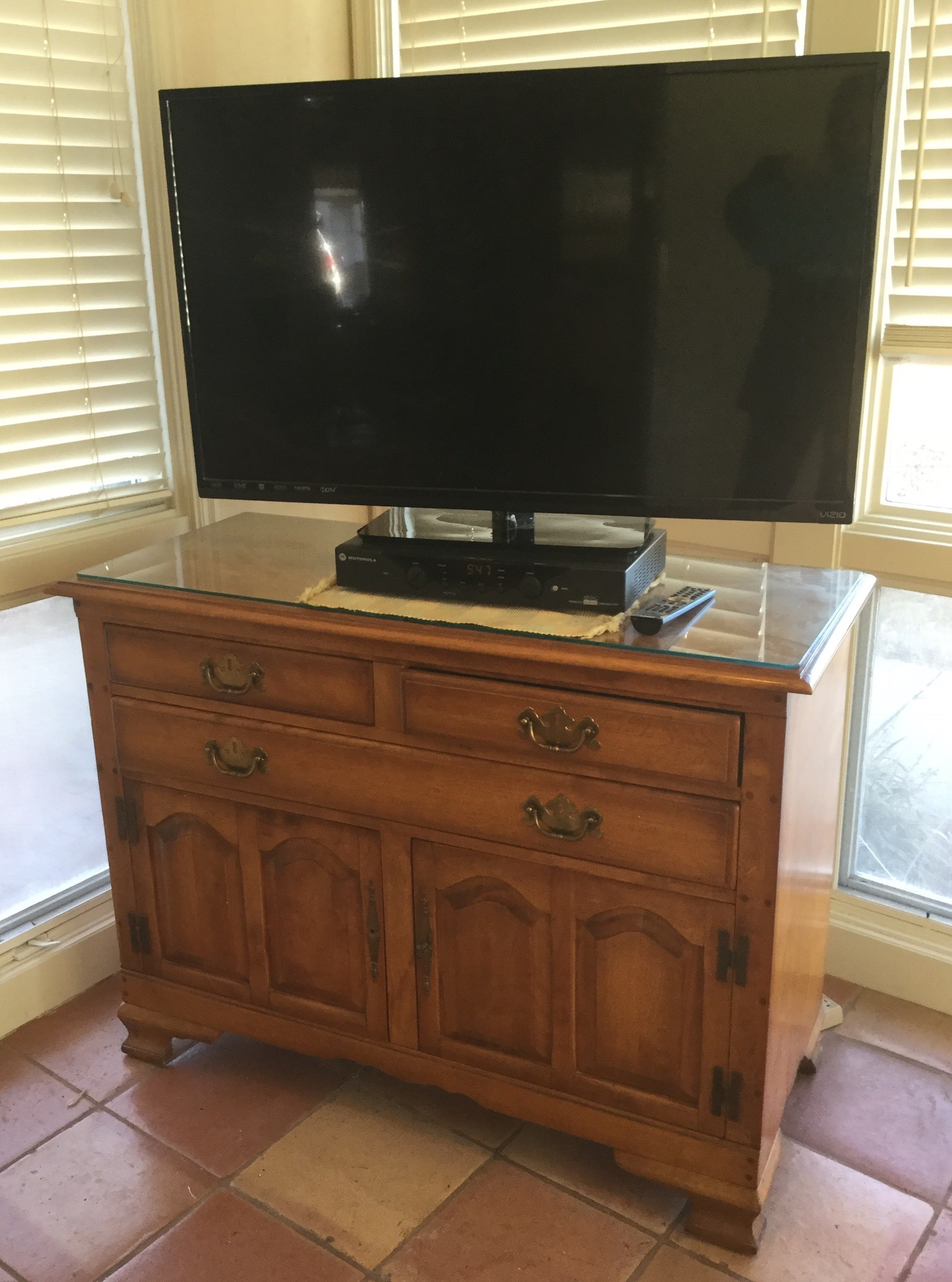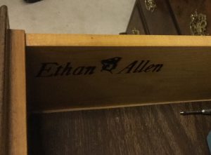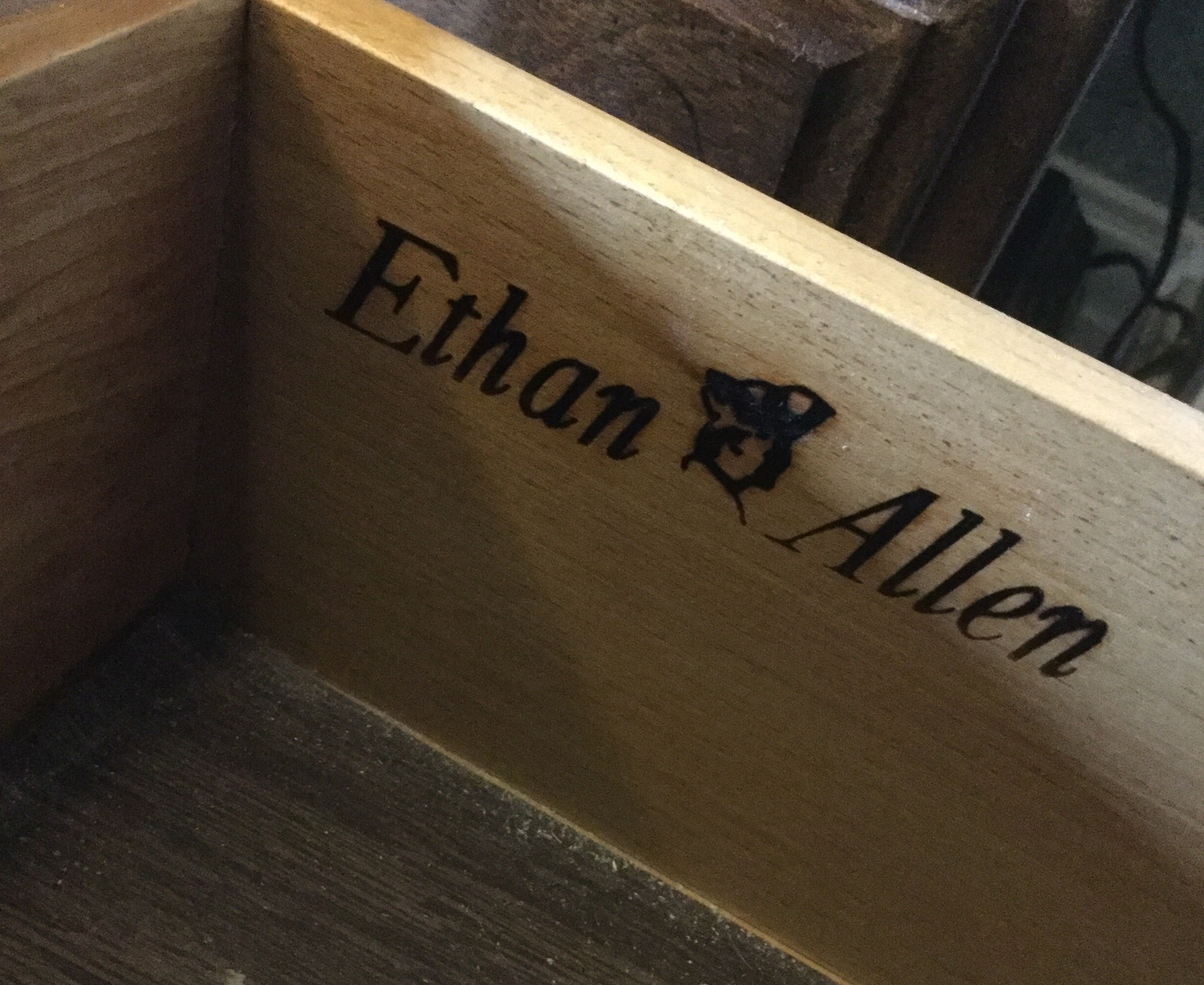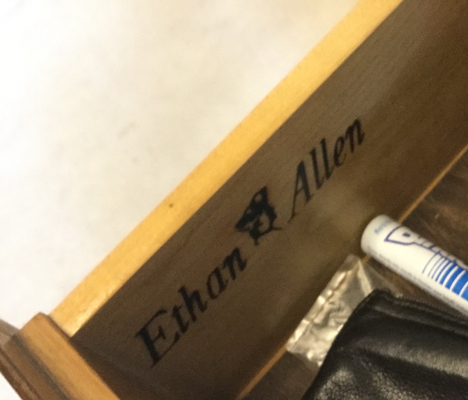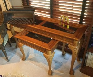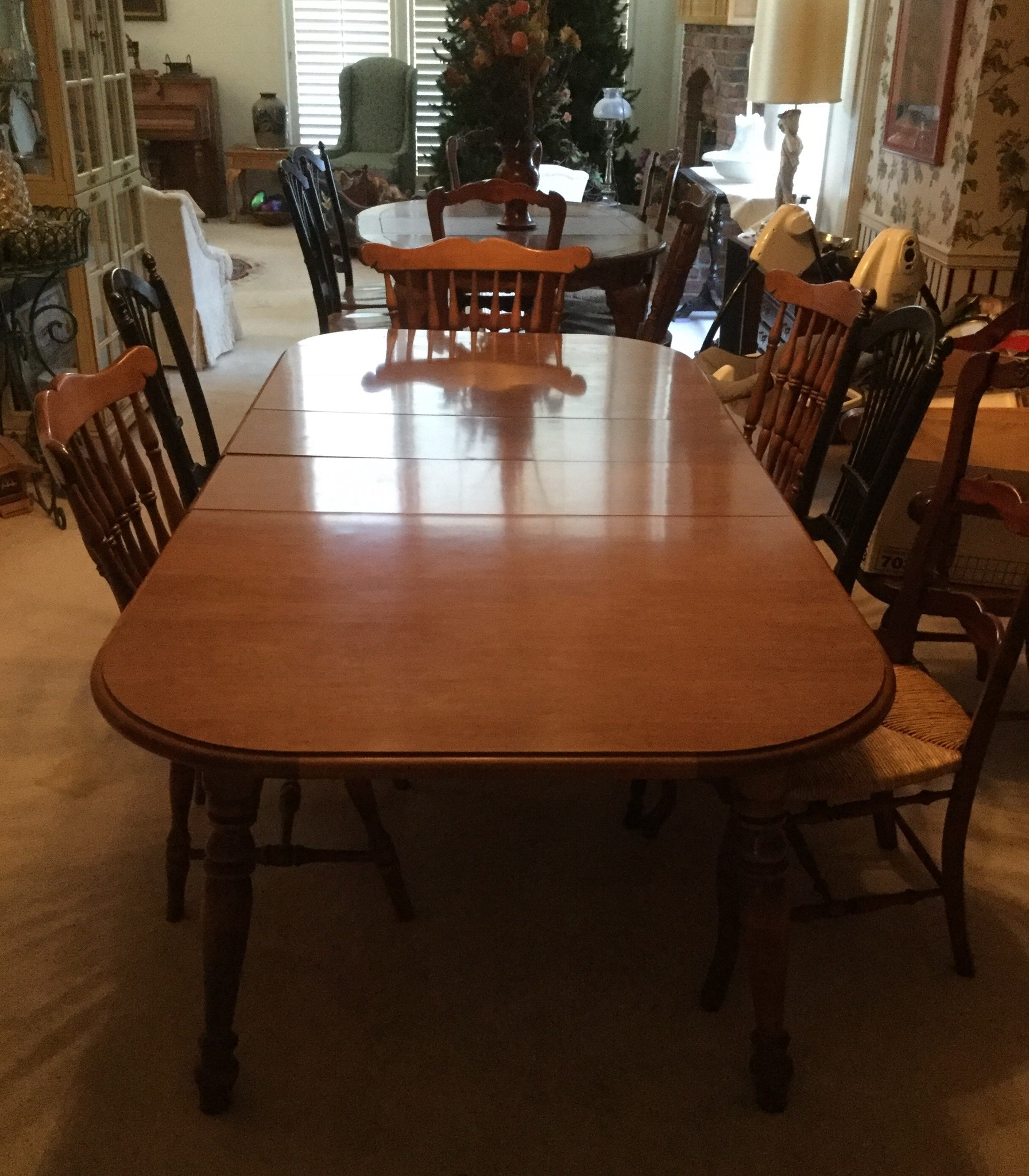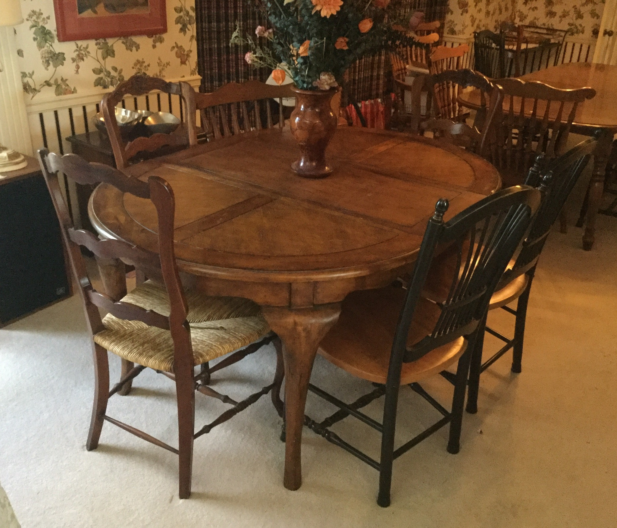 Cream 3pc glass front hutch, several dining tables, 4 sets of dining chairs, cream glass front curio, 4 drawer buffet chest, many unique side and wall tables, pair of eggshell club chairs, Ethan Allen dresser w mirror and matching side tables …