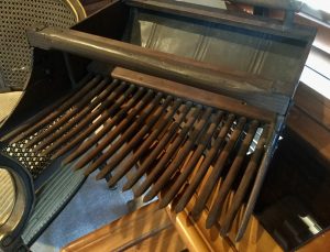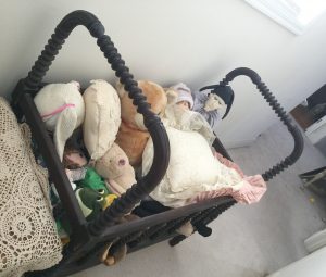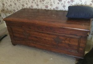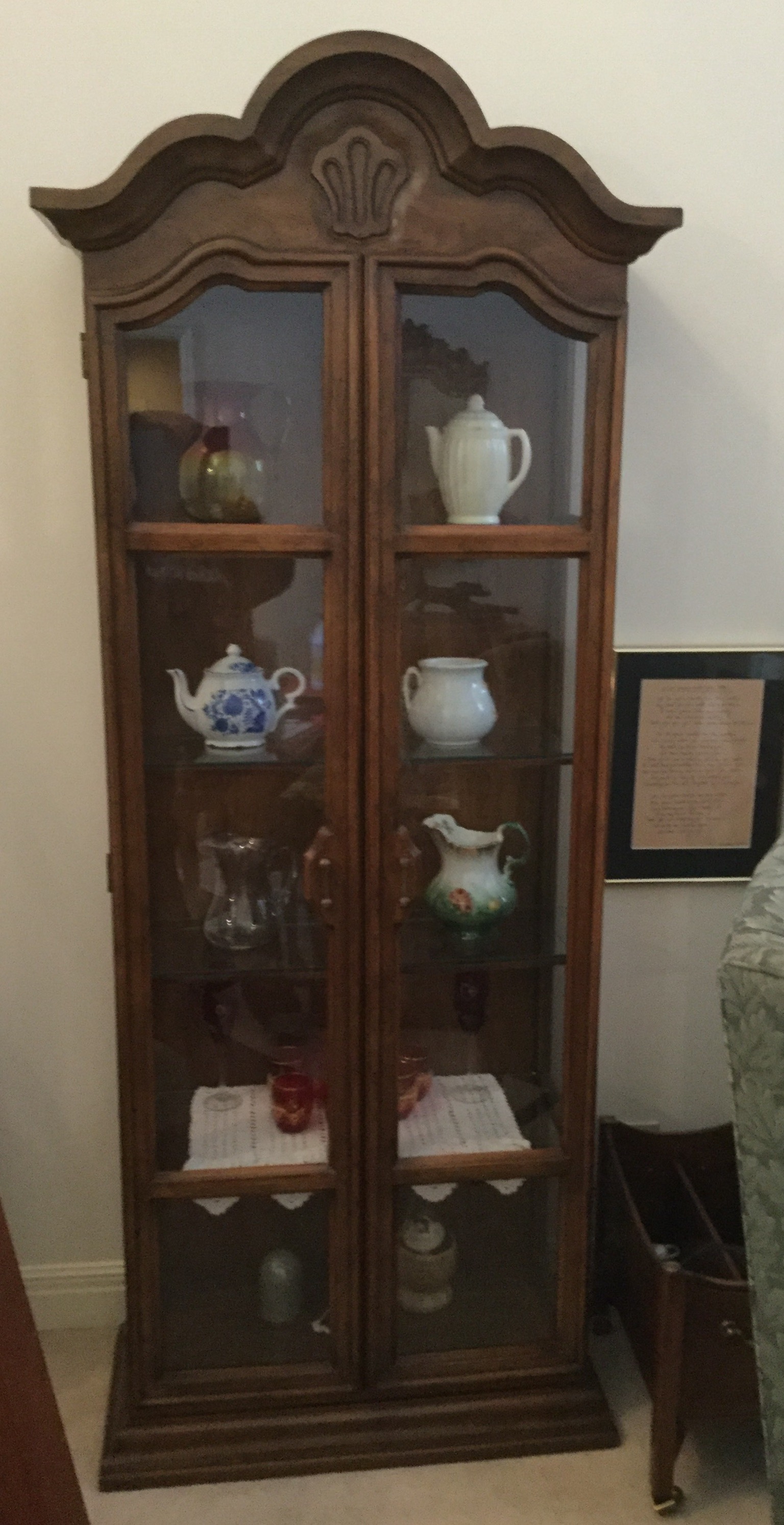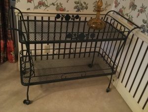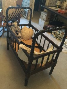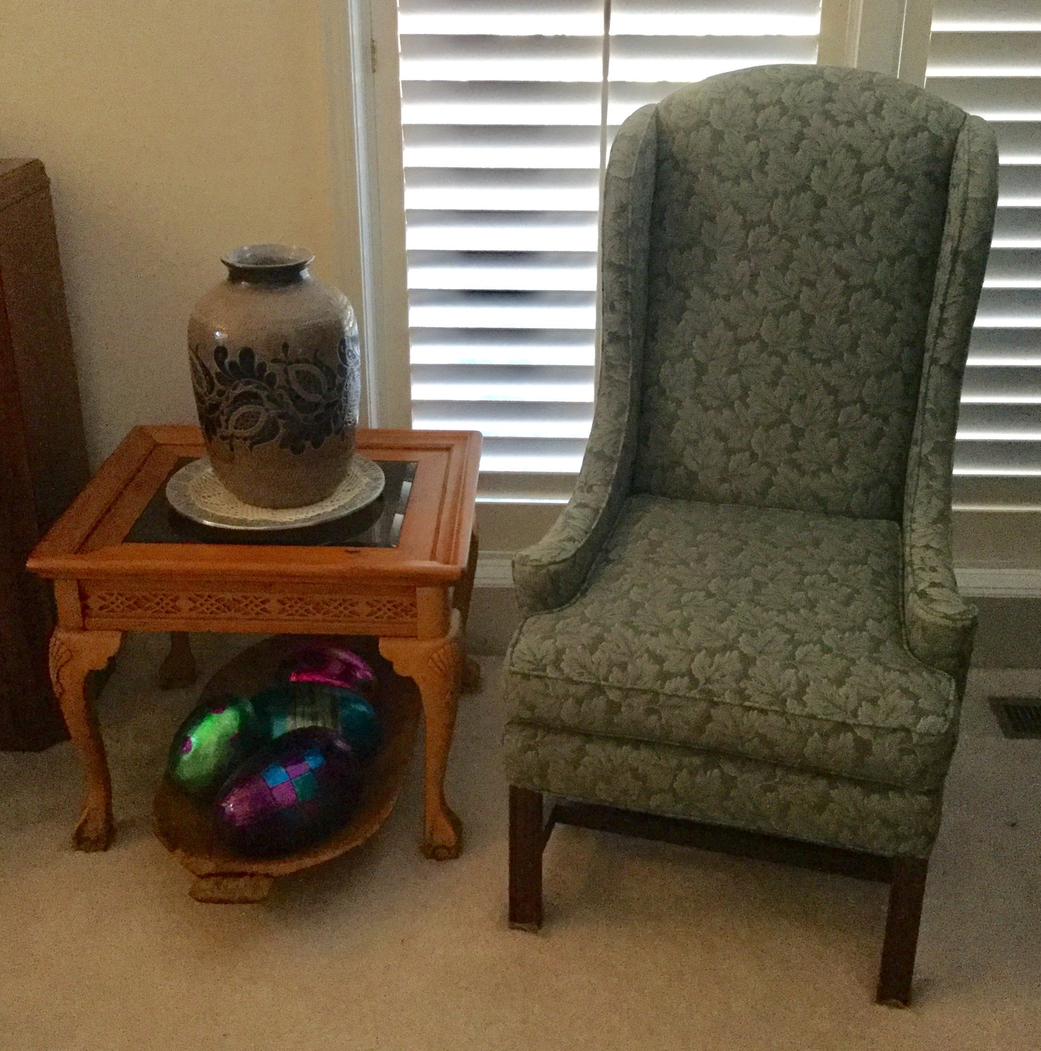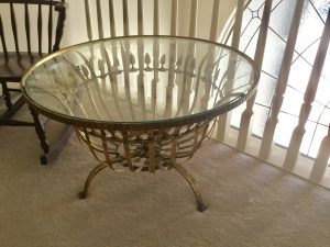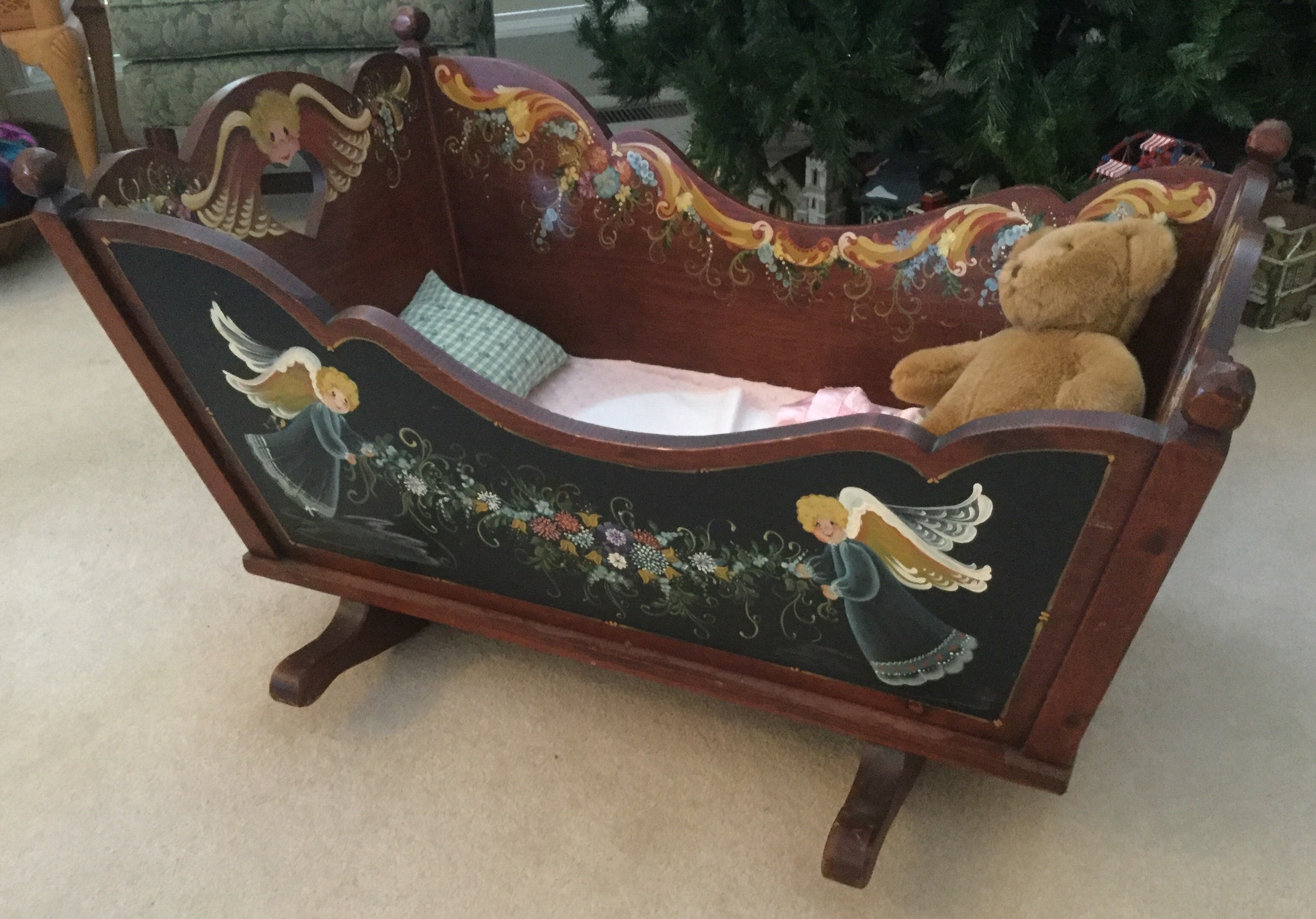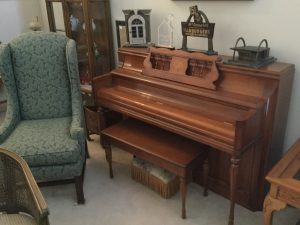 Gate leg table, hand painted angel rocking bassinet/cradle, pair of sage wingback chairs, beautiful upright piano, walnut curio cabinet, goldtone metal coffee/side table w glass top, primitive child buggy, 2 nice wood hope chests …