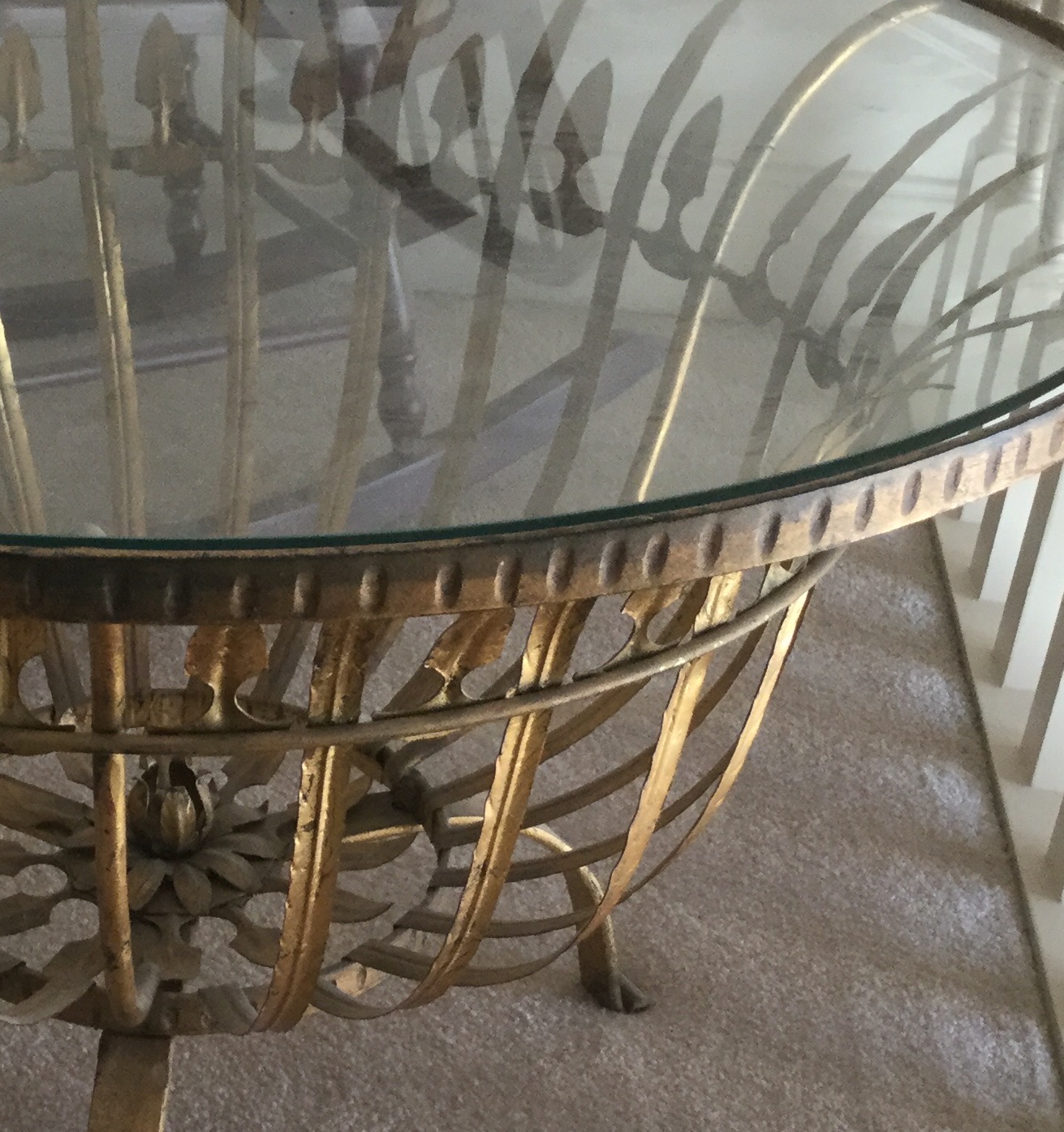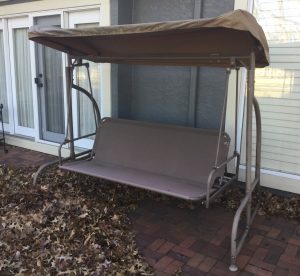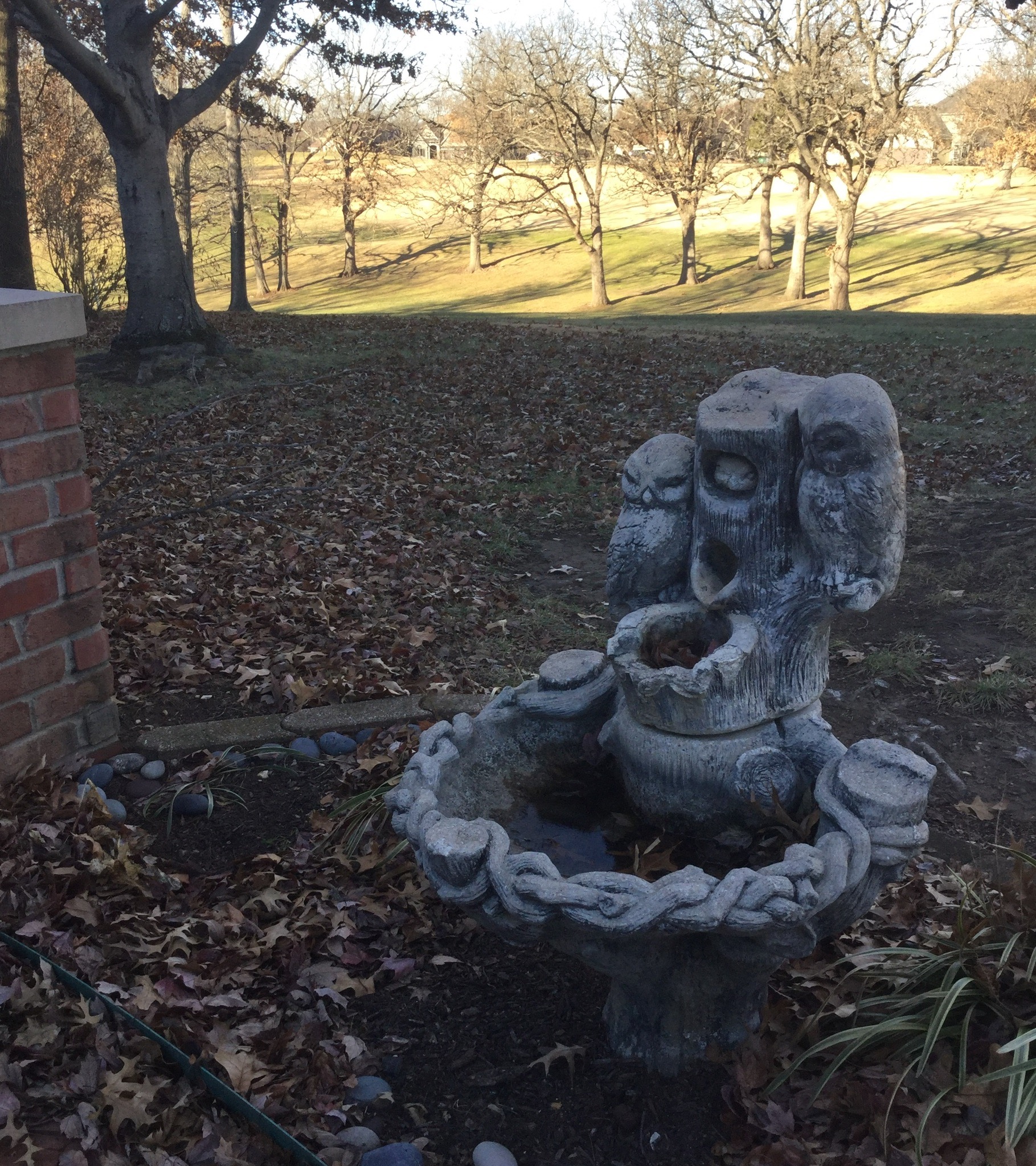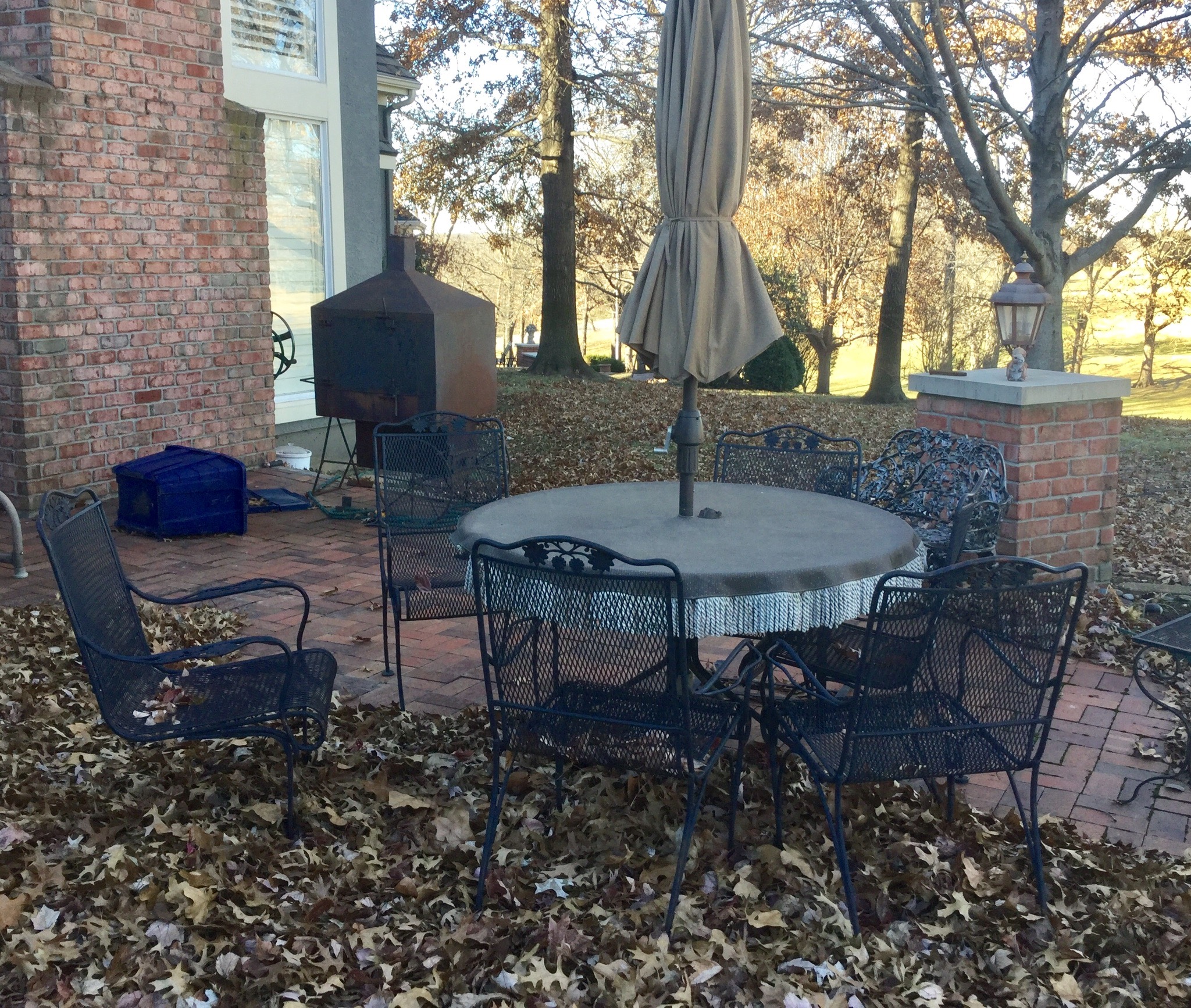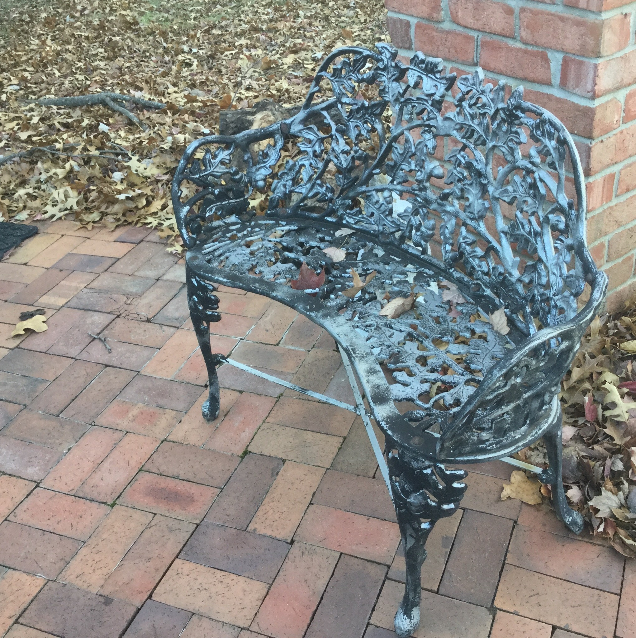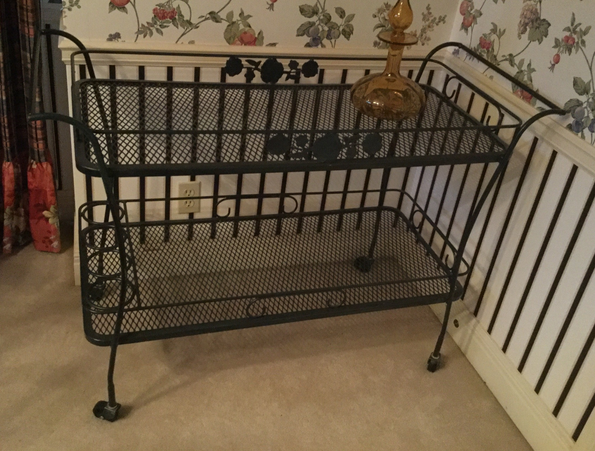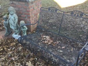 Wrought iron round outdoor table & 5 chairs, matching lounger, several wrought iron bev carts, wrought iron glider, iron smoker, many concrete statuary and owl fountain, cast iron love seat, tan mesh glider with canopy …