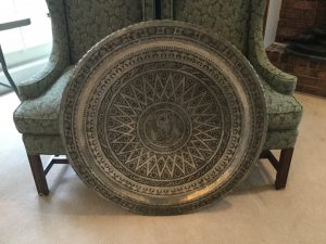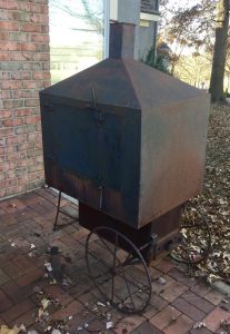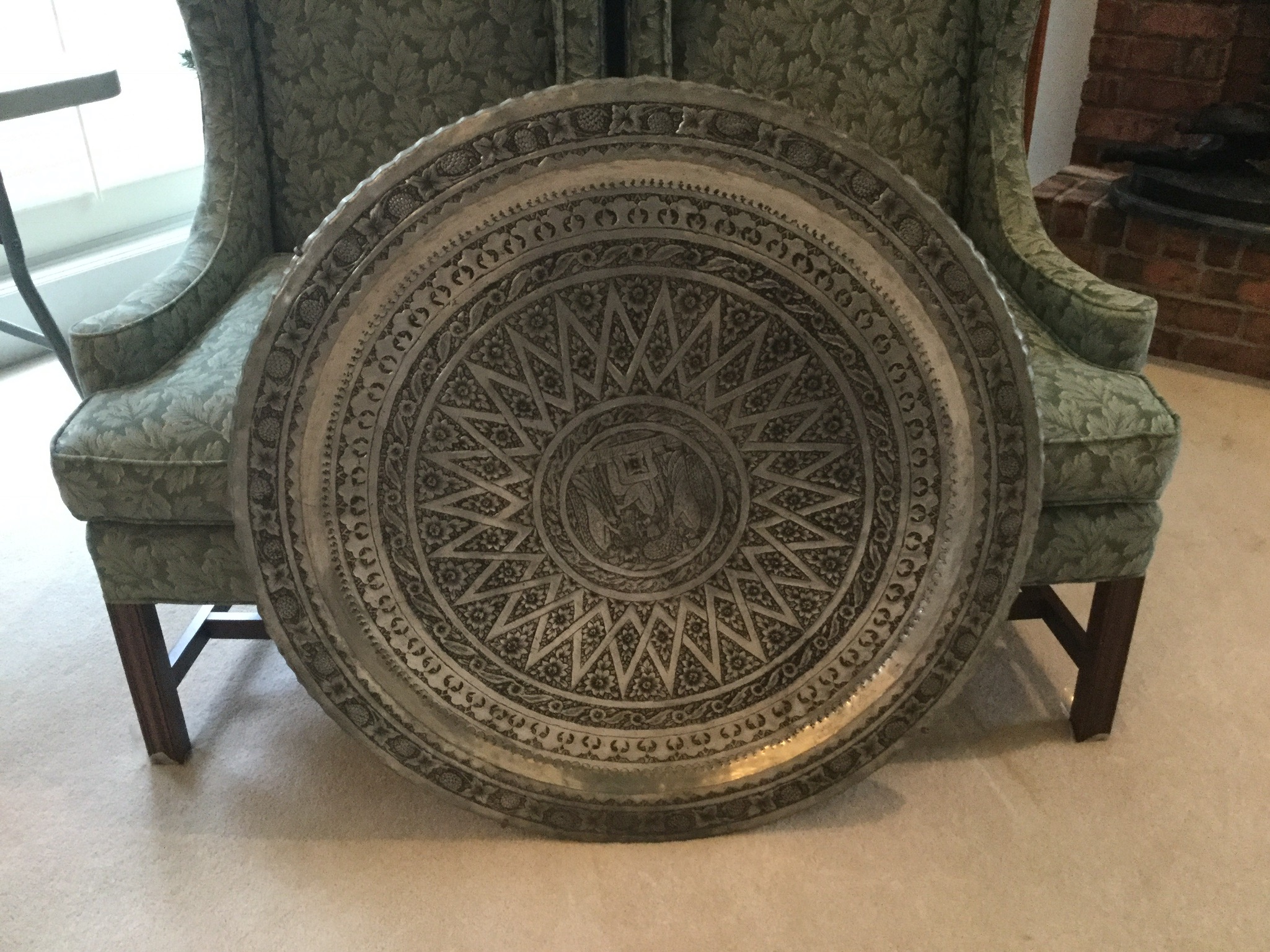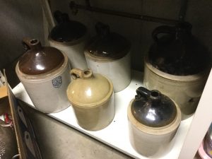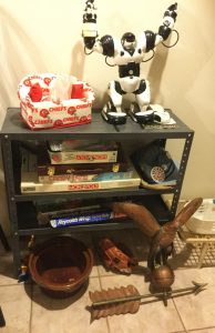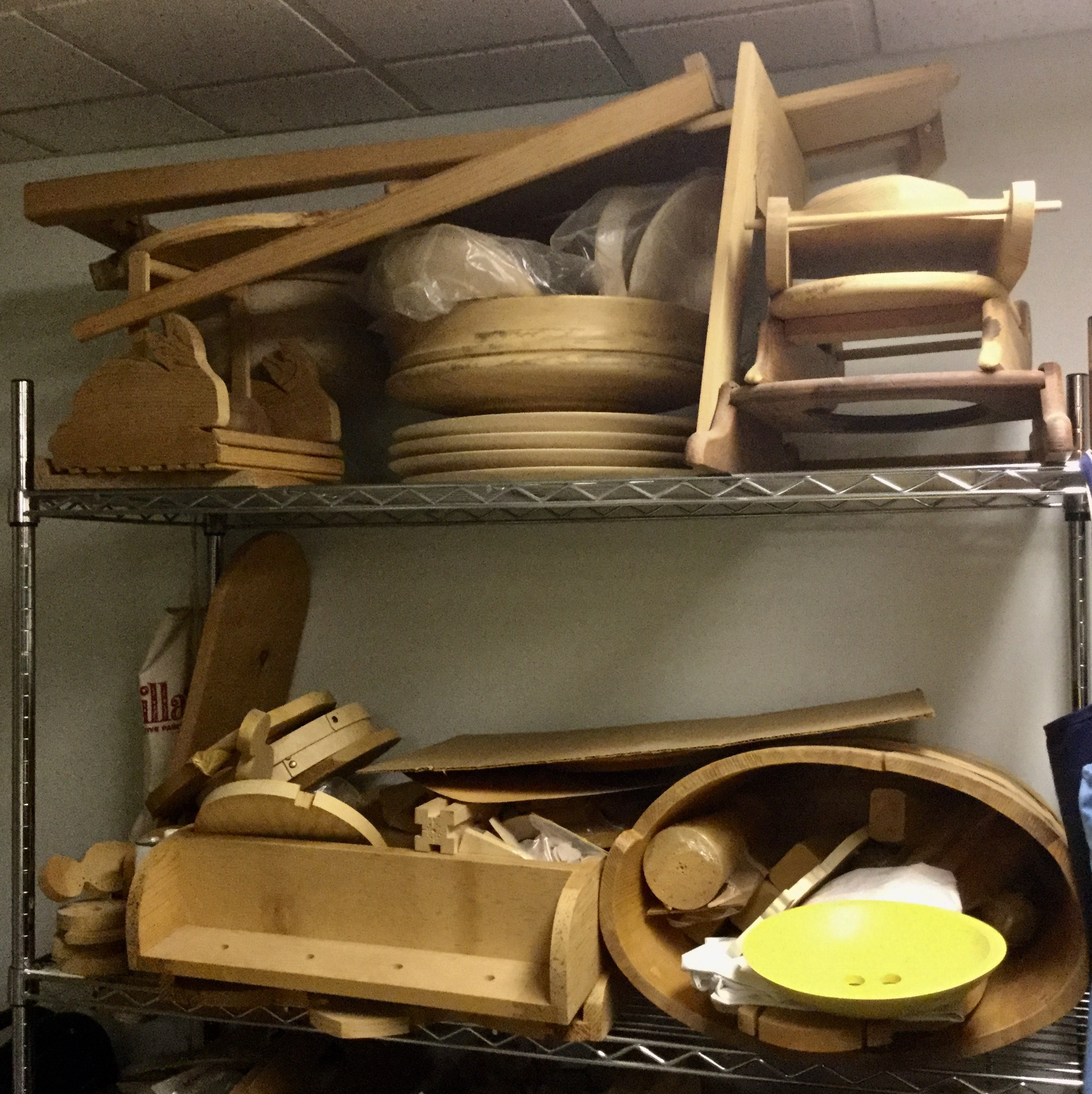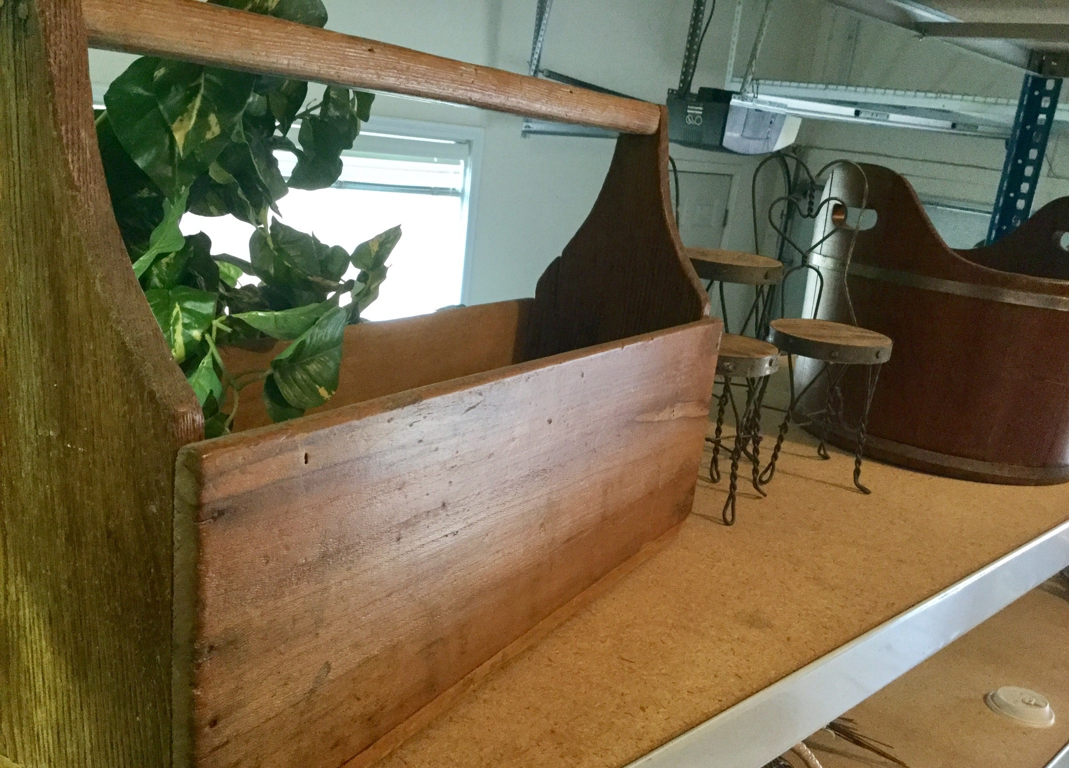1. Hamil Plaza print, copper eagle weathervane, board games, 2 pizza oven paddles (one wood, one stainless, wood butcher block cart, glass jugs, LGB Trains, many crocks, inversion table, card tables/chairs …