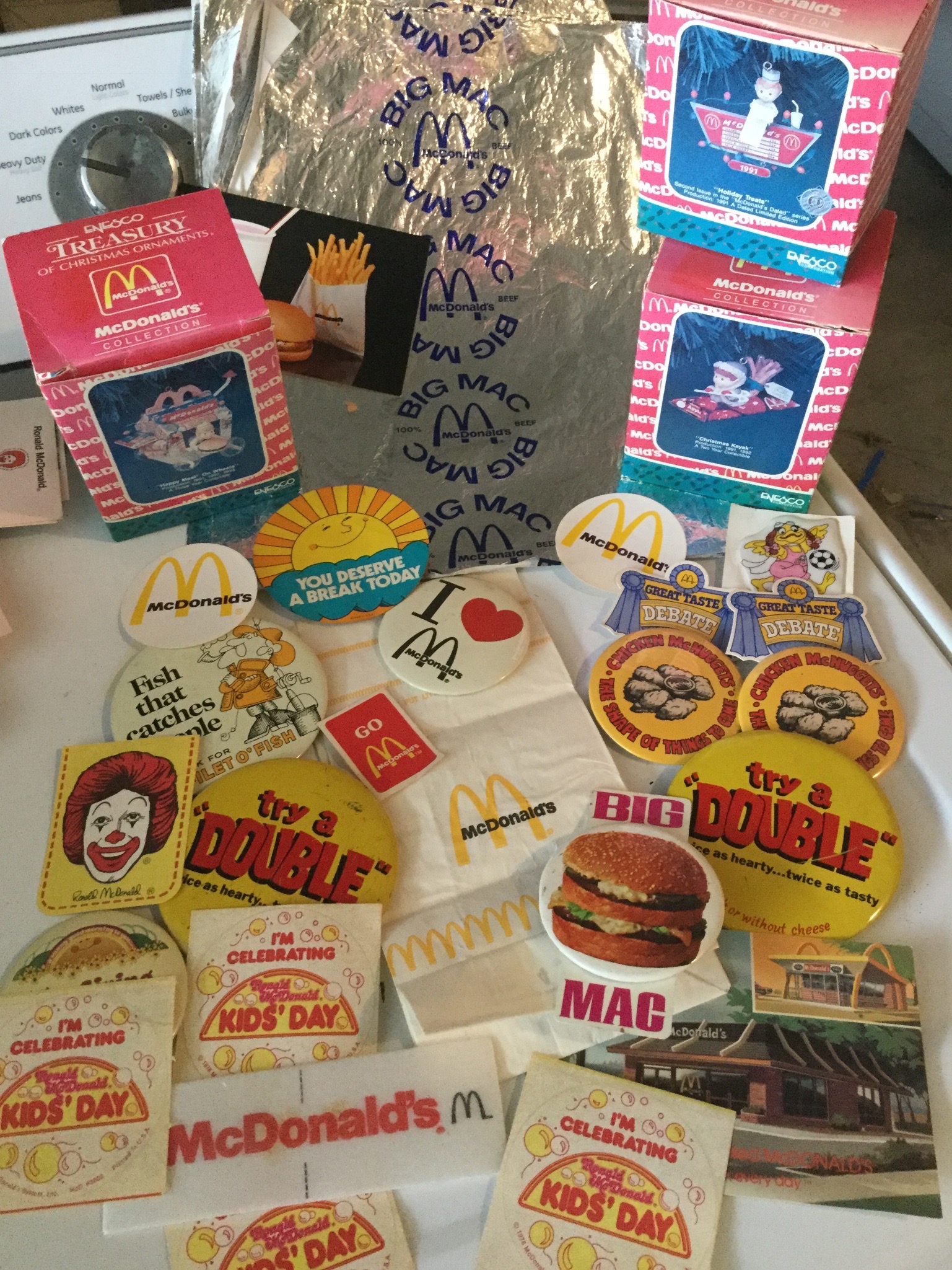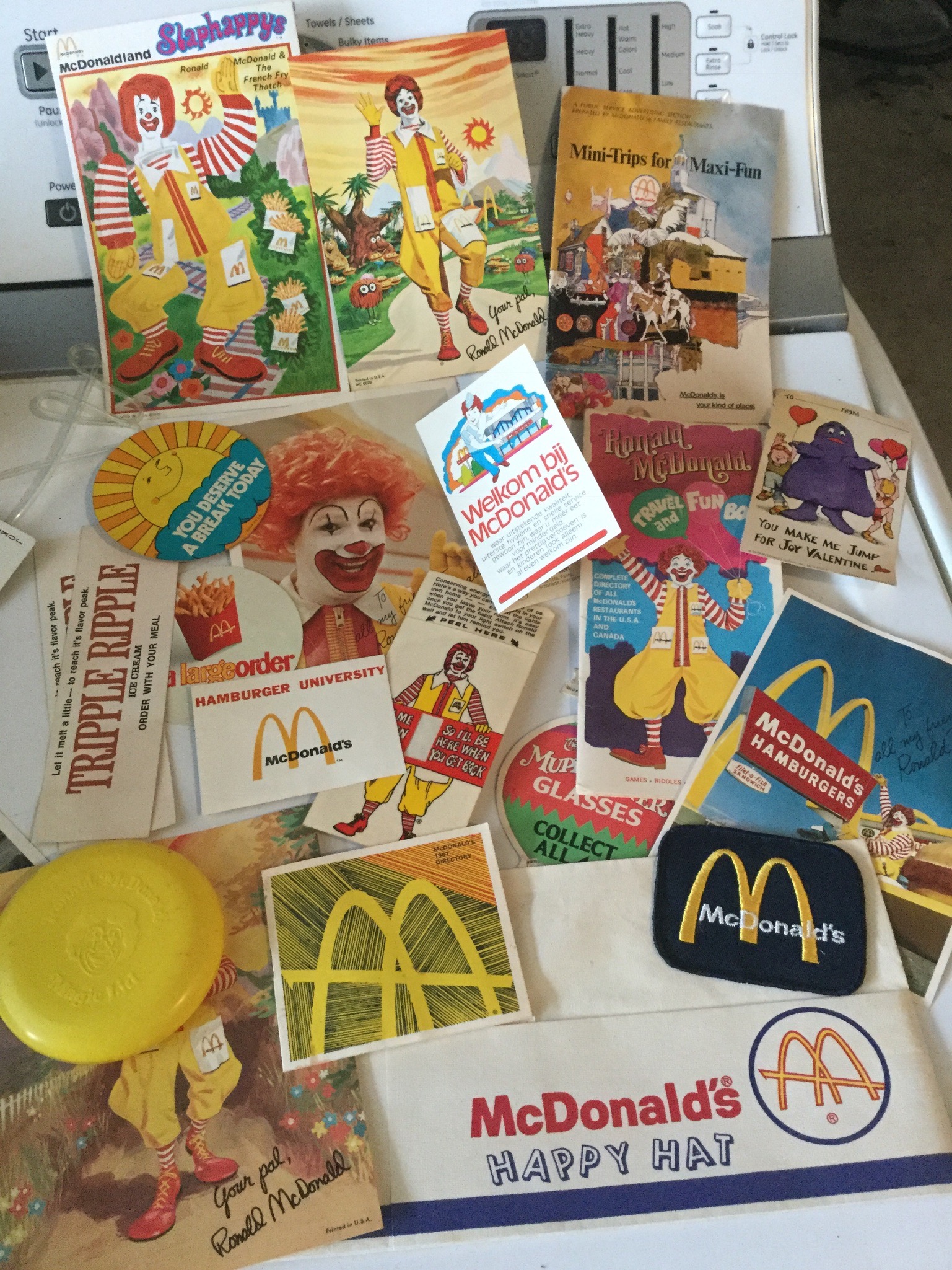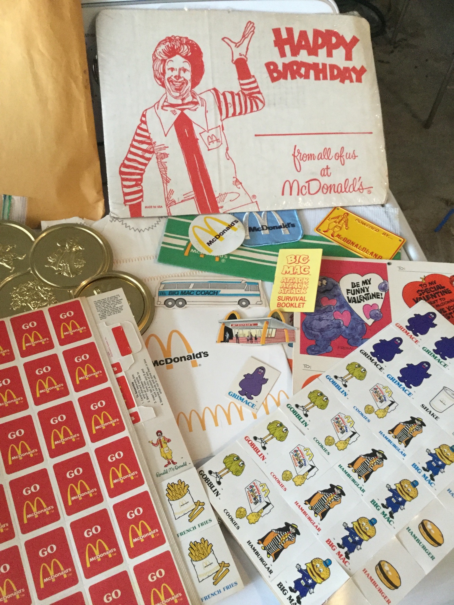 A McFrenzy of McDonald’s memorabilia and such … decent amount of ephemora (fancy-schmancy word for things that exist or are used/enjoyed for a short time, usually printed or written), 4’x 2.5 foot-ish (heavy) Ronald McDonald, paper items including some foreign – stickers, meal games, many McDonald uniforms (our fav being the ‘70’s polyester work shirts), McD scarves and bowties, promo misc, yellow Ronald and Grimace forks and spoons, with plates, lotsa glassware, light-up McDonalds, cups, stuffed animals, Franklin Mint McD plates, Enesco ornaments, buttons, hats, postcards, patches, a LARGE latch hook and large painting of Ronald McD, and 3 LARGE just opened boxes of Happy Meal Ty Beanies in bags … and more!