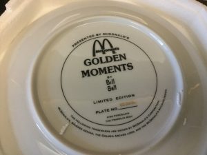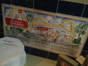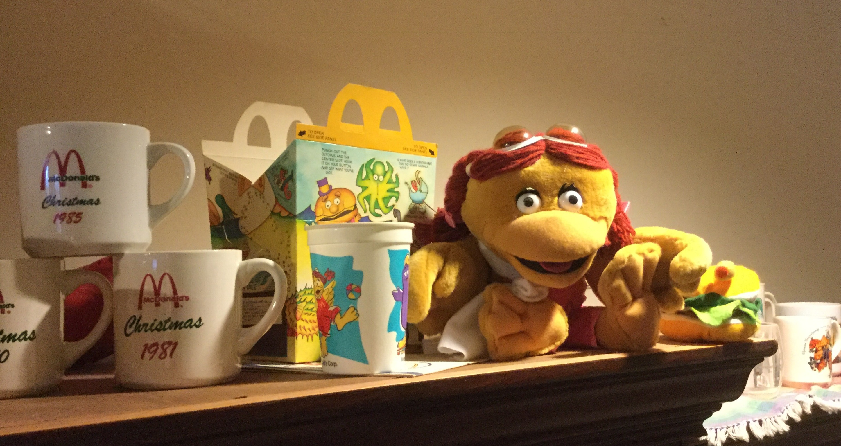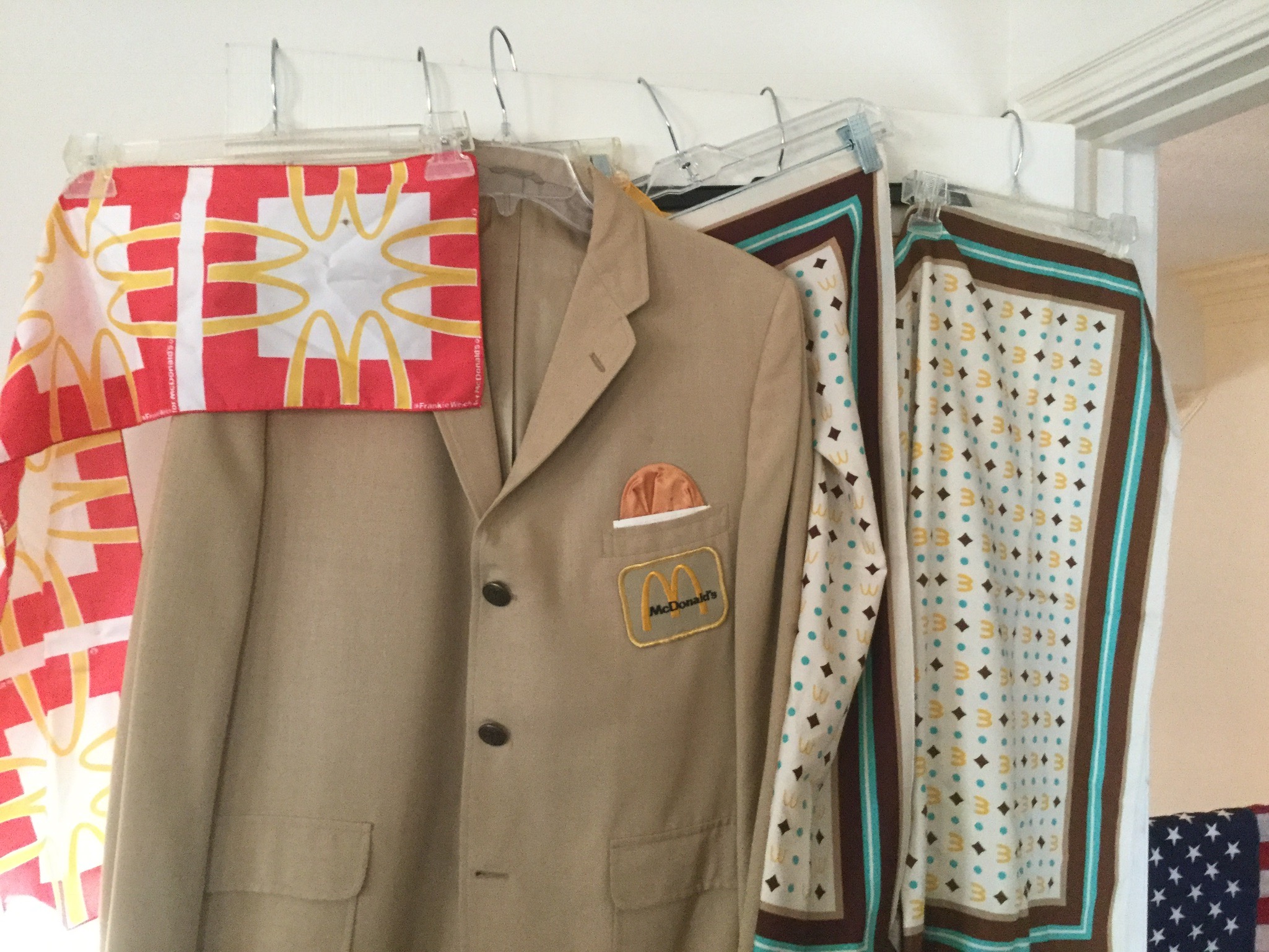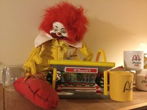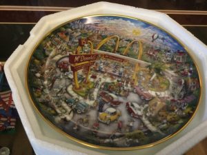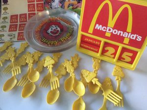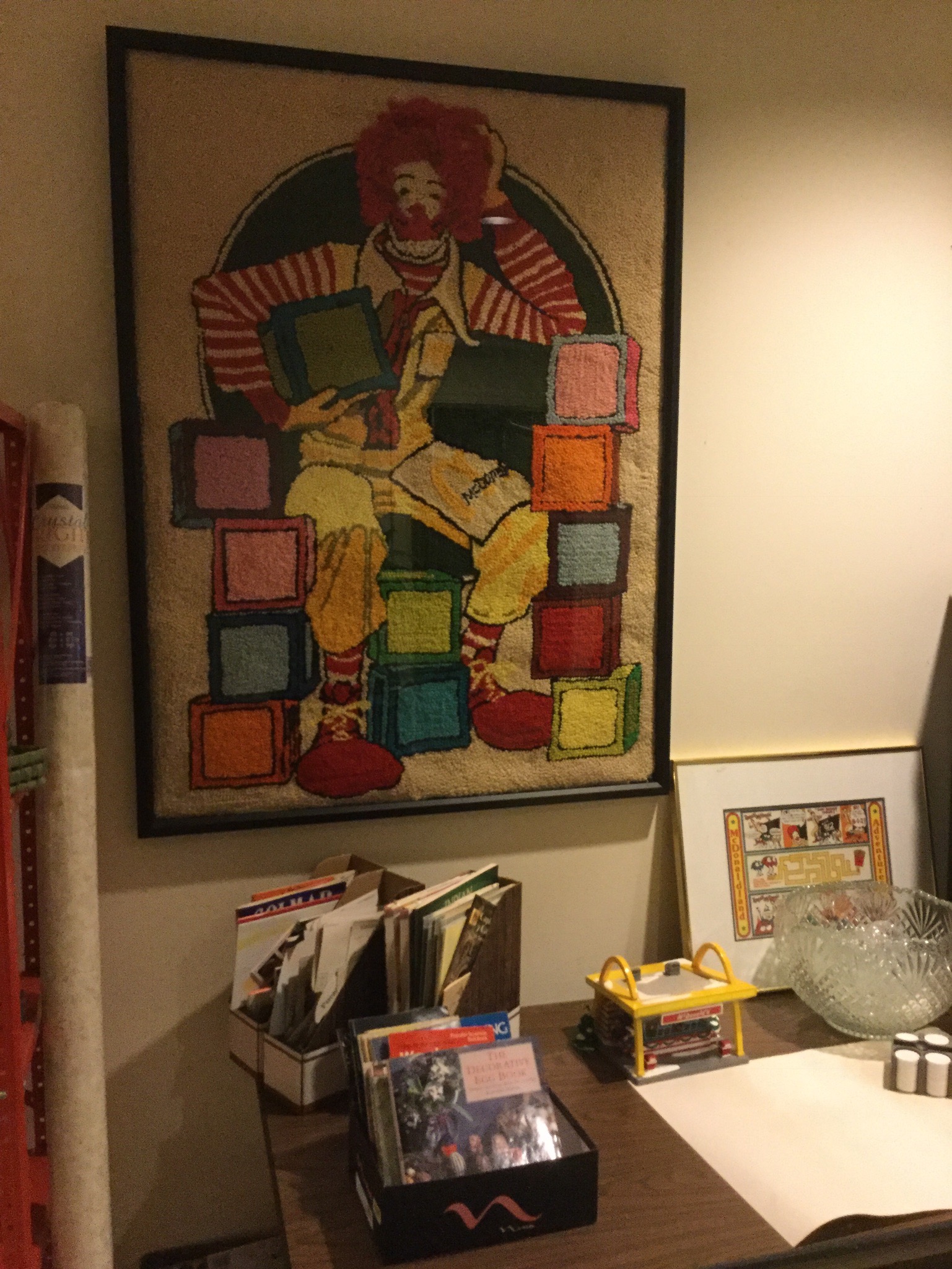 A McFrenzy of McDonald’s memorabilia and such … decent amount of ephemora (fancy-schmancy word for things that exist or are used/enjoyed for a short time, usually printed or written), 4’x 2.5 foot-ish (heavy) Ronald McDonald, paper items including some foreign – stickers, meal games, many McDonald uniforms (our fav being the ‘70’s polyester work shirts), McD scarves and bowties, promo misc, yellow Ronald and Grimace forks and spoons, with plates, lotsa glassware, light-up McDonalds, cups, stuffed animals, Franklin Mint McD plates, Enesco ornaments, buttons, hats, postcards, patches, a LARGE latch hook and large painting of Ronald McD, and 3 LARGE just opened boxes of Happy Meal Ty Beanies in bags … and more!