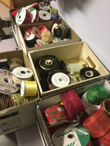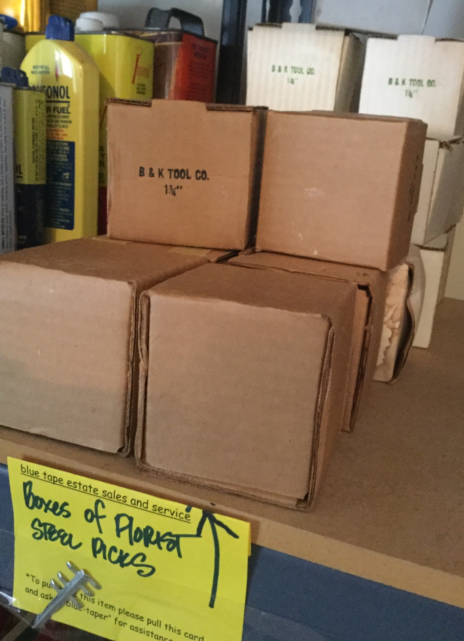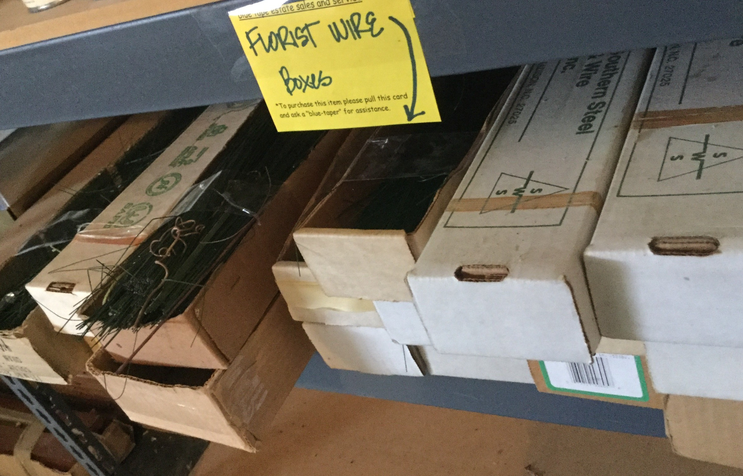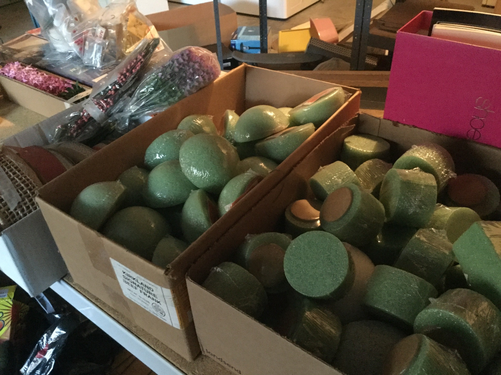 SCADS of floral arrangement notions: steel picks Styrofoam anchors, greenery, 113-ish boxes of florist wire, a few dolls, some quilts, a Sundash 2 tanning bed, lots of jewelry (mostly costume with a McSmattering of gold) …