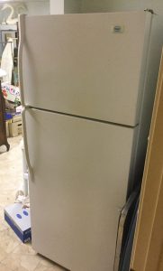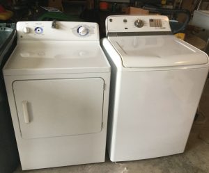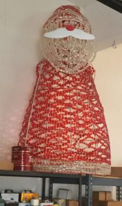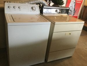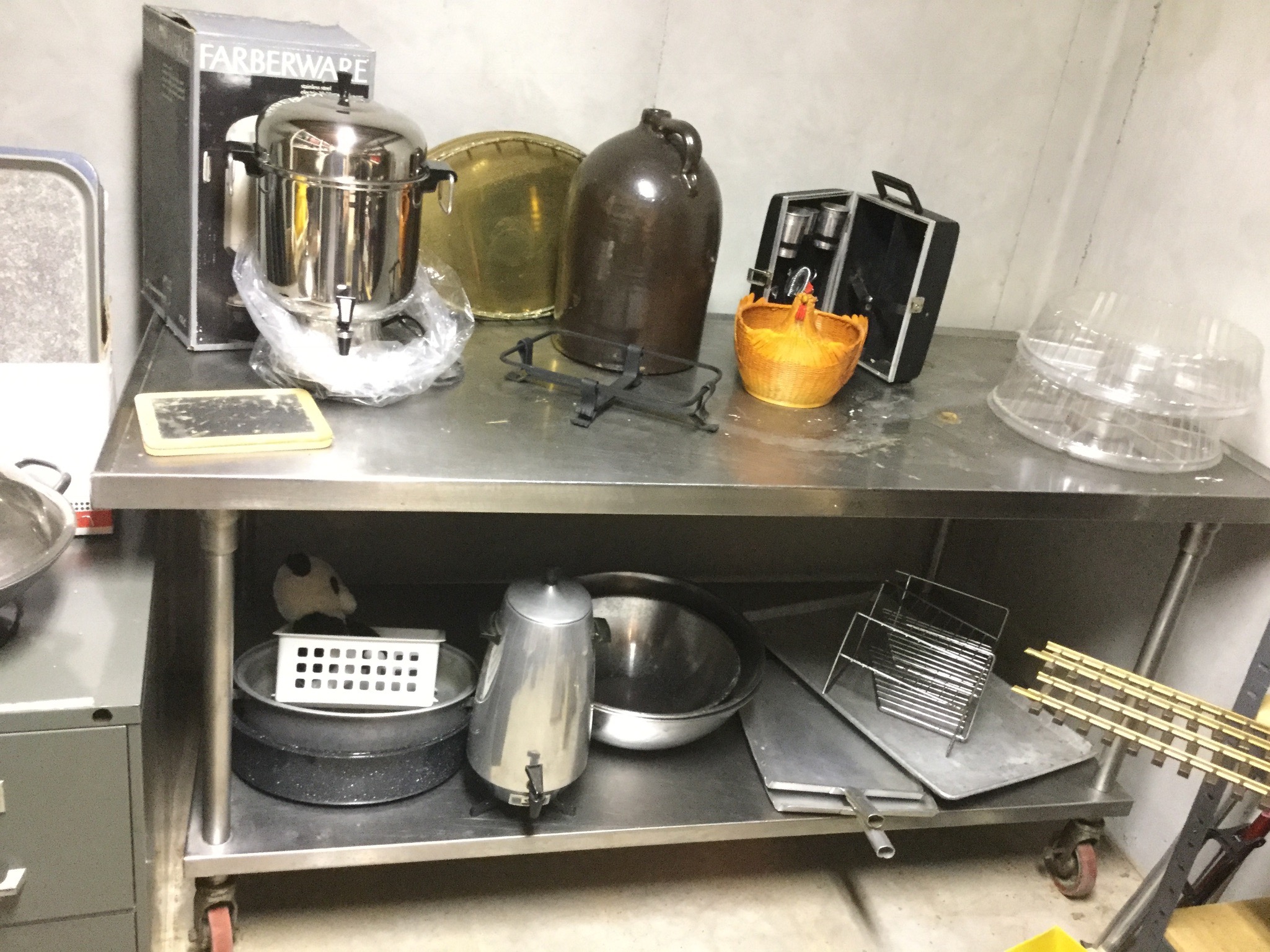 Stainless steel work station table, rolling wire basket units, 2 washers, 2 electric dryers, large light-up beaded Santa, primitive tined scooper (?), 2 display tables, basic garage fridge (tho located in the basement!) …