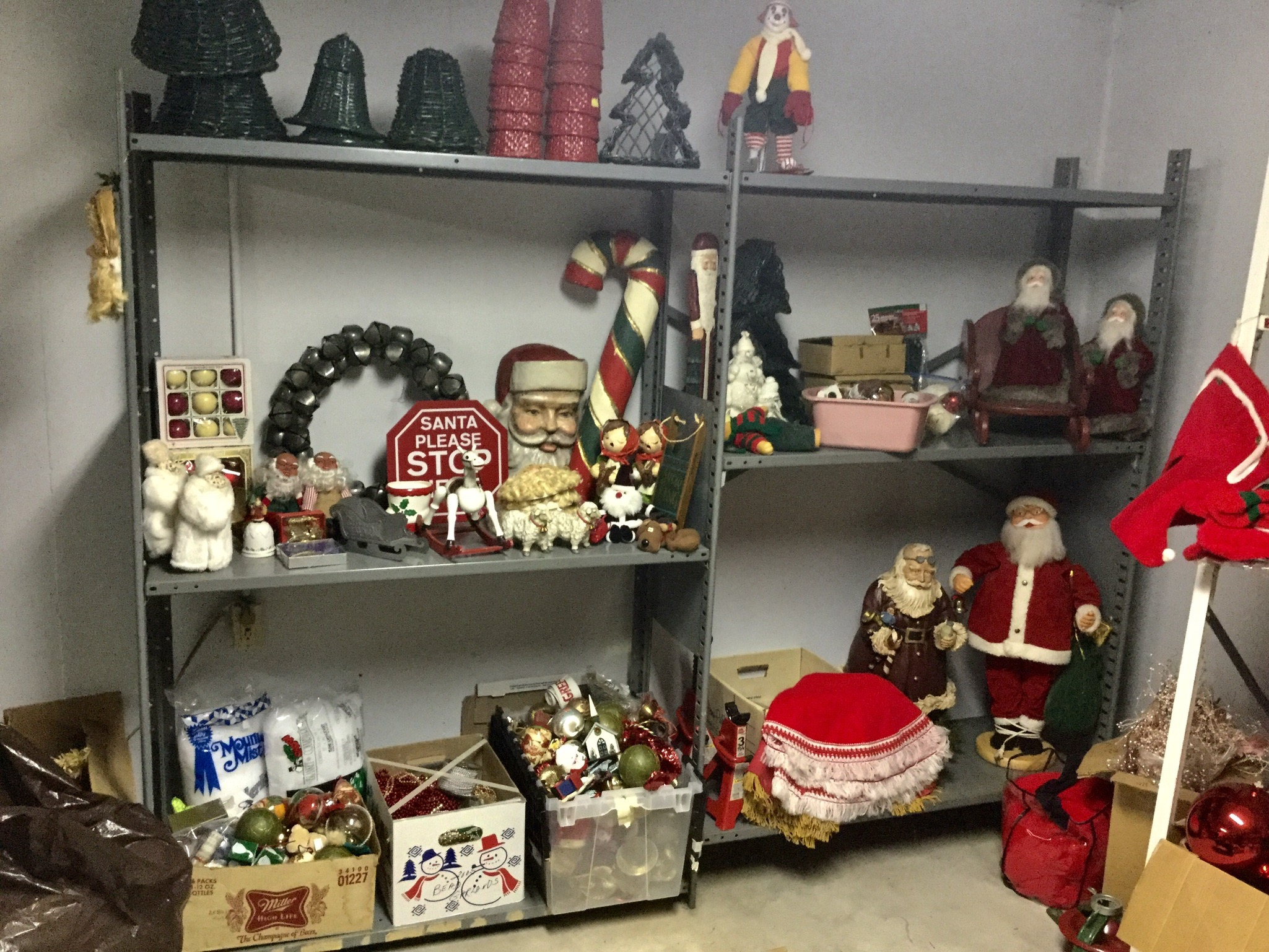 Ping pong table, 2 large stuffed deer, planting pots, garage workbench with tools, tabletop slot machine, vintage and other Christmas décor, boxes of ribbon, MANY sturdy shelving units, 2 microwaves, 2 glass punch bowl sets, DLK speaker set …