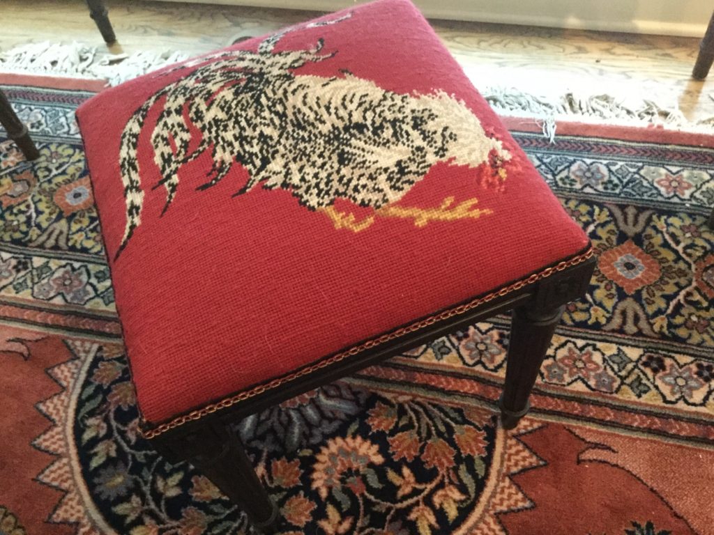 Our homeowner LOVED to needlepoint so you will find SO many items that were all a labor of love … our fave being the red rooster stool …