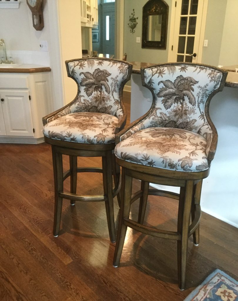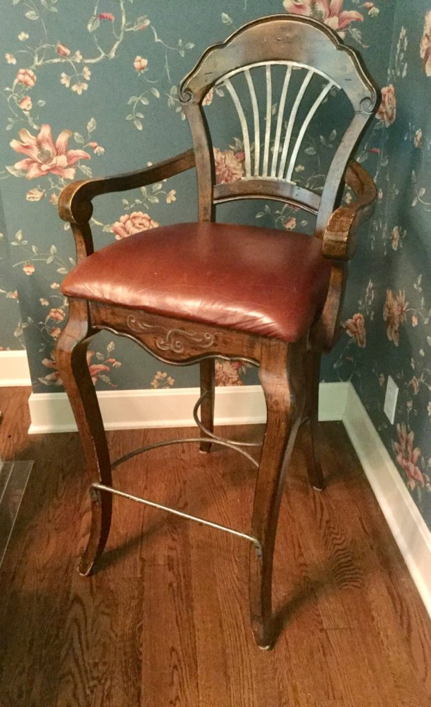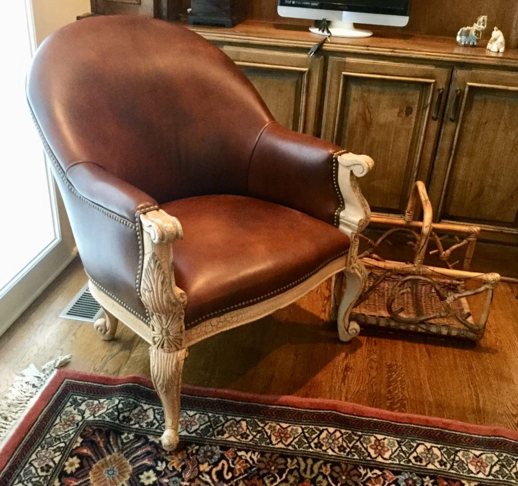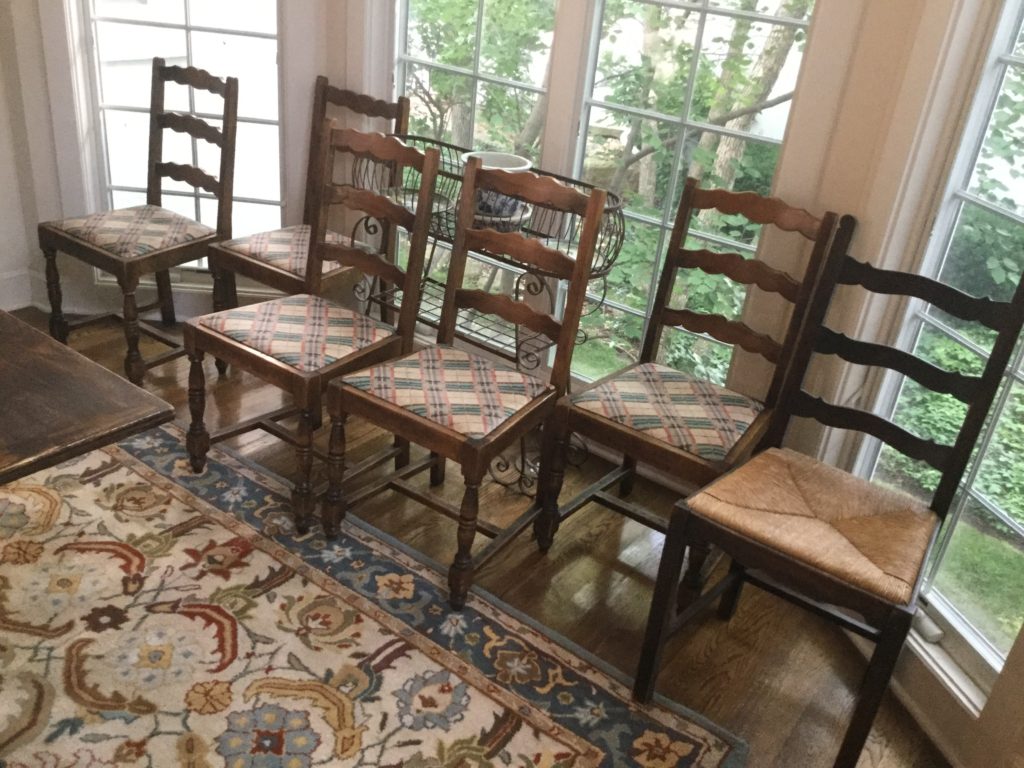 A leather Hancock & Moore round back club chair with cream wood accent, many ladder-back chairs, pair of Palecek brown/cream/wicker/wood bar stools (full disclosure, one seat has some blemishes) …