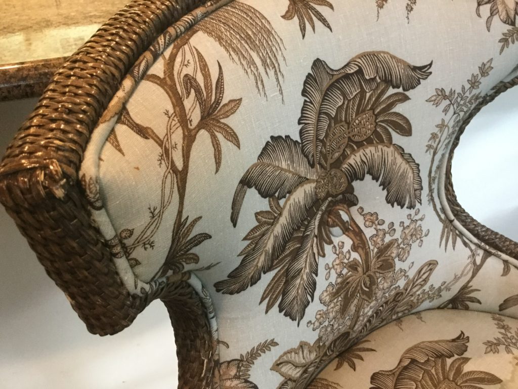 Miles Talbott black floral cushy club chair, pair of Frederick Edward club chairs, Hitchcock side table w 1 drawer and drop sides …
