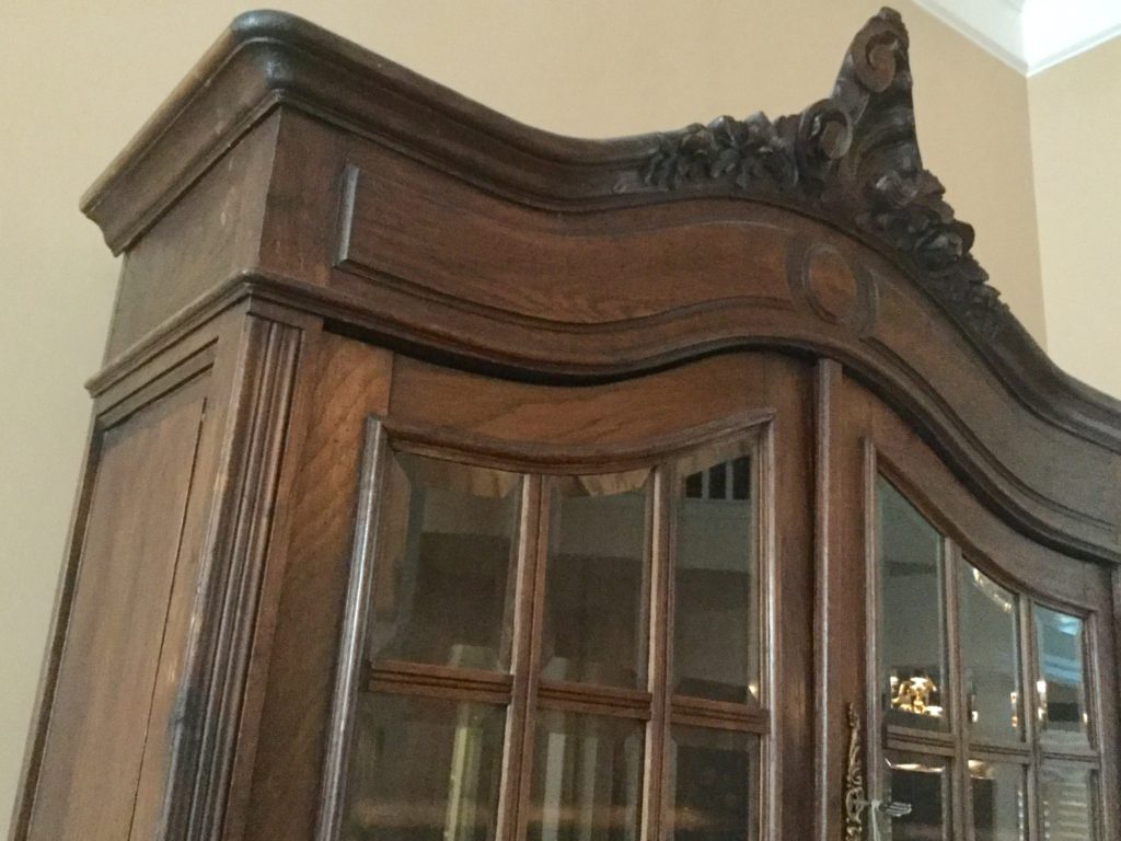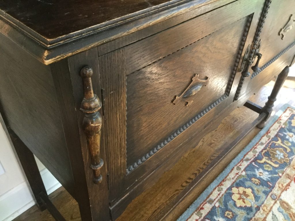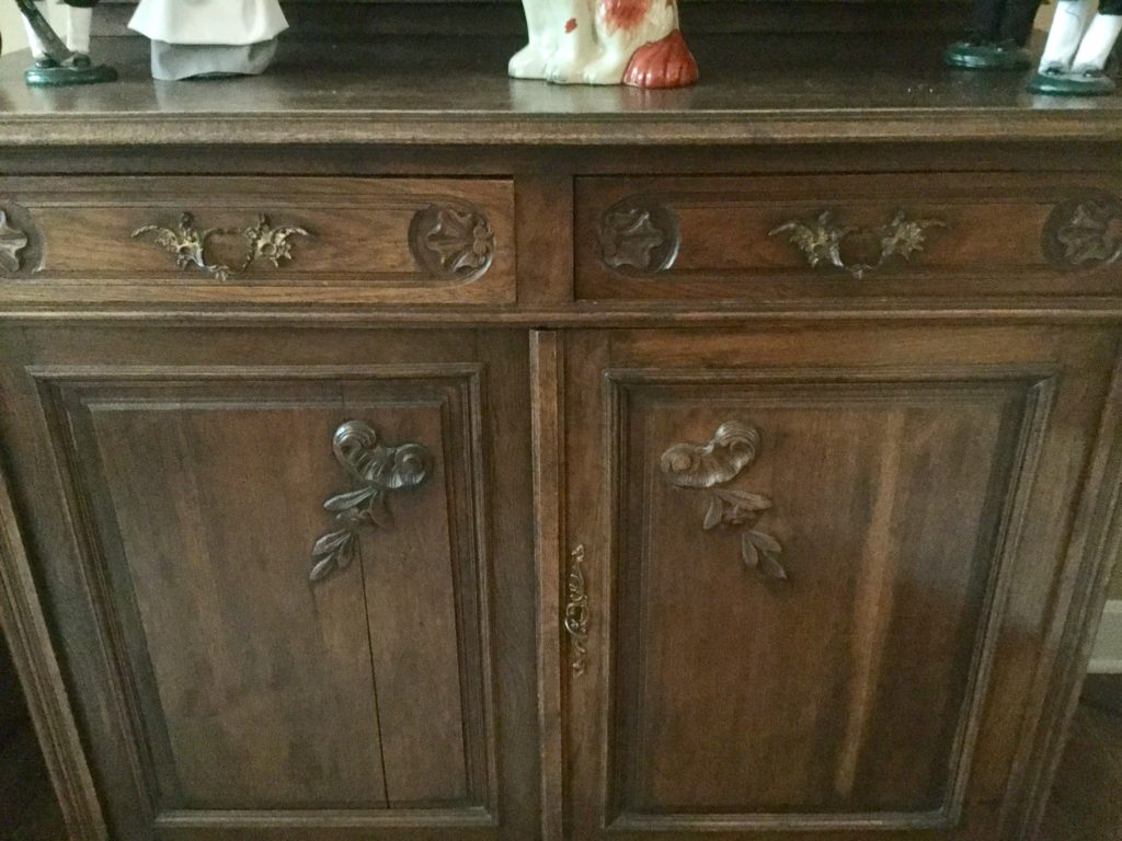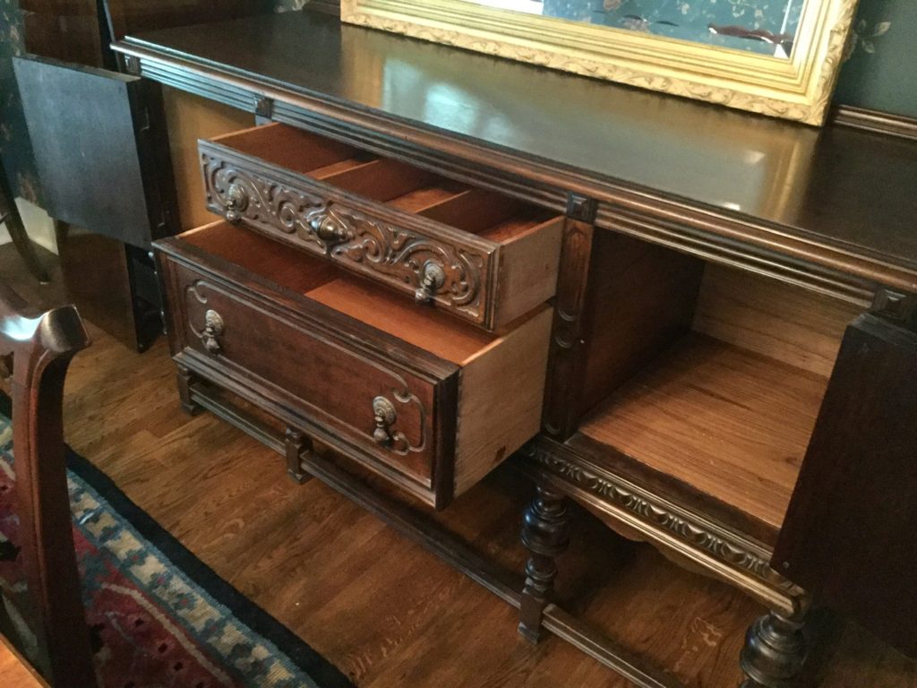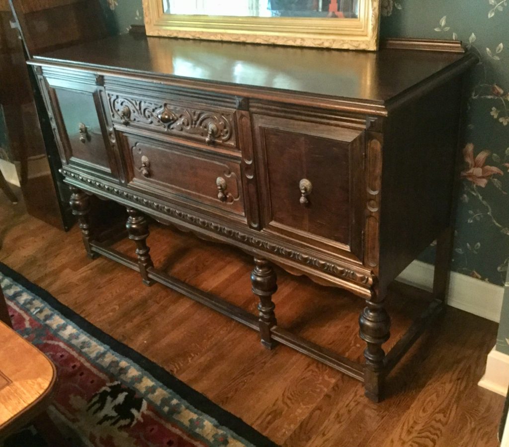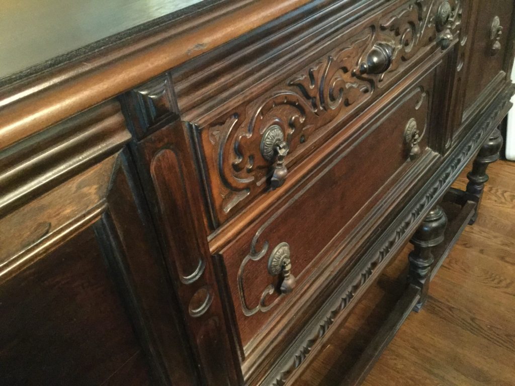Antique carved wood sideboard/buffet, dining room table with 2-tone top, 2 leaves and 6 matching chairs, round pedestal side table, matching (sold separately) antique walnut 5-drawer slender chests …