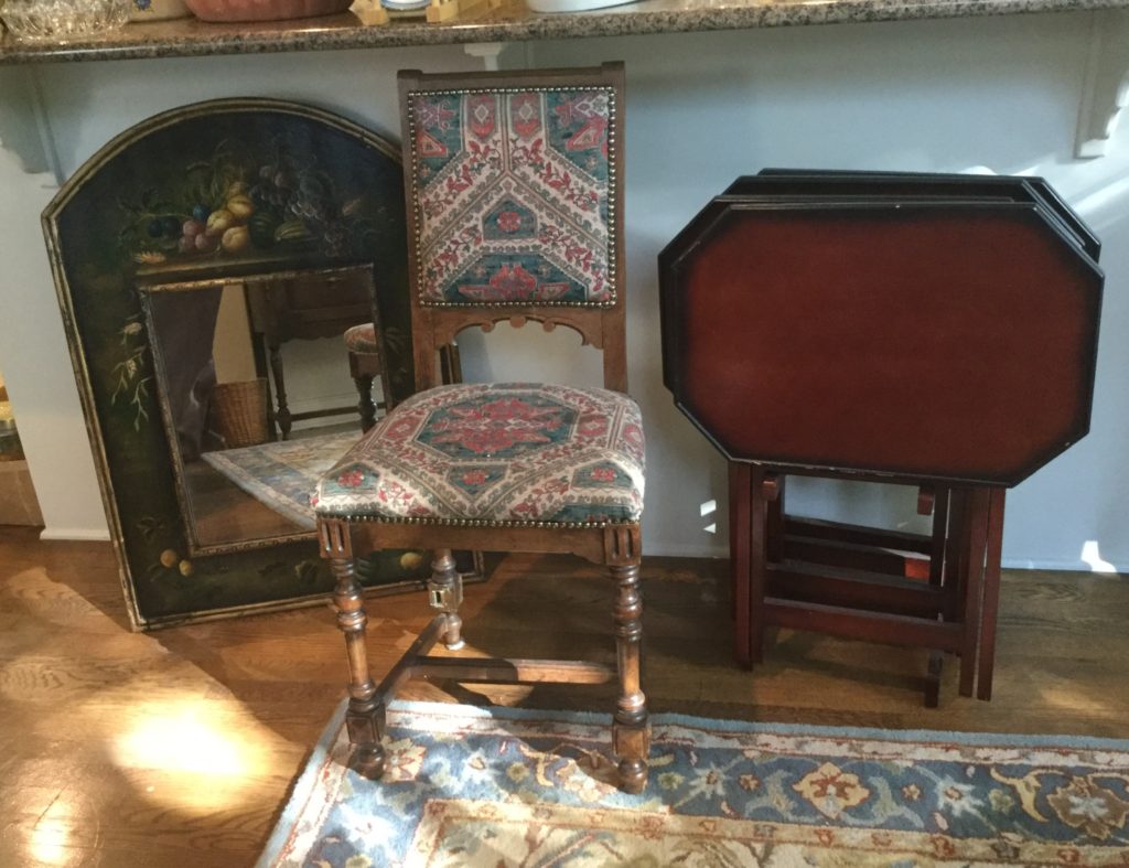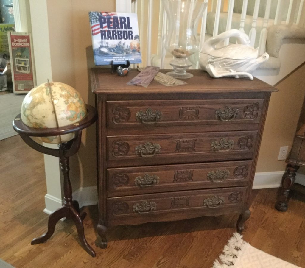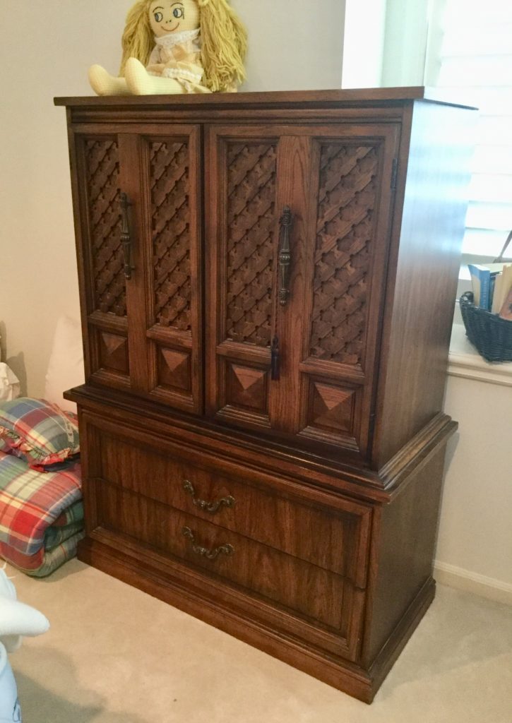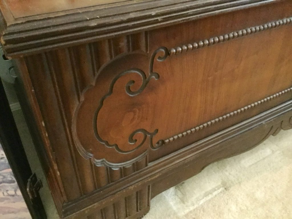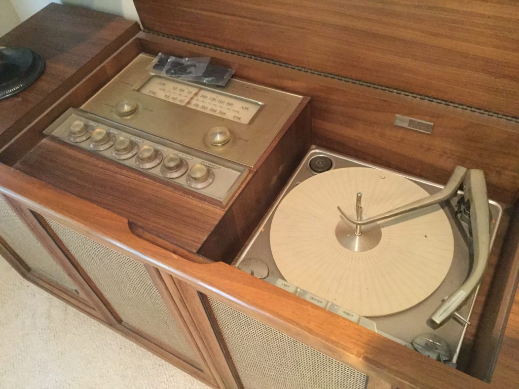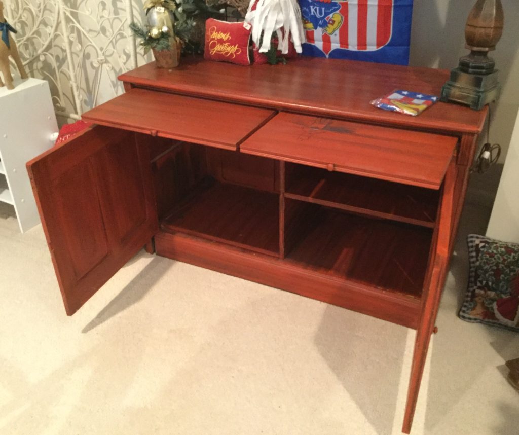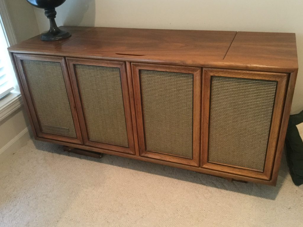 2 storage chests (one red, one brown) with pull out ledges, Mid Century Modern stereo console with Drexel cabinet (radio works, haven’t tried the turntable), carved wood corner chair …