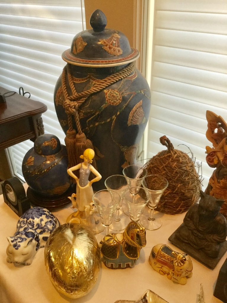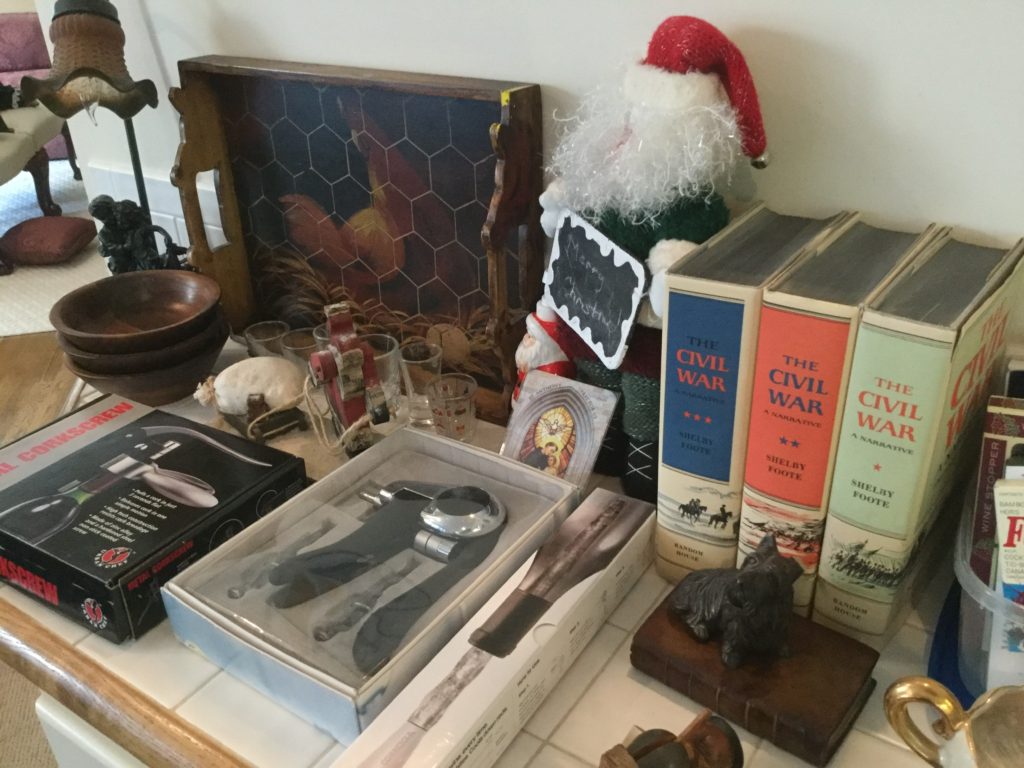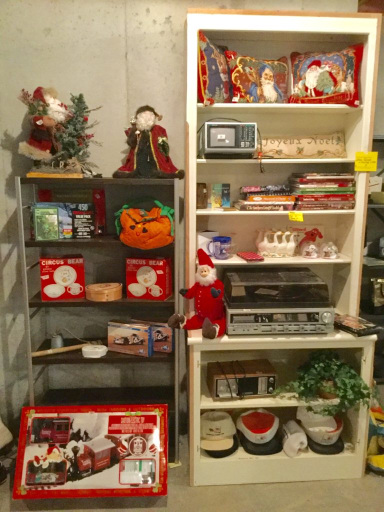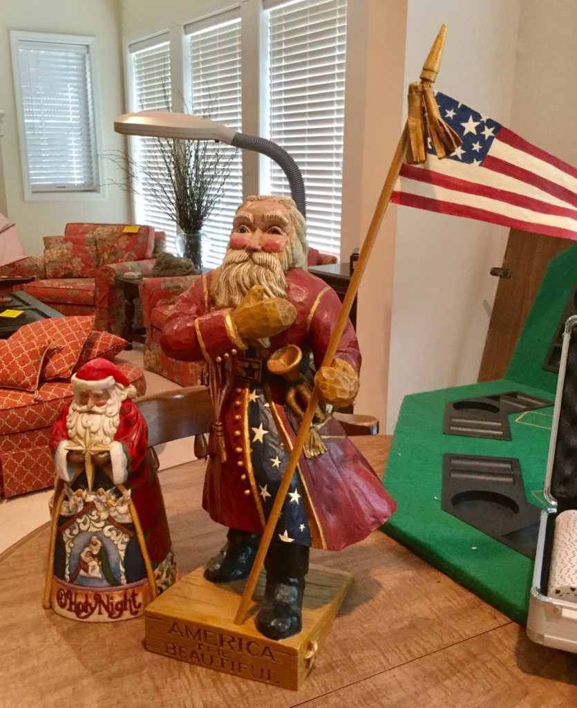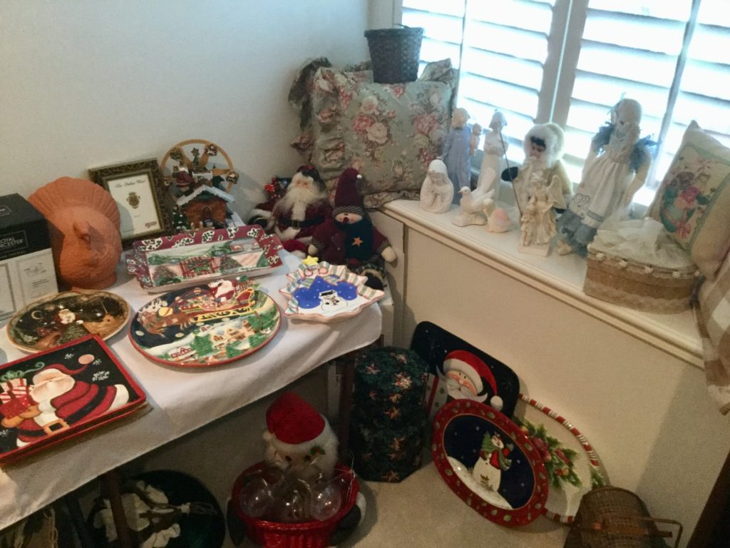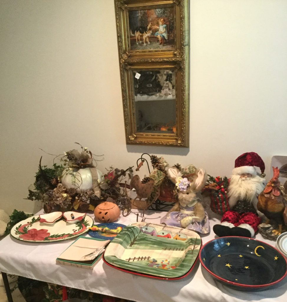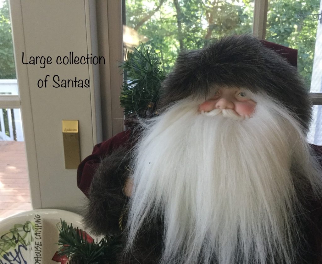 Pair of heavyfox candlestick holders that we’ve named Frank and Dean, Waterford crystal stems (set of 10 and set of 4), manywall mirrors, large selection of Santas (I hear he’s coming to town …) including a darling Lynn Haney Santa in the box …