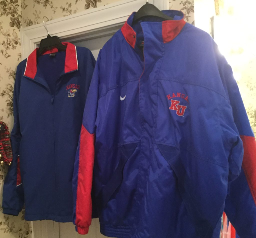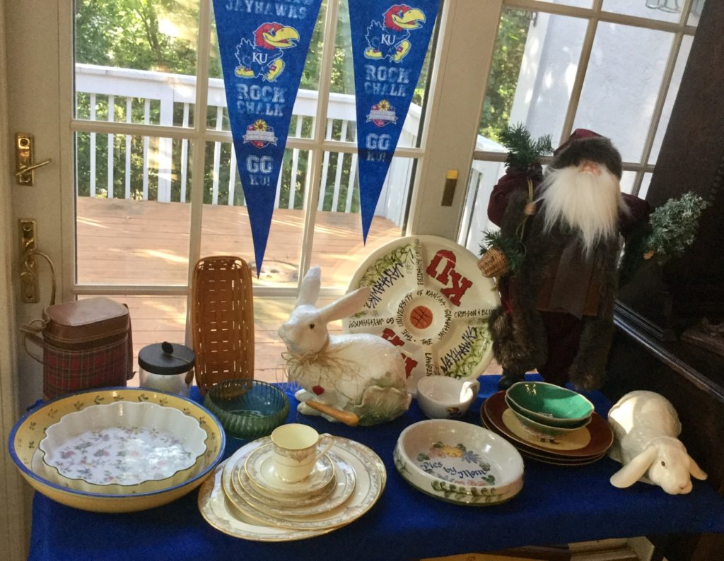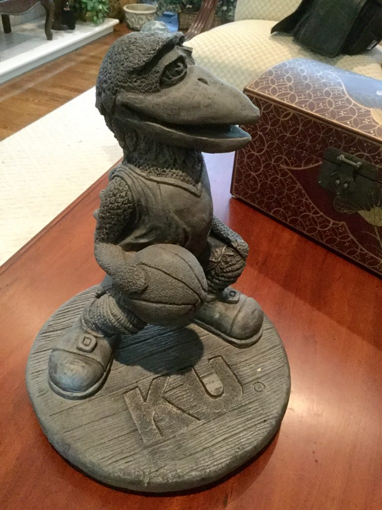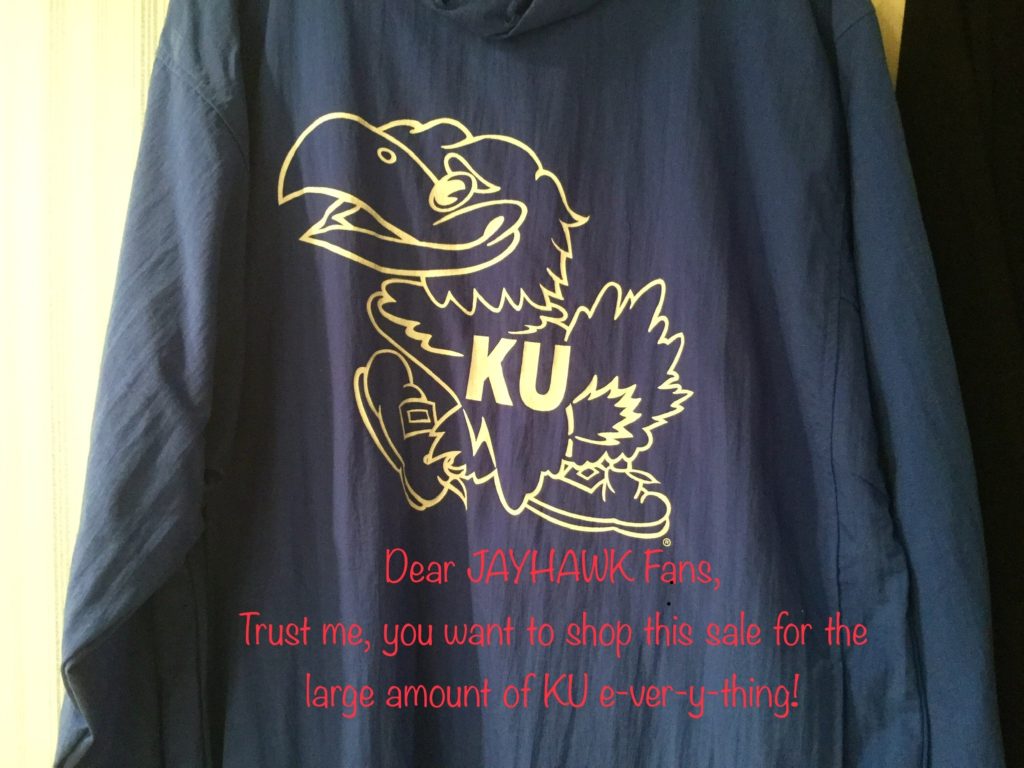 SO. MUCH. KU-JAYHAWK e-ver-y-thing. Coats, jackets, shirts, shoes, cups, pennants, serving pieces, stadium seats, large flags, décor and more including a concrete bench with Jayhawk legs – probs more for garden decorative as 1 of the Jayhawk legs needs repair …
