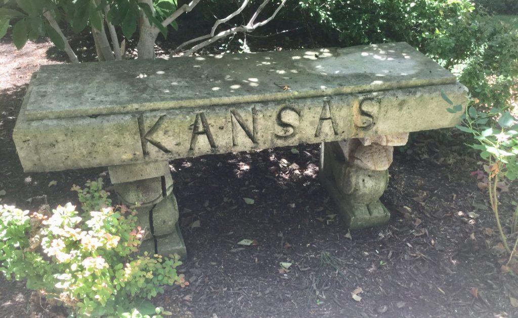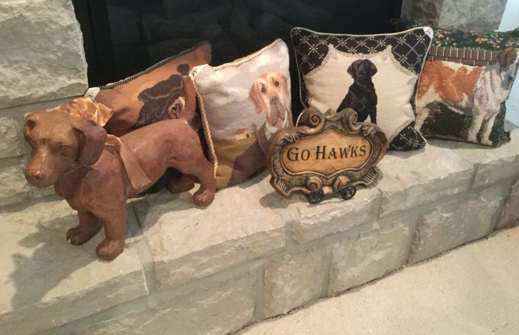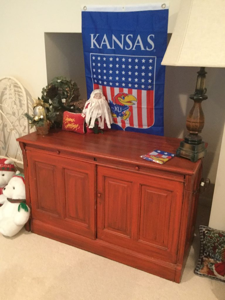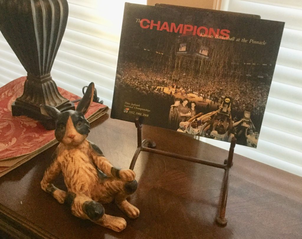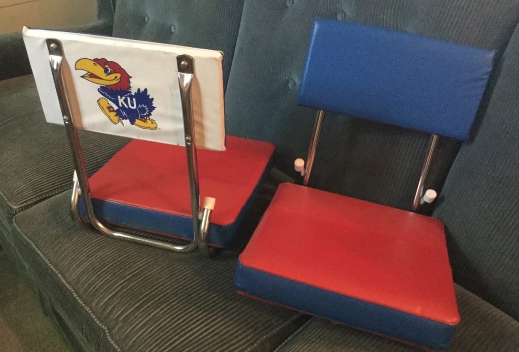 SO. MUCH. KU-JAYHAWK e-ver-y-thing. Coats, jackets, shirts, shoes, cups, pennants, serving pieces, stadium seats, large flags, décor and more including a concrete bench with Jayhawk legs – probs more for garden decorative as 1 of the Jayhawk legs needs repair …