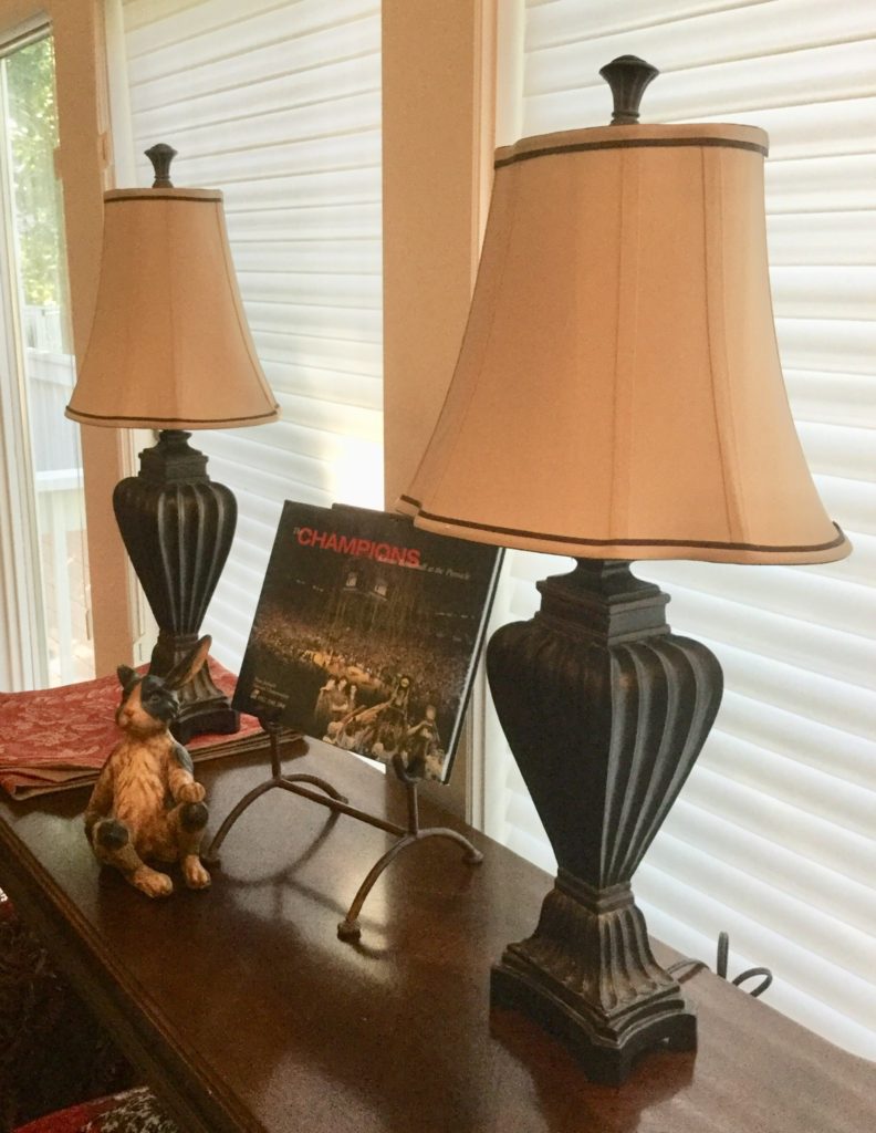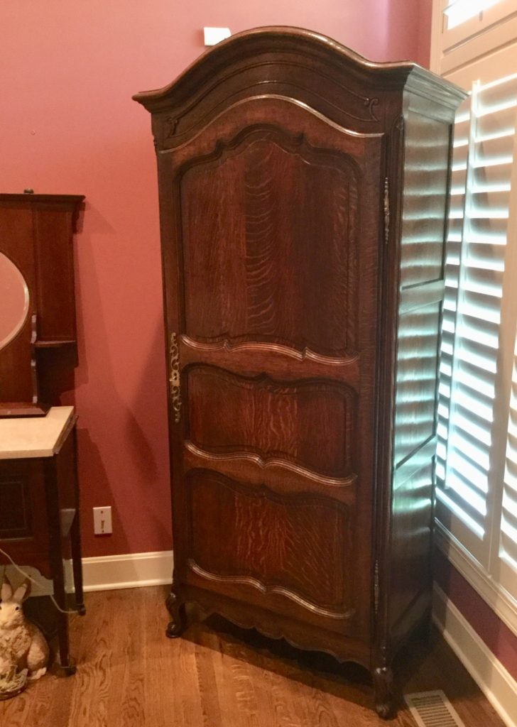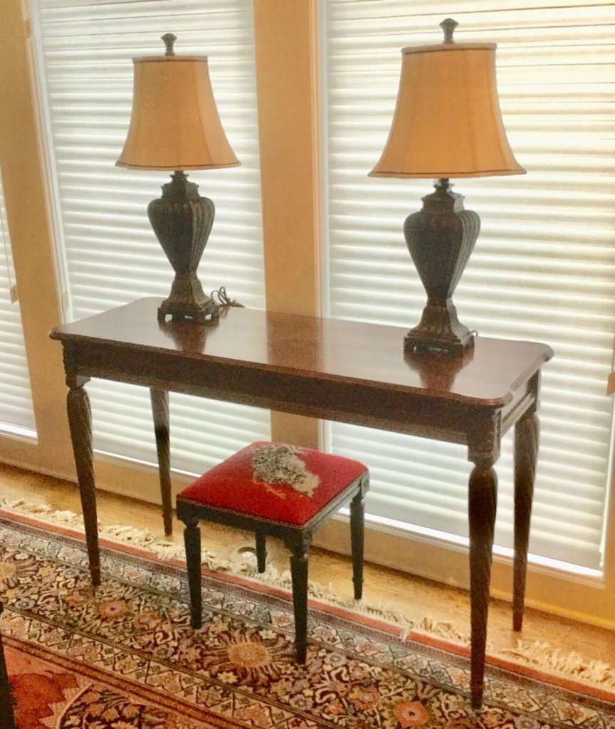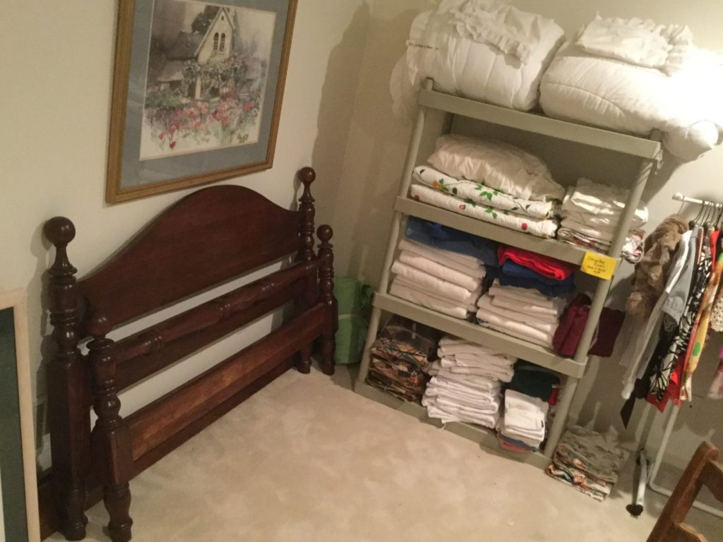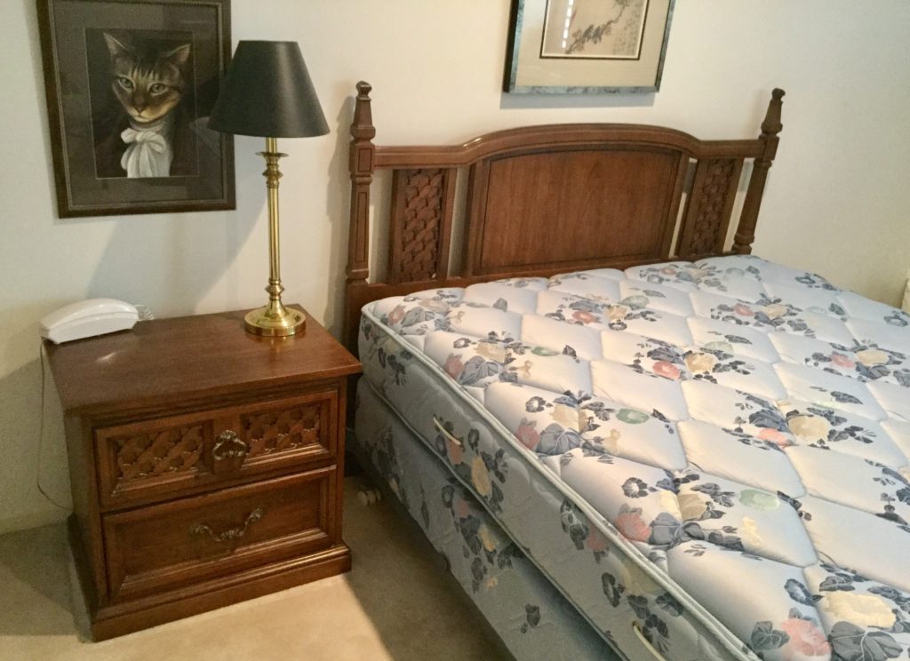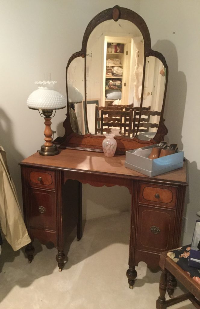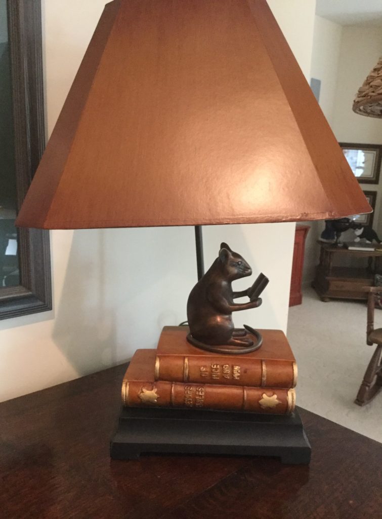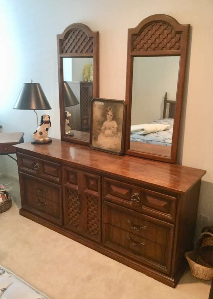Little secretary, antique vanity, Dixie bedroom set: headboard, dresser with mirrors, armoire and side table, lotsa nice lamps including the A Team fav: the mouse sitting on the books “Of Mice & Men”. Adorbs.