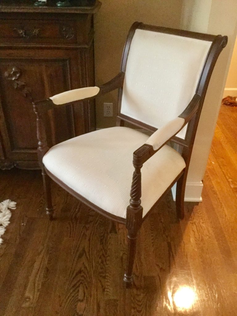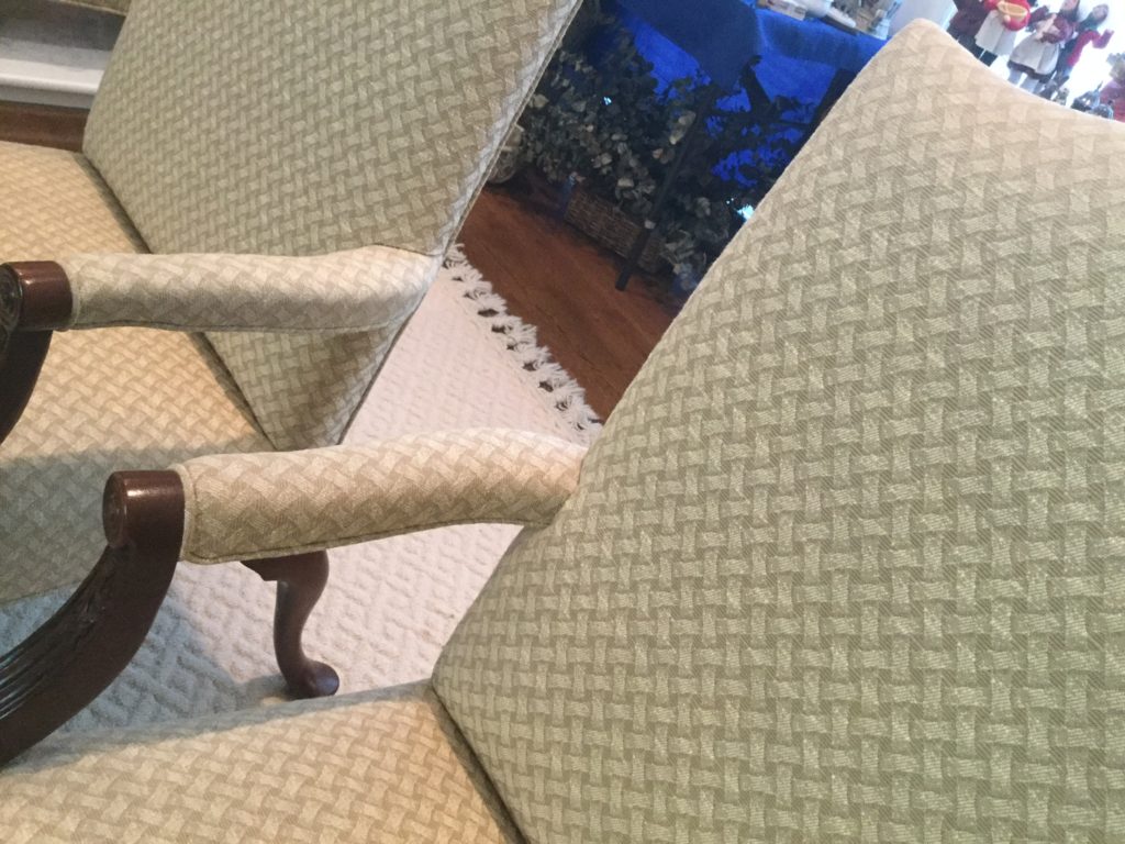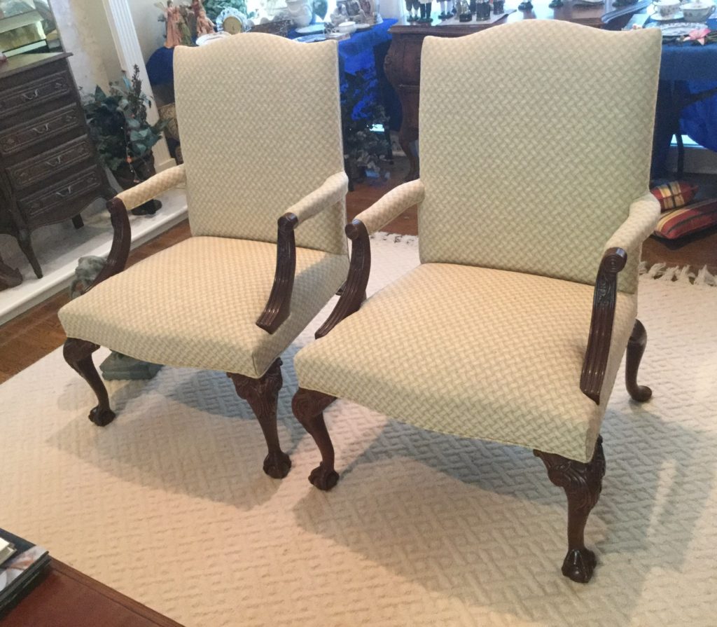 2 stunning and perfectly neutral eggshell Hickory armchairs, square wood coffee table, globe on wood stand …