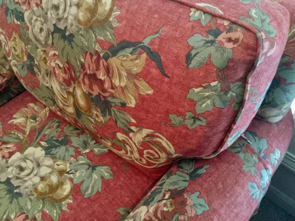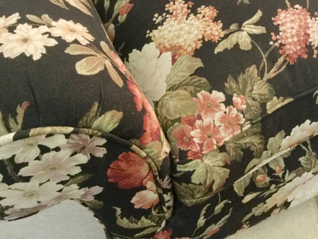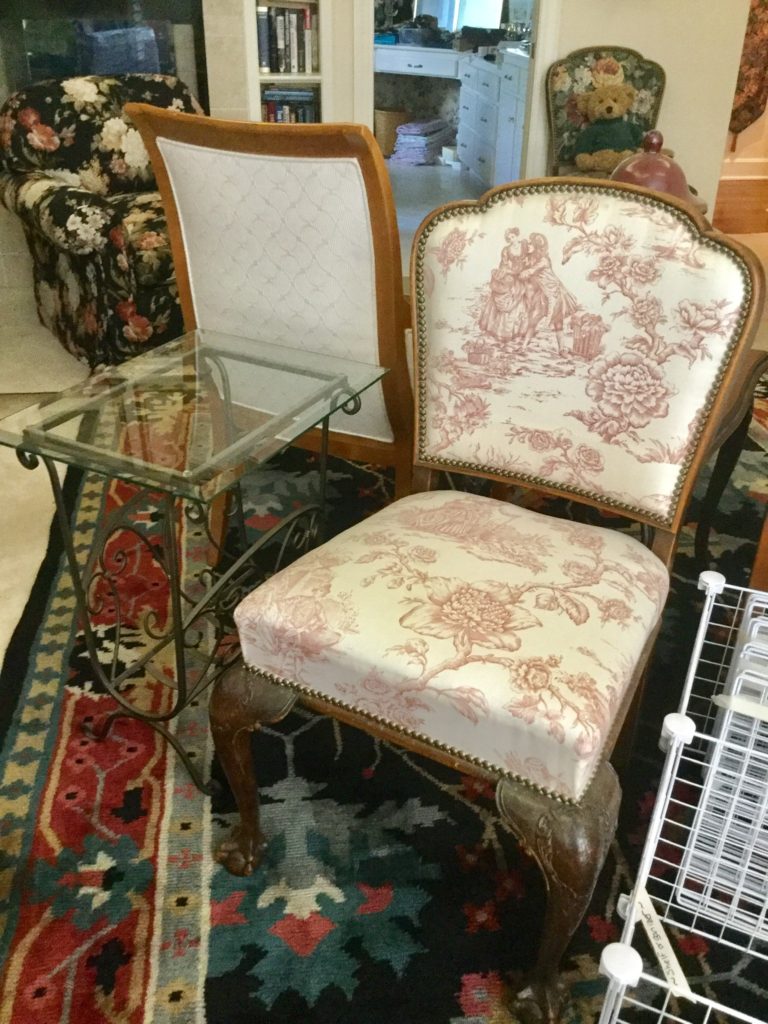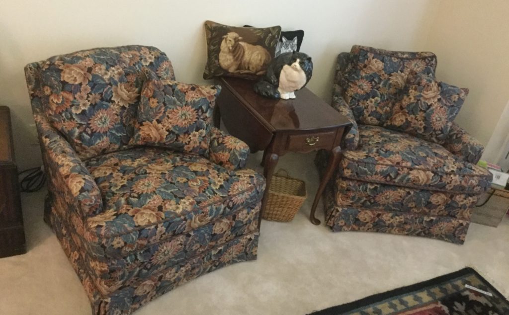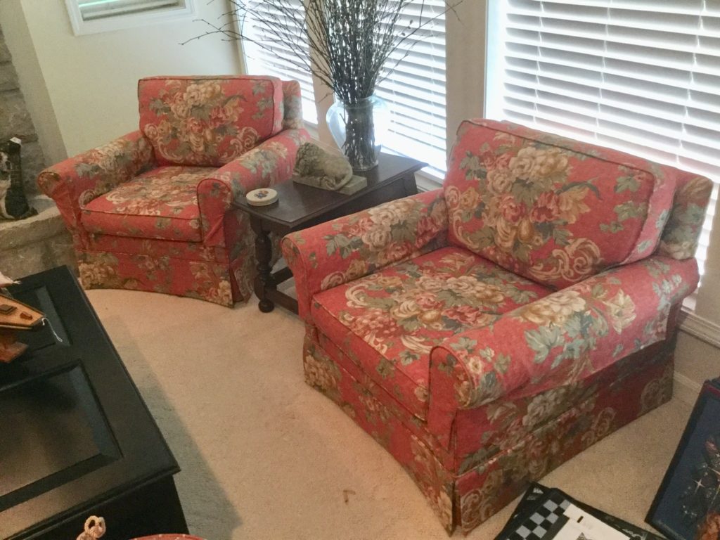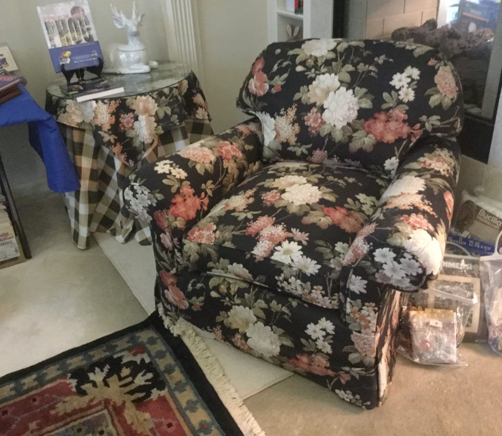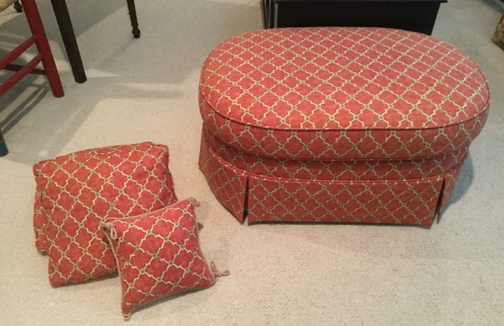 2 raspberry floral club chairs, many side tables, a raspberry/coral otto/stool with matching pillows, a black storage ‘coffee table?’ by British Traditions, though says Pottery Barn to me …
