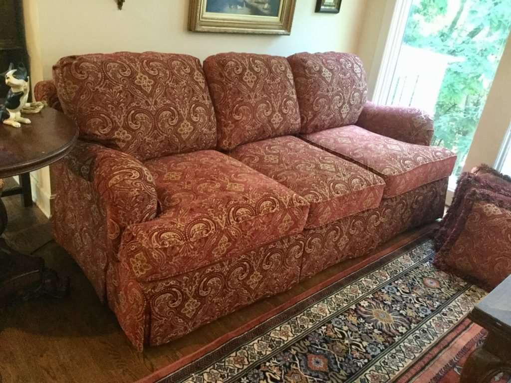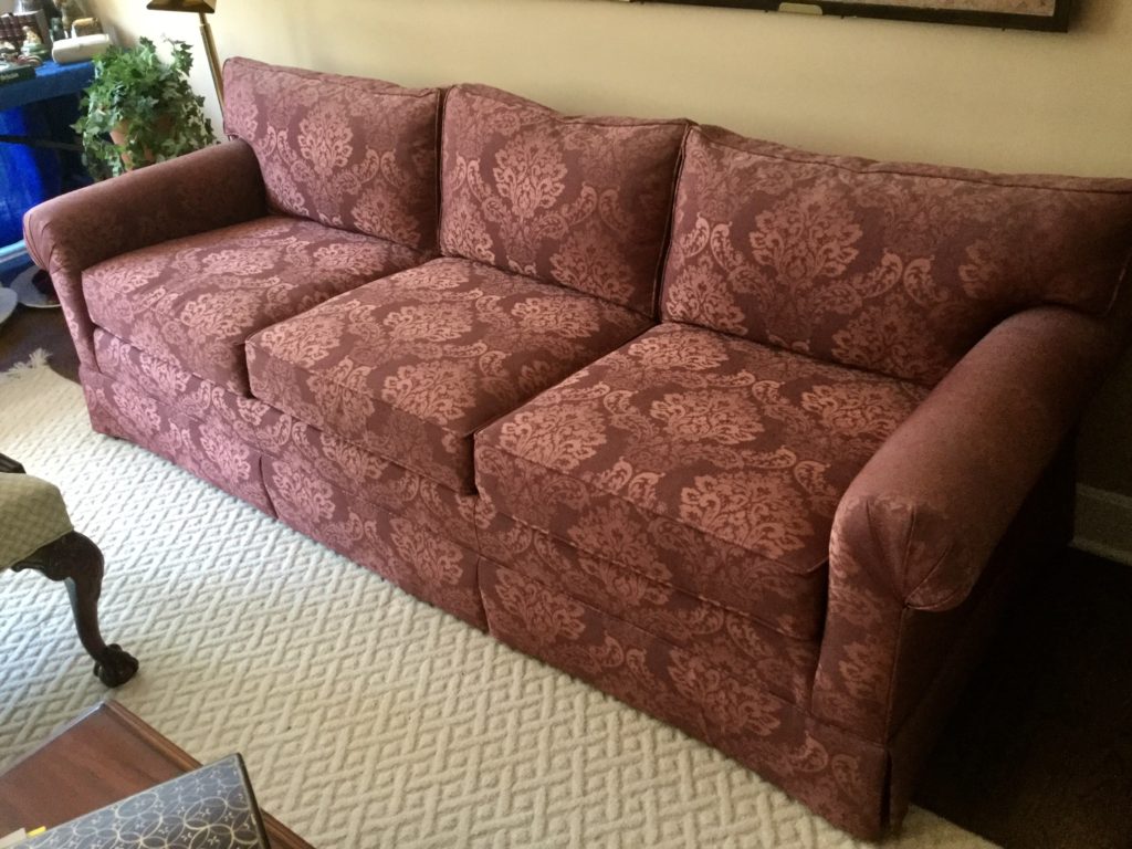Several sofas including a Massoud burgundy/tan that looks like it was just delivered, a perfectly blueclub chair with matching otto, hutch with beveled glass front, bottom storage and a sweet “wave” look plate rack …