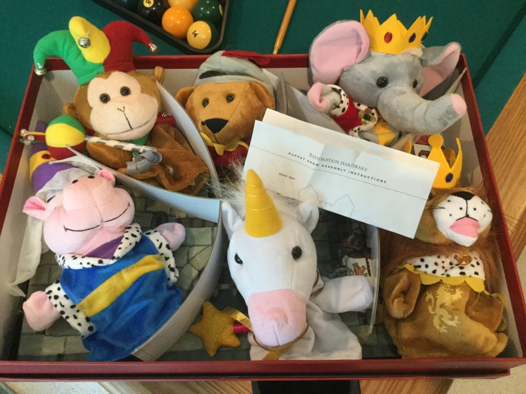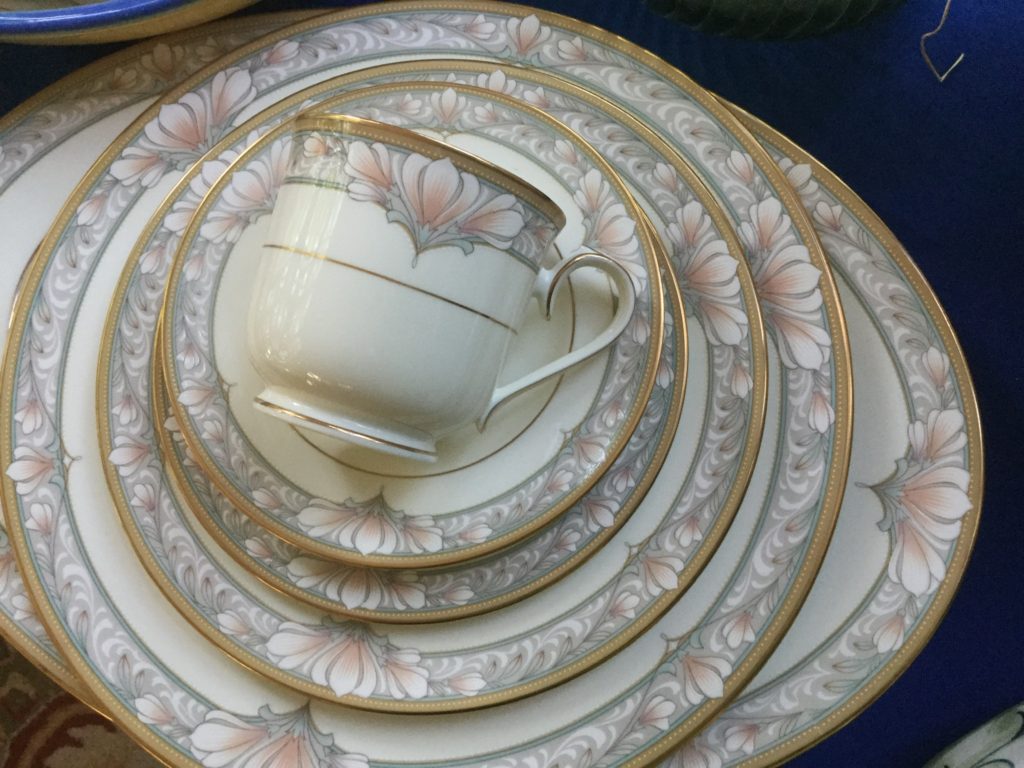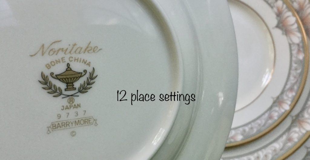 12 place settings of Noritake Barrymore china, many wine openers in boxes, nice selection of colognes, Restoration Hardware puppets in box …