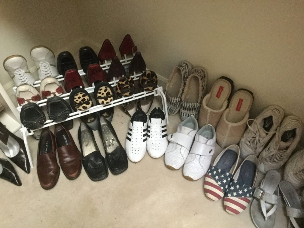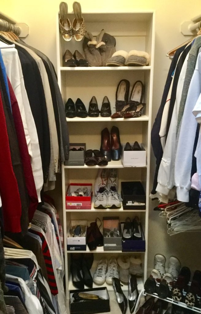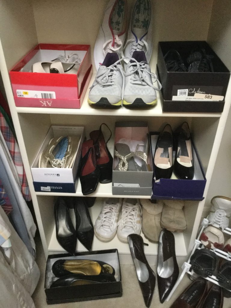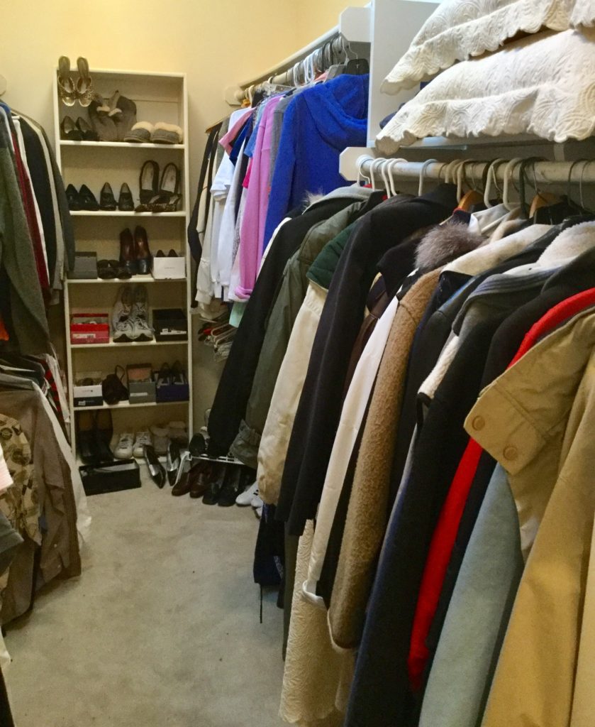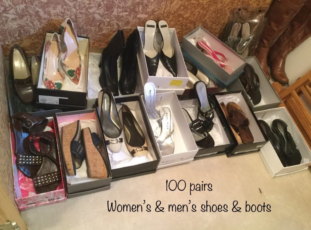 2 HUGE walk-in closets FULLfullFULL of nicenice women’s (sz 6-10) and men’s clothing (L-XL) – coats, jackets, dresses, dress-up dresses, KU jackets/coats, neckties, workout, suits lalala … and OVERRR 100 pairs of shoes and boots including newer Uggs, Cole Haan & Nike …