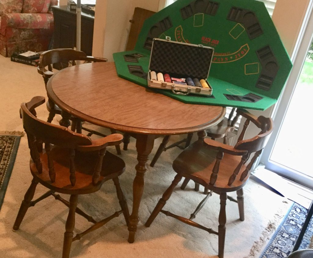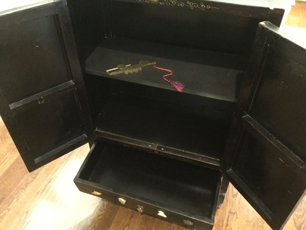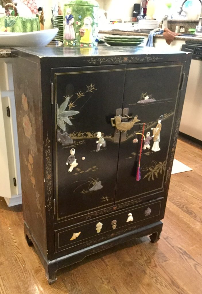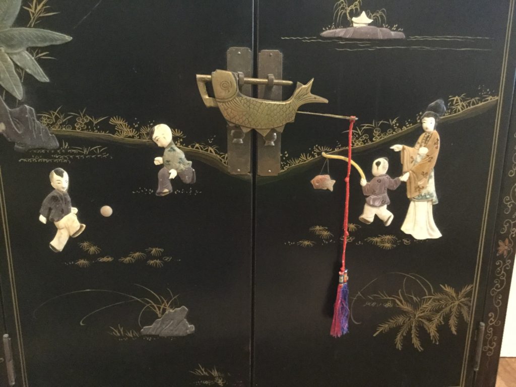 Precious black oriental cabinet with figurine detail, 2 sets of tables (one round, one square) with 4 chairs, poker table top, another antique sideboard …