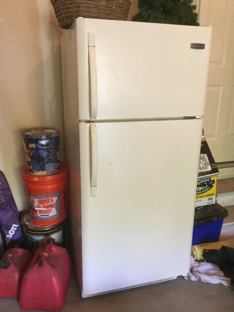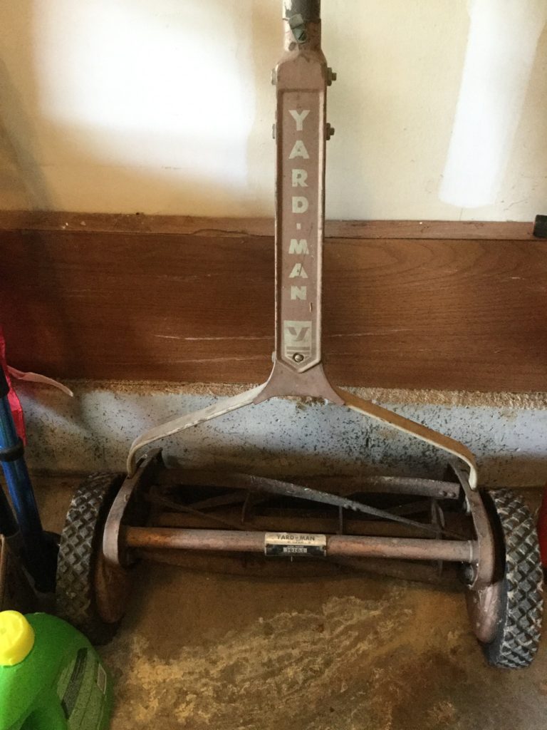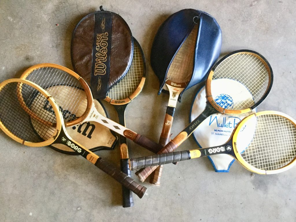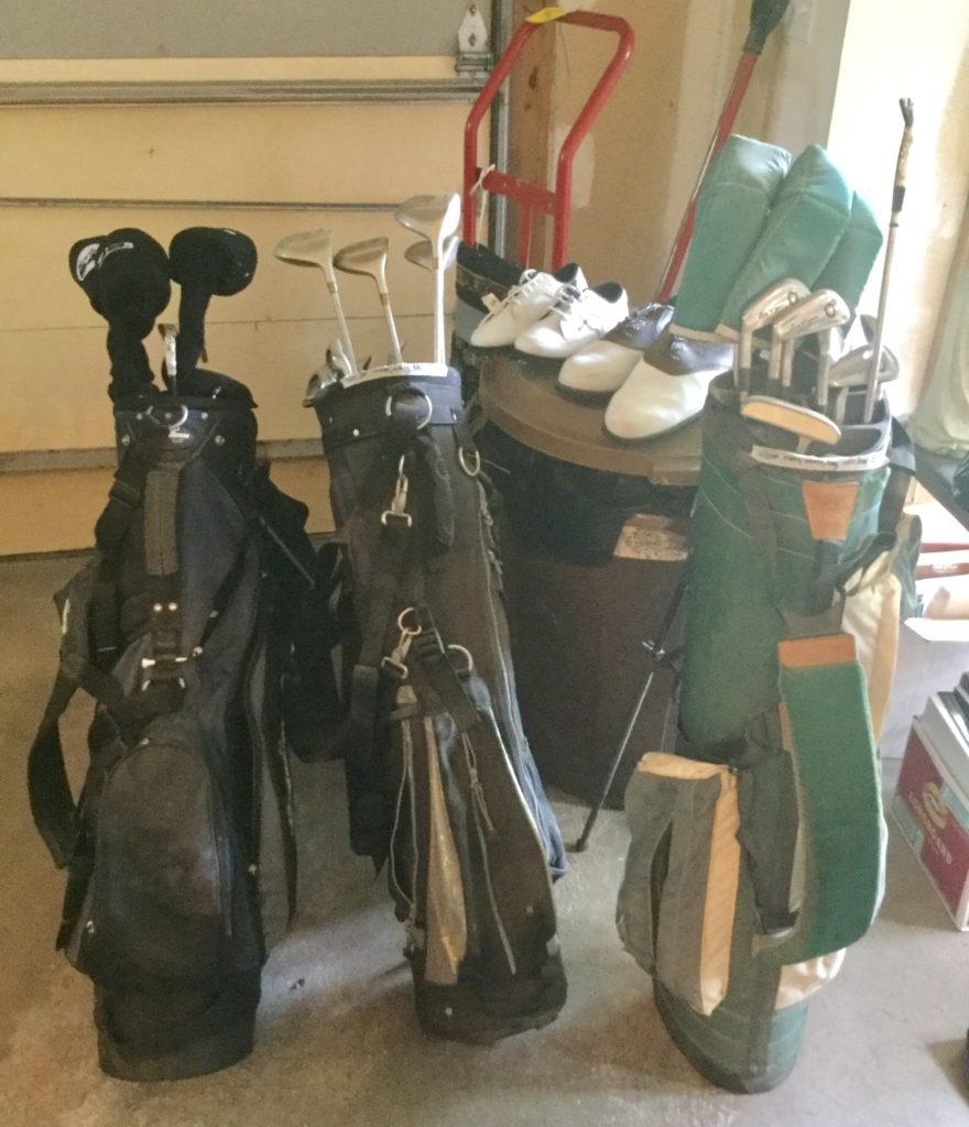 Many golf clubs (including some left hand irons), bags, golf shoes and balls, basic Frigidaire fridge, Yakima Mega Joe bicycle rack, many tennis rackets, vintage YardMan push mower …