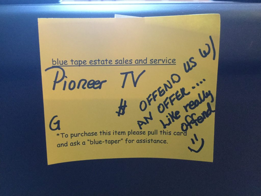 An Uber gargantuan massice Brobdingnagian Pioneer TV. Or, as we like to refer to them in the land of Blue Tape, a “boat anchor”. As it clearlystates on the ticket: “offend us with an offer … like really offend” and it can be yours :)!