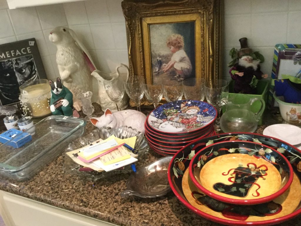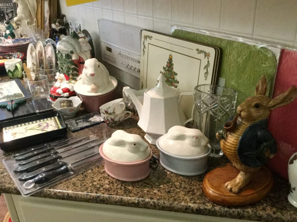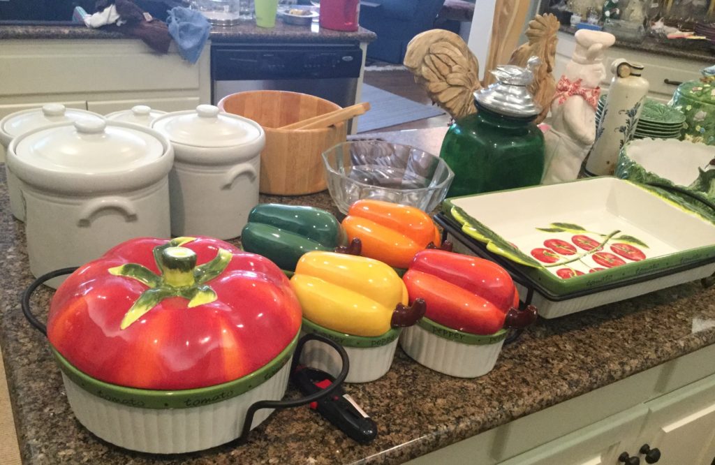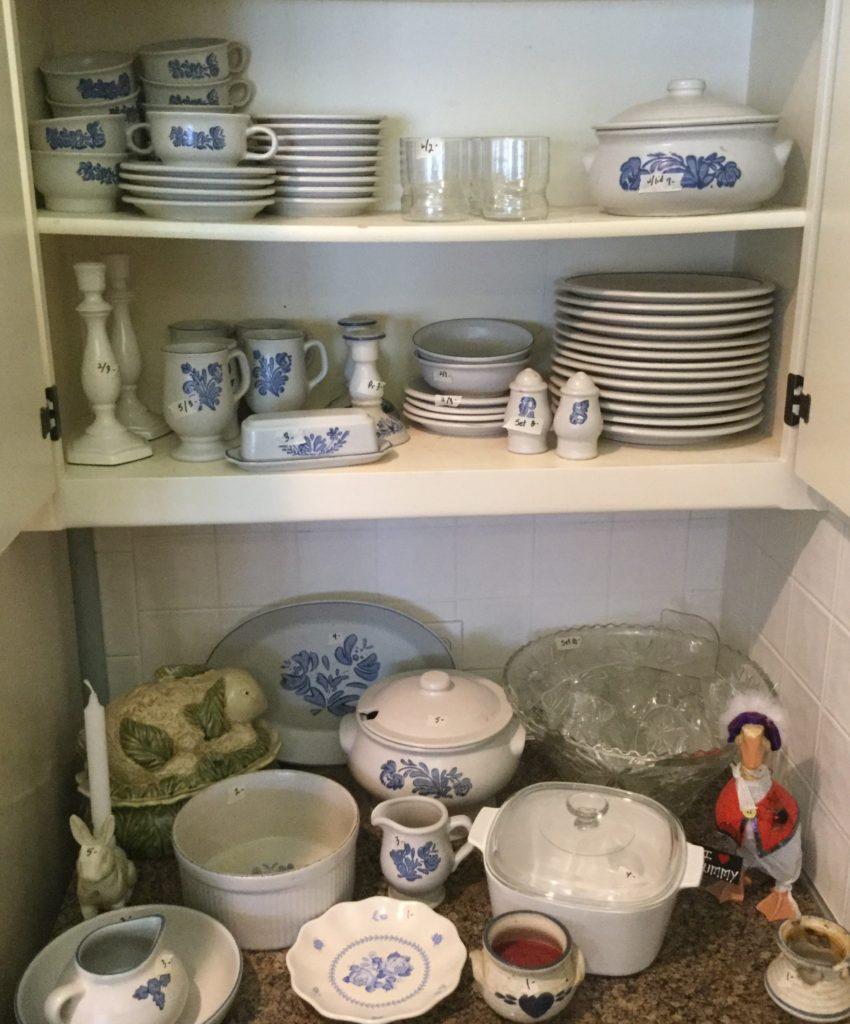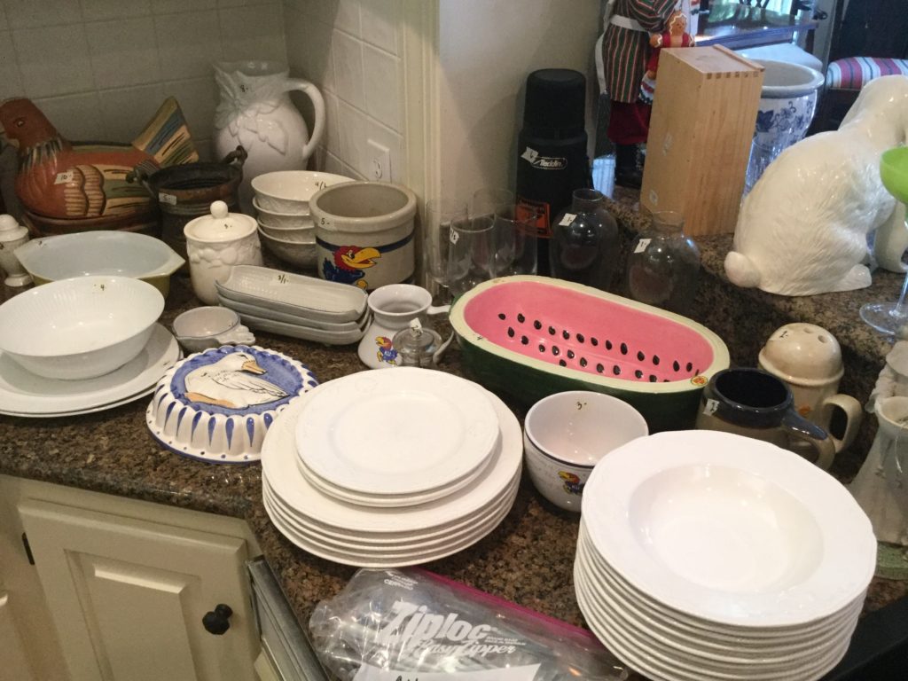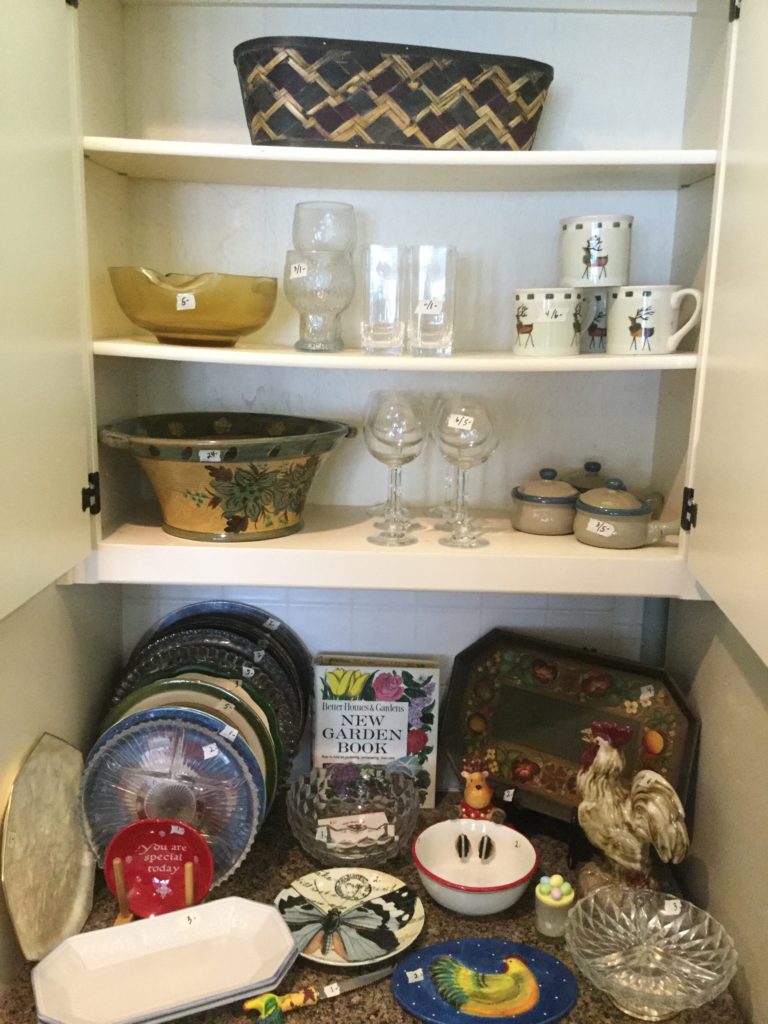 Great kitchen selection: glassware and dishes, Royal Staffordshire blue/white, white dishes, serv pieces, pots/pans, large selection of Pfaltzgraff, cannisters, green dishes, roosters, cookbooks, small appliances, baskets …