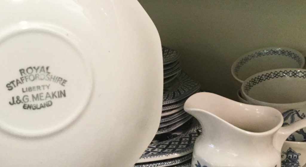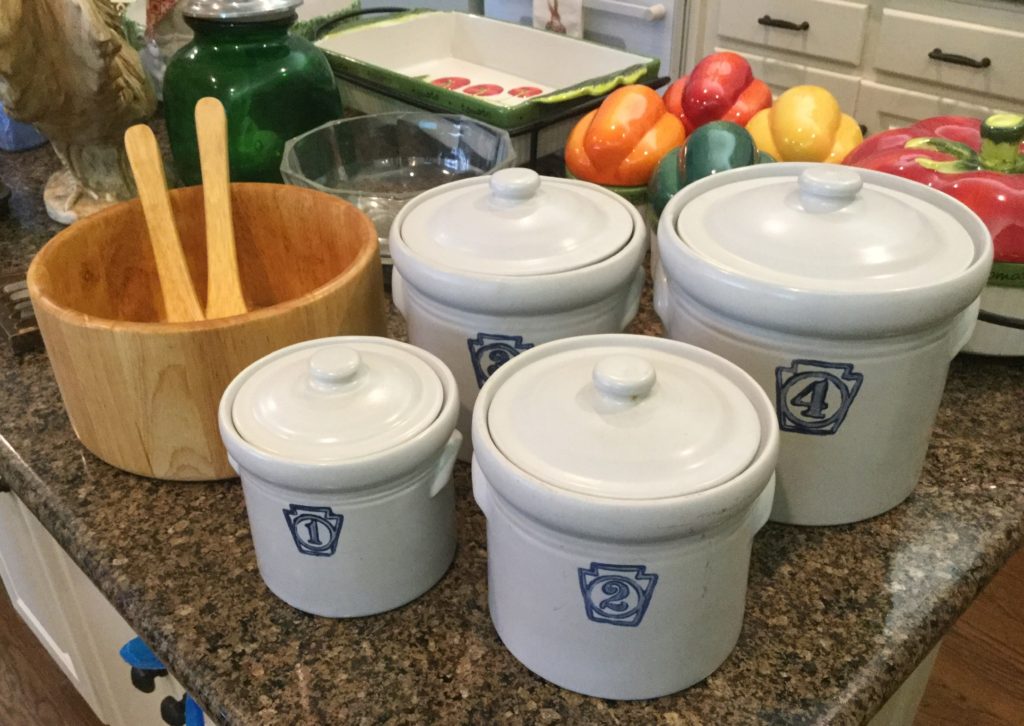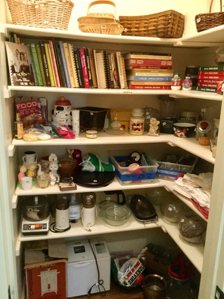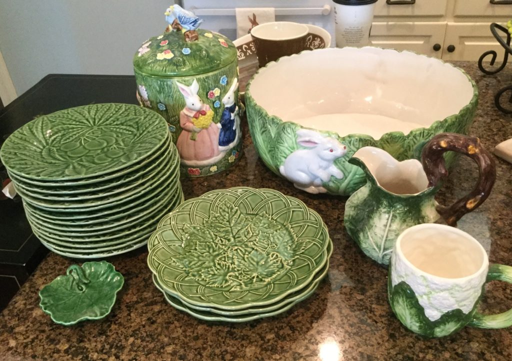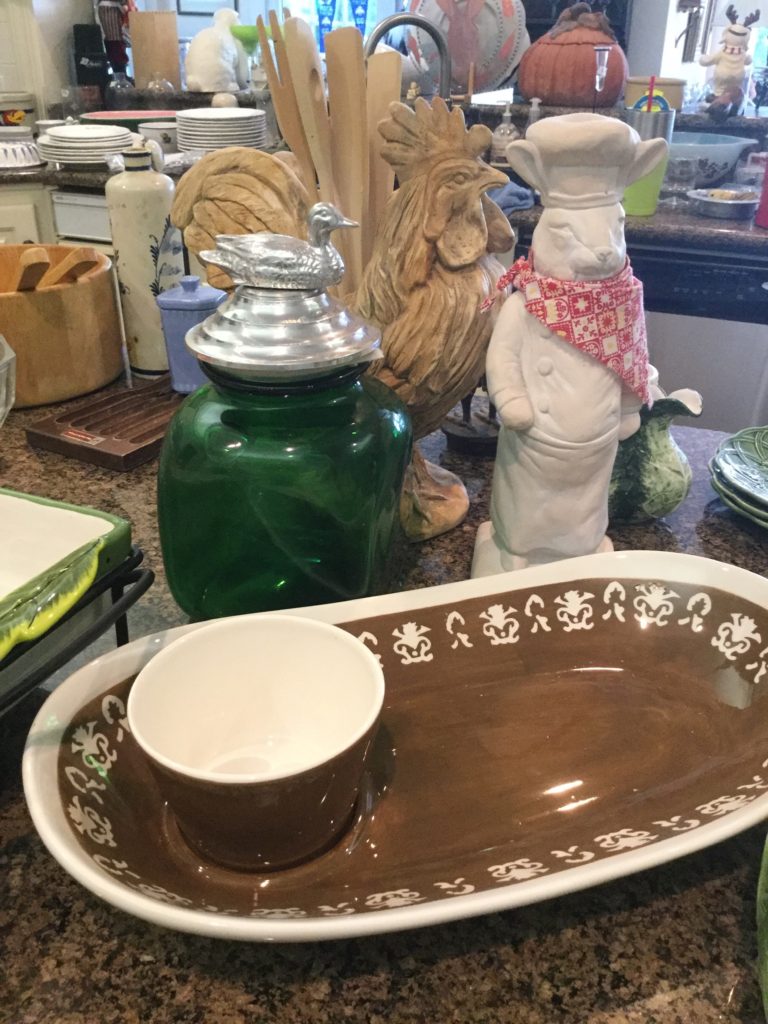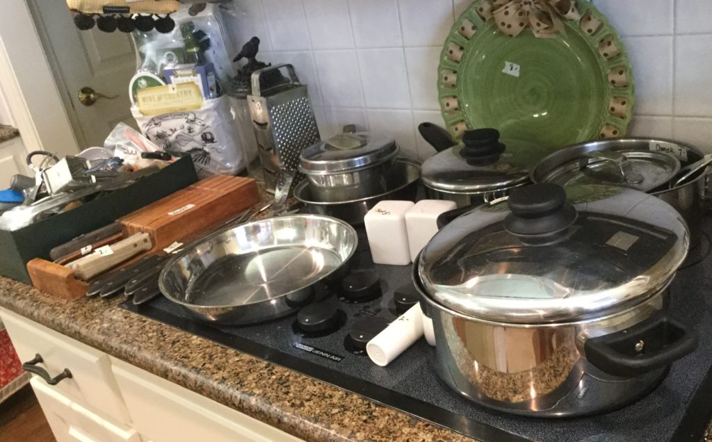 Great kitchen selection: glassware and dishes, Royal Staffordshire blue/white, white dishes, serv pieces, pots/pans, large selection of Pfaltzgraff, cannisters, green dishes, roosters, cookbooks, small appliances, baskets …