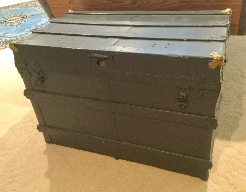 John T. Barnum Steamer Trunk, set of 4 flamestitch chairs, albums, good selection of costume jewelry, AgriFab heavy duty wheelbarrow …
