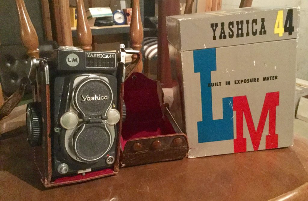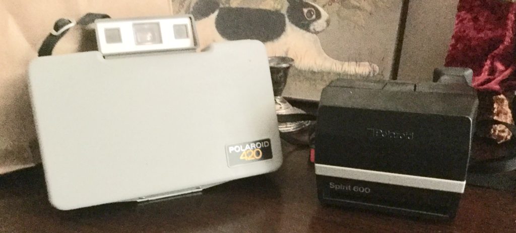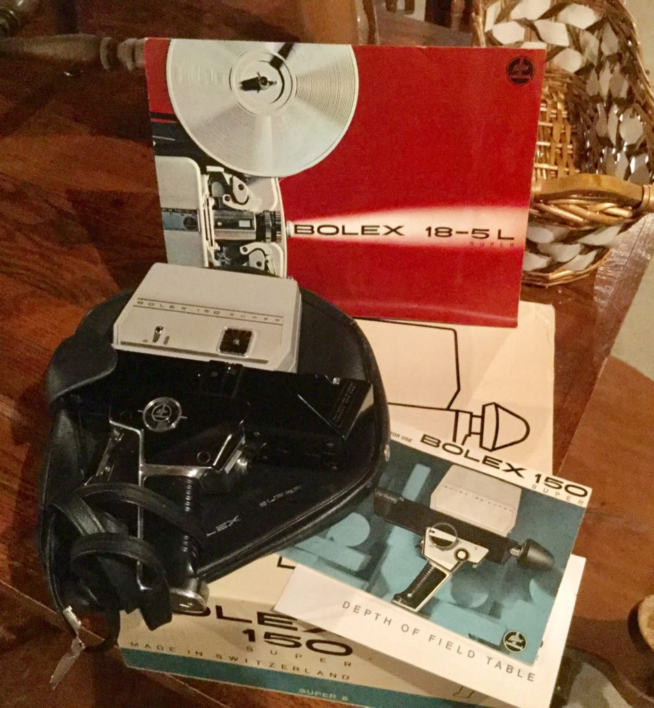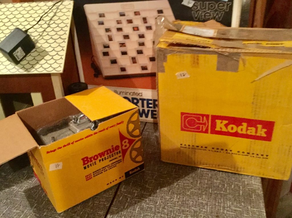 Fun selection of old cameras and misc including, Polaroid 420, Polaroid Spirit 600, a Brownie camera, Minolta 35mm, Brownie movie projector, Yashica LM camera, Bolex 150, a few slide carousels …