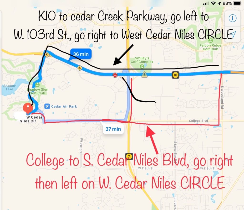 Go 435 West to K10 and off K10 take either S. Woodland Road or Hwy 7 South to College – go right down to S. Cedar Niles BLVD. Go right about 4 blocks-ish to W. Cedar Niles CIRCLEand turn left down to home (about 3 blocks).